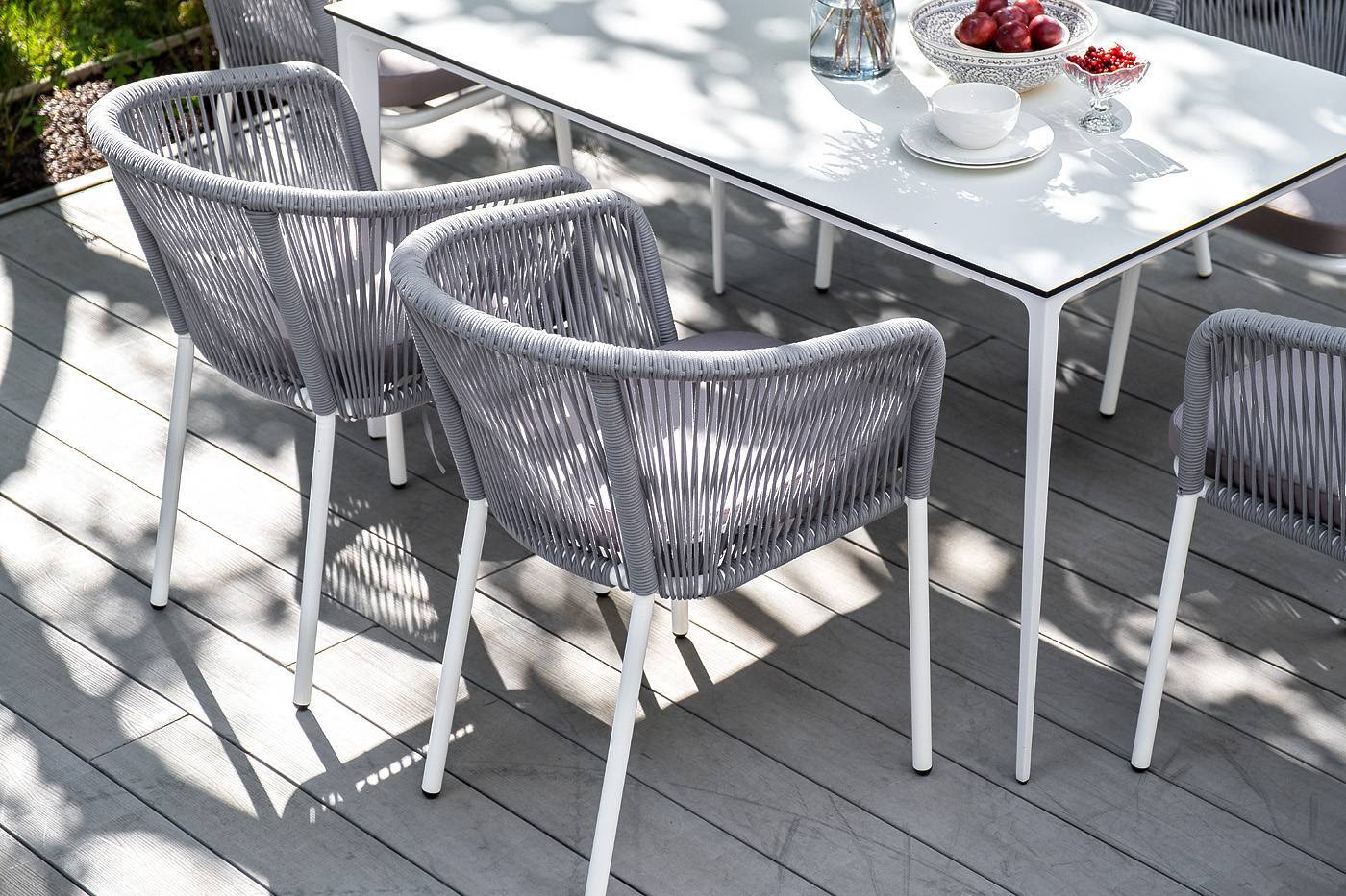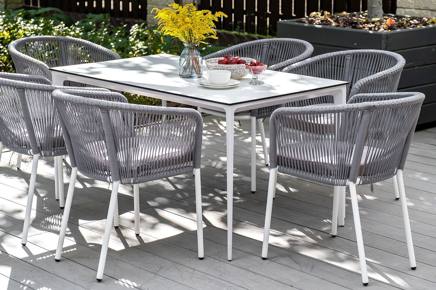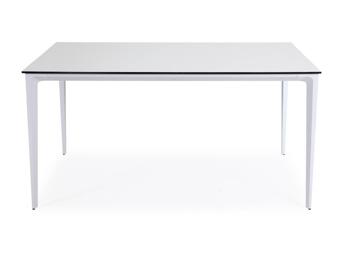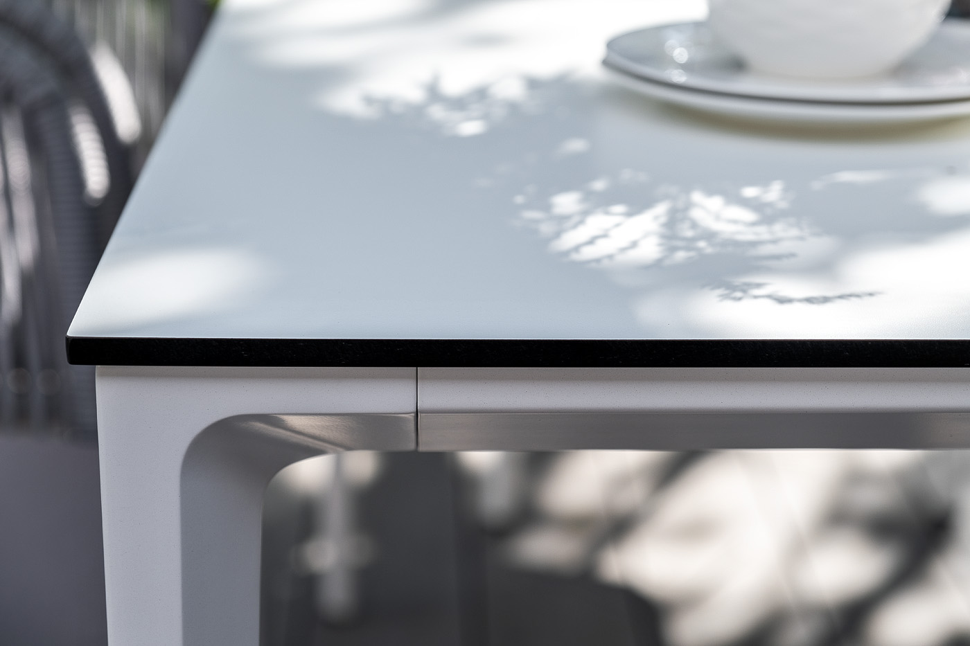 Столешница выполнена из современного высококачественного монолитного компакт-пластик HPL, толщиной 12 мм в молочном цветом. Материал устойчив к высоким температурам, попаданию влаги и может использоваться при любых погодных условиях. Подстолье изготовлено из крашеного алюминия белого цвета.