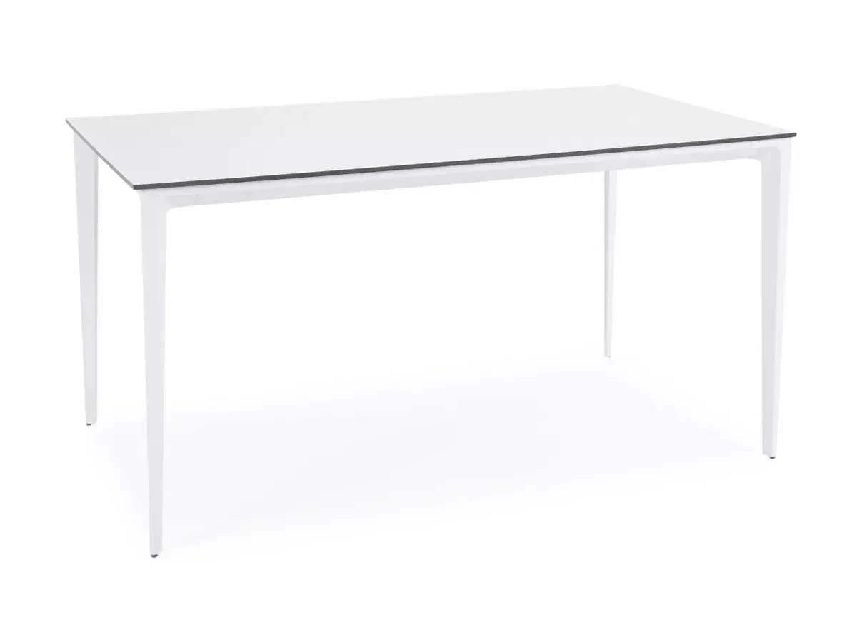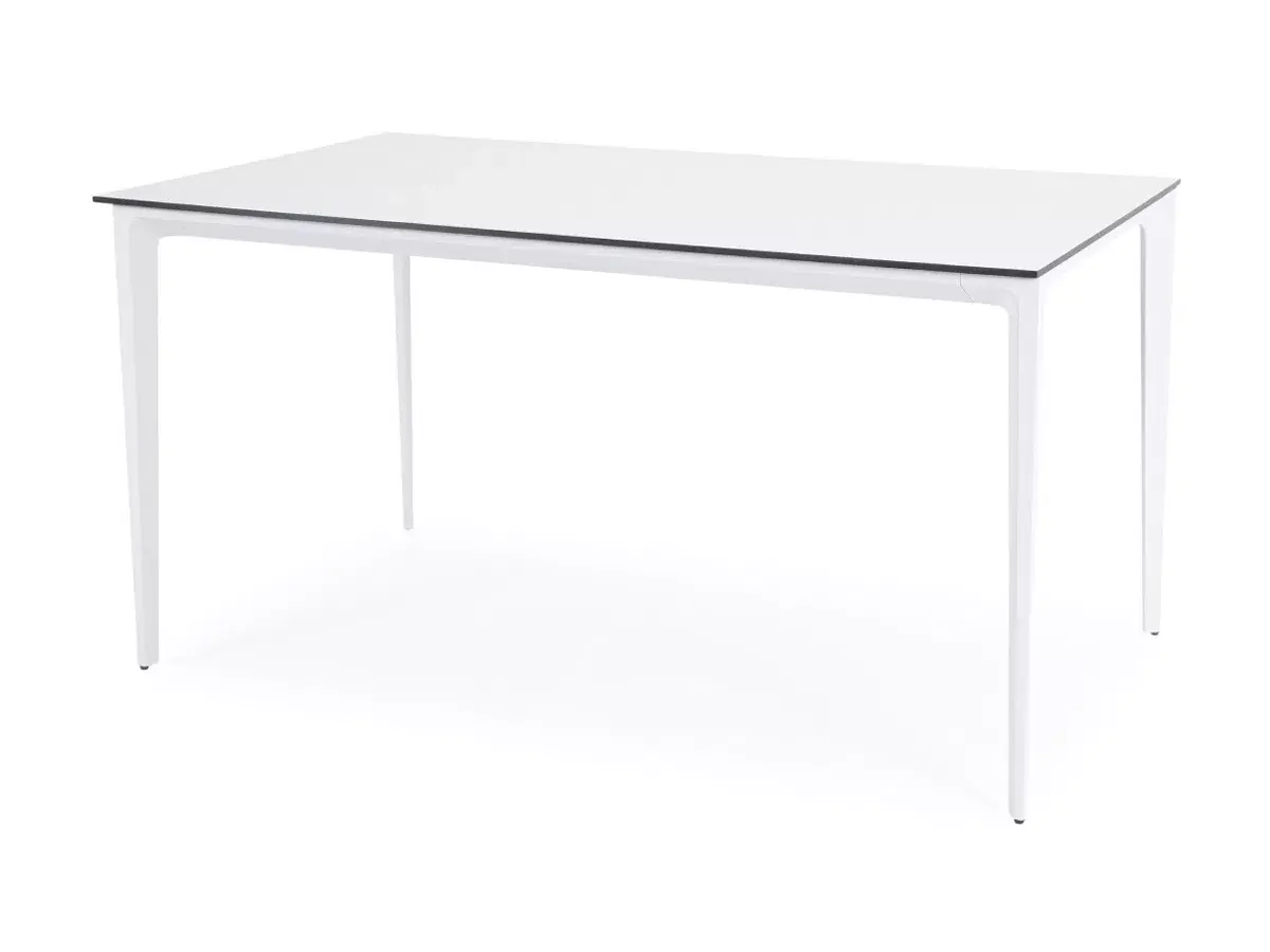 Столешница выполнена из современного высококачественного монолитного компакт-пластик HPL, толщиной 12 мм в молочном цветом. Материал устойчив к высоким температурам, попаданию влаги и может использоваться при любых погодных условиях. Подстолье изготовлено из крашеного алюминия белого цвета.