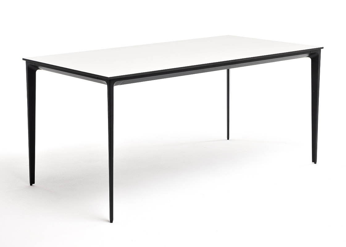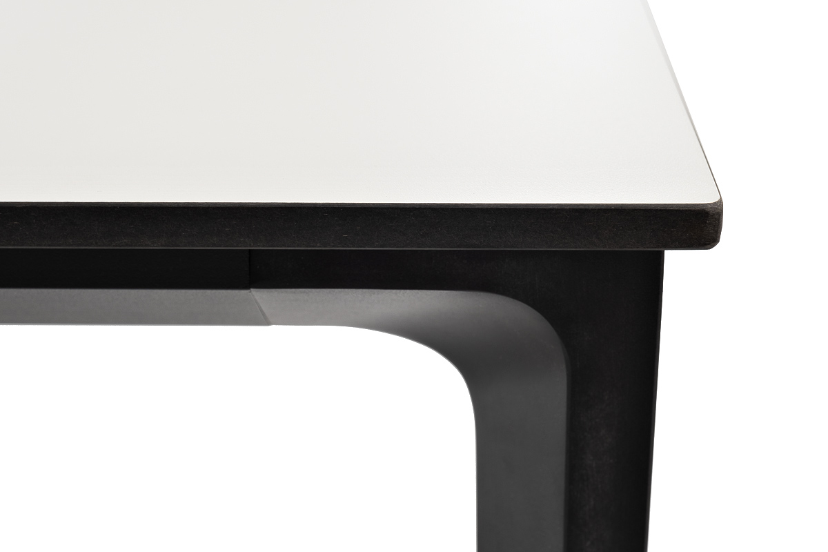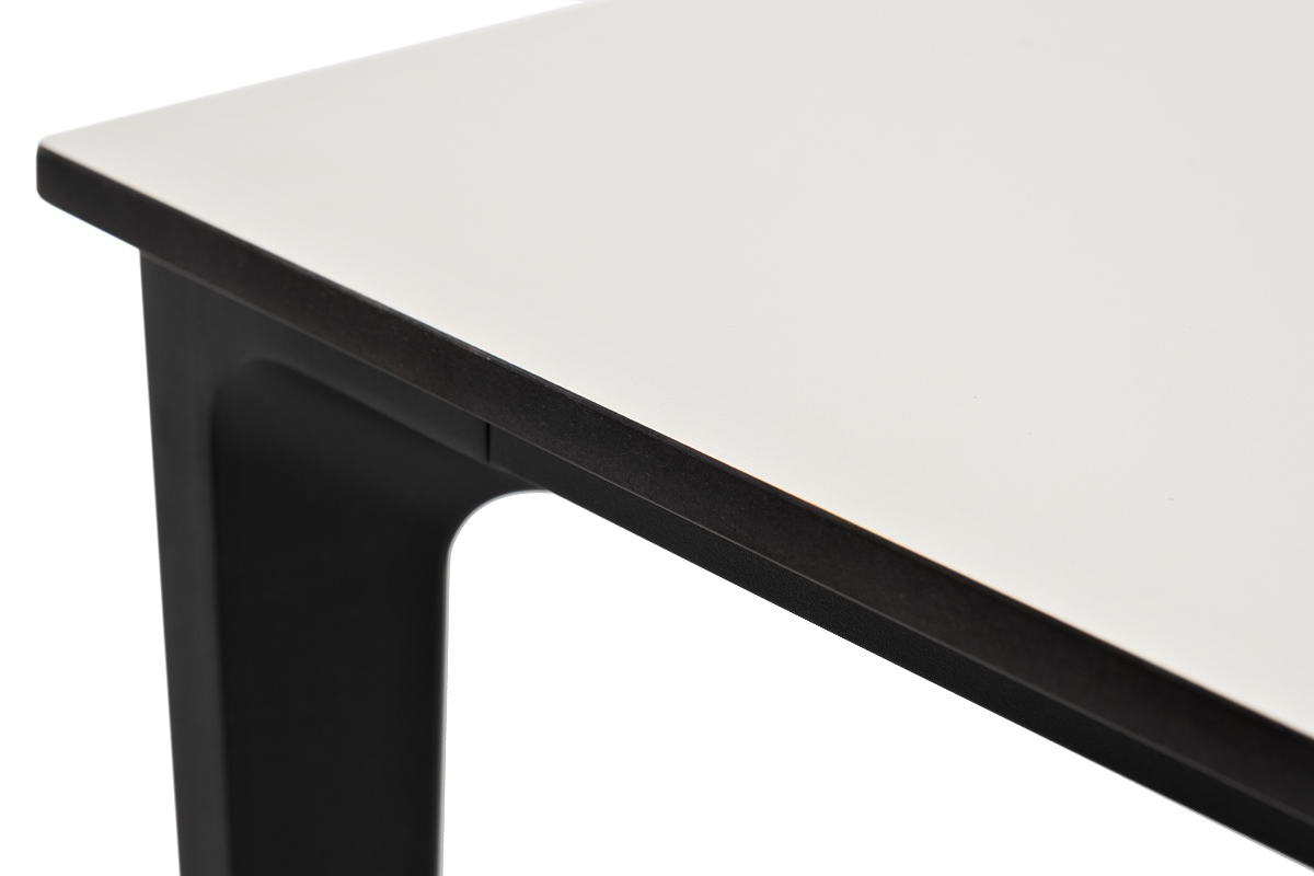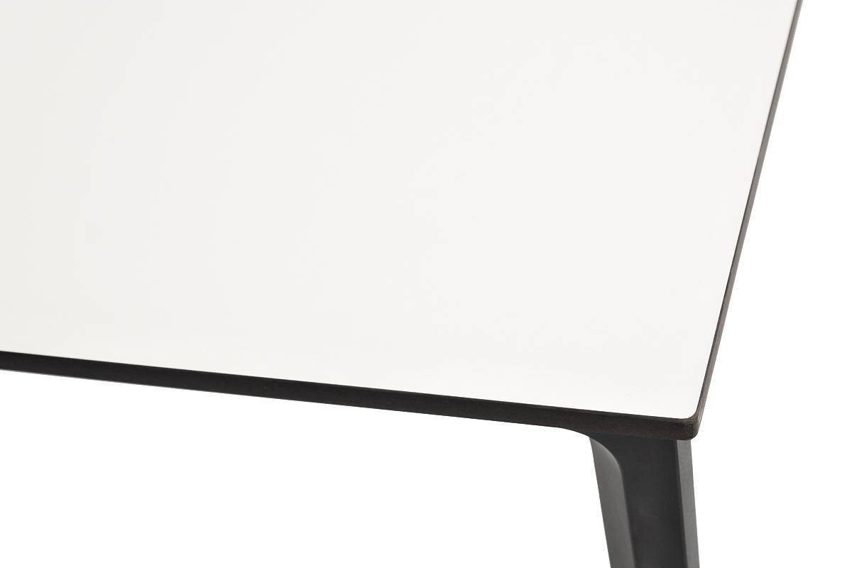 Столешница выполнена из современного высококачественного монолитного компакт-пластик HPL, толщиной 12 мм в молочном цветом. Материал устойчив к высоким температурам, попаданию влаги и может использоваться при любых погодных условиях. Подстолье изготовлено из крашеного алюминия черного цвета.