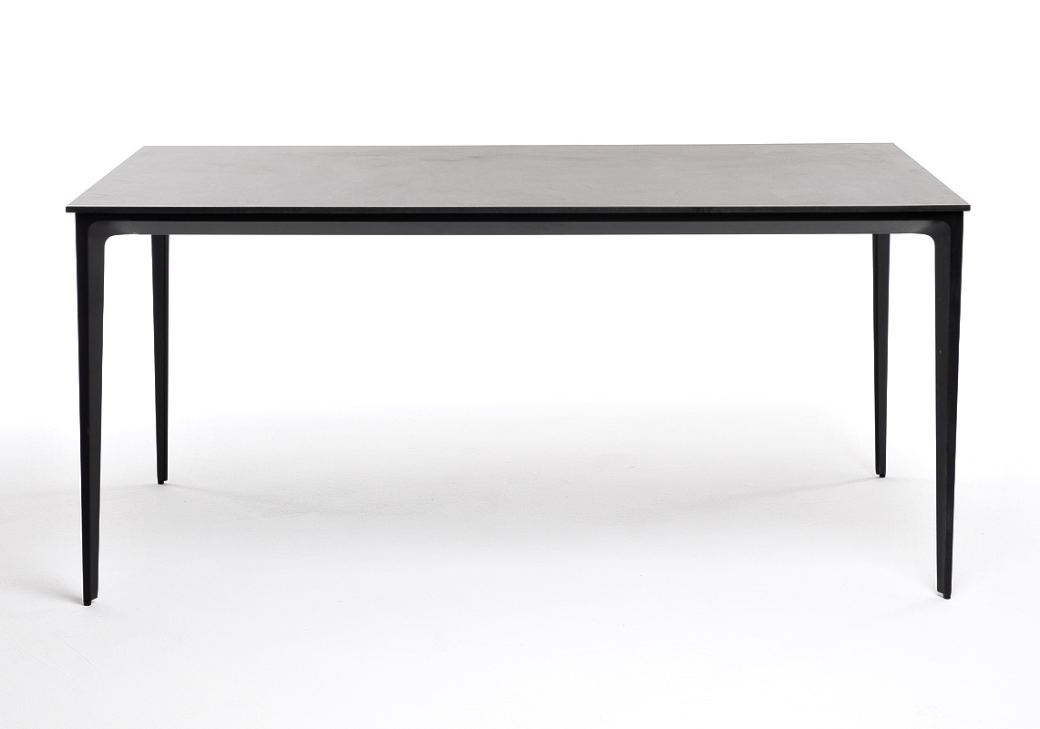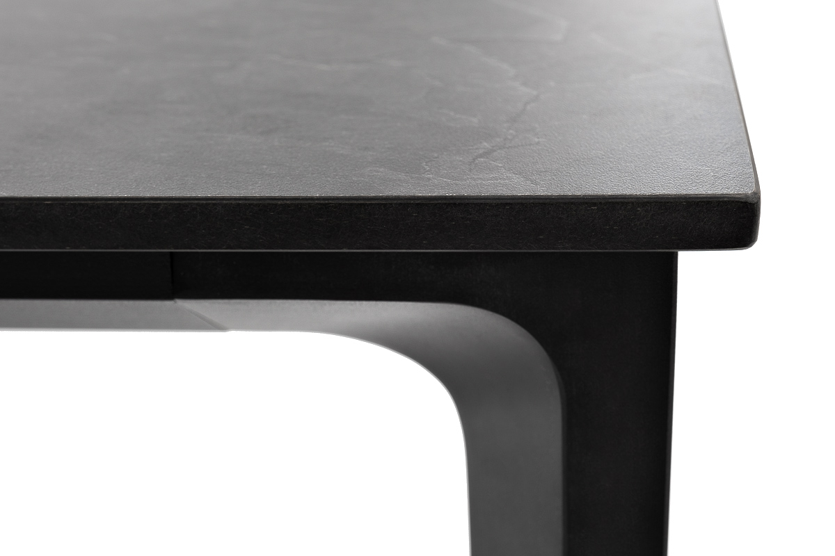 Столешница выполнена из современного высококачественного монолитного компакт-пластик HPL, толщиной 12 мм в цвете «серый гранит». Материал устойчив к высоким температурам, попаданию влаги и может использоваться при любых погодных условиях. Подстолье изготовлено из крашеного алюминия черного цвета.