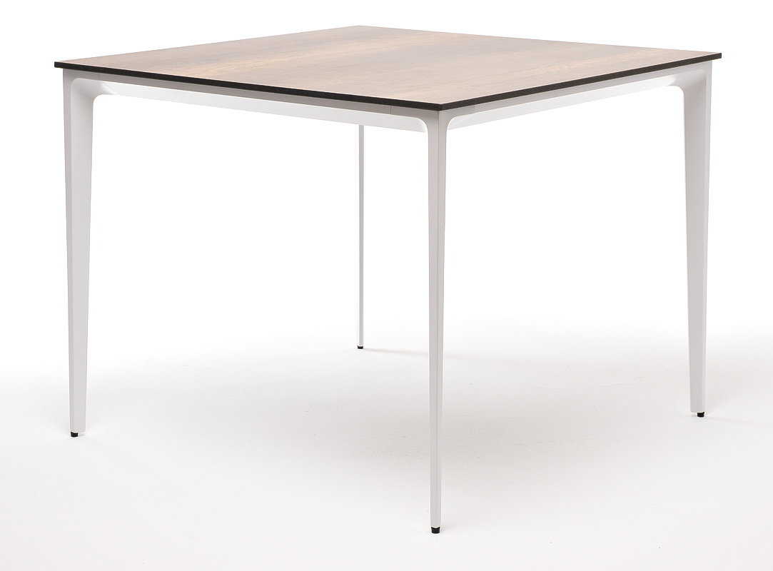 Столешница выполнена из современного высококачественного монолитного компакт-пластик HPL, толщиной 12 мм в цвете «дуб». Материал устойчив к высоким температурам, попаданию влаги и может использоваться при любых погодных условиях. Подстолье изготовлено из крашеного алюминия белого цвета.