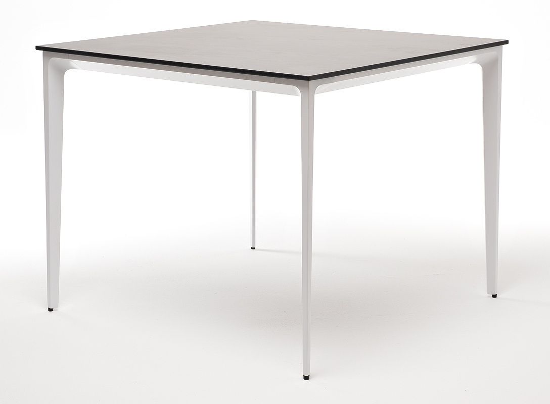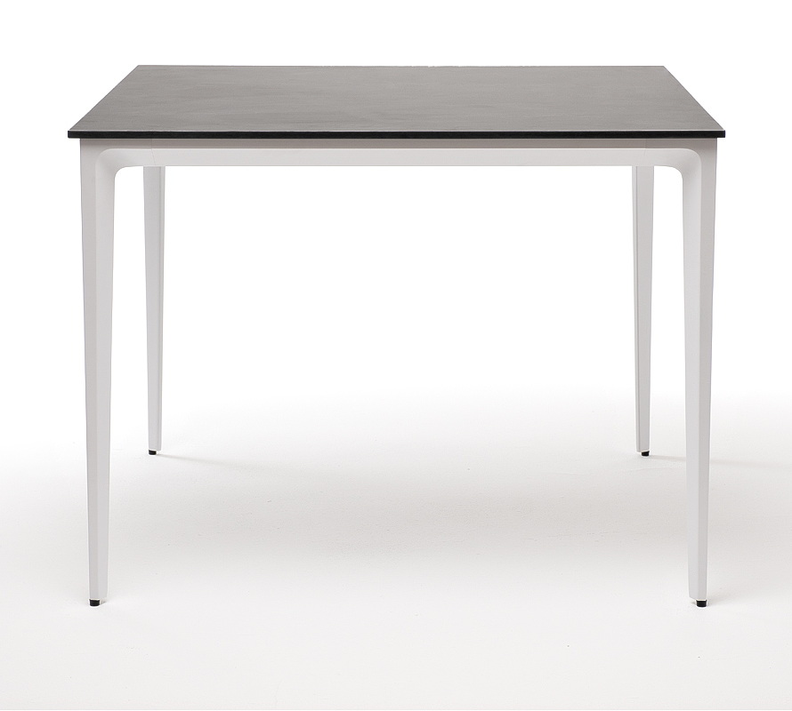 Столешница выполнена из современного высококачественного монолитного компакт-пластик HPL, толщиной 12 мм в цвете «серый гранит». Материал устойчив к высоким температурам, попаданию влаги и может использоваться при любых погодных условиях. Подстолье изготовлено из крашеного алюминия белого цвета.