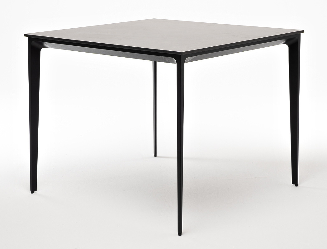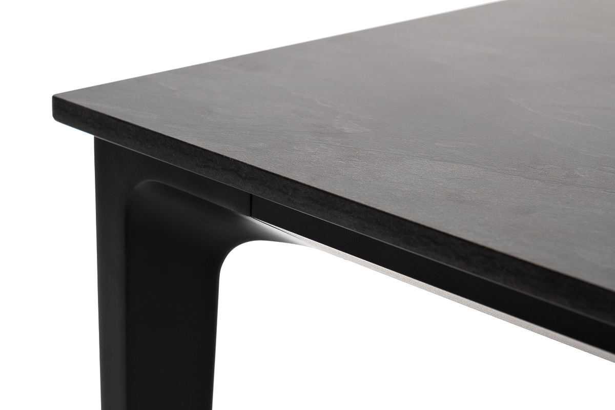 Столешница выполнена из современного высококачественного монолитного компакт-пластик HPL, толщиной 12 мм в цвете «серый гранит». Материал устойчив к высоким температурам, попаданию влаги и может использоваться при любых погодных условиях. Подстолье изготовлено из крашеного алюминия черного цвета.