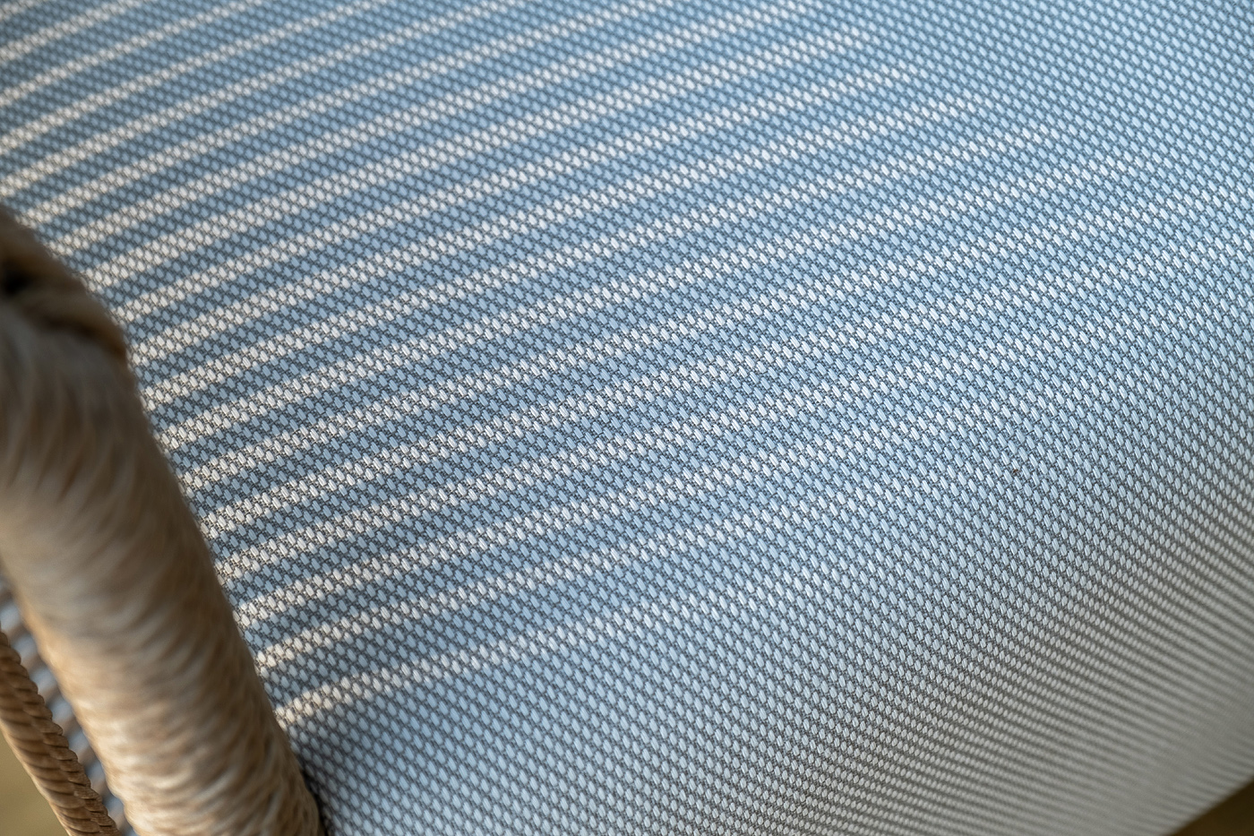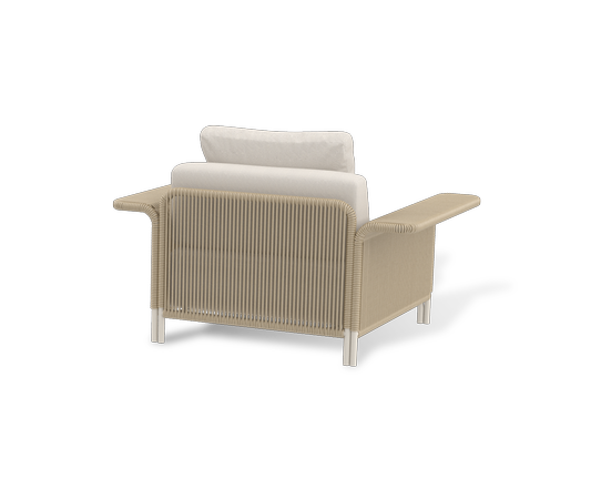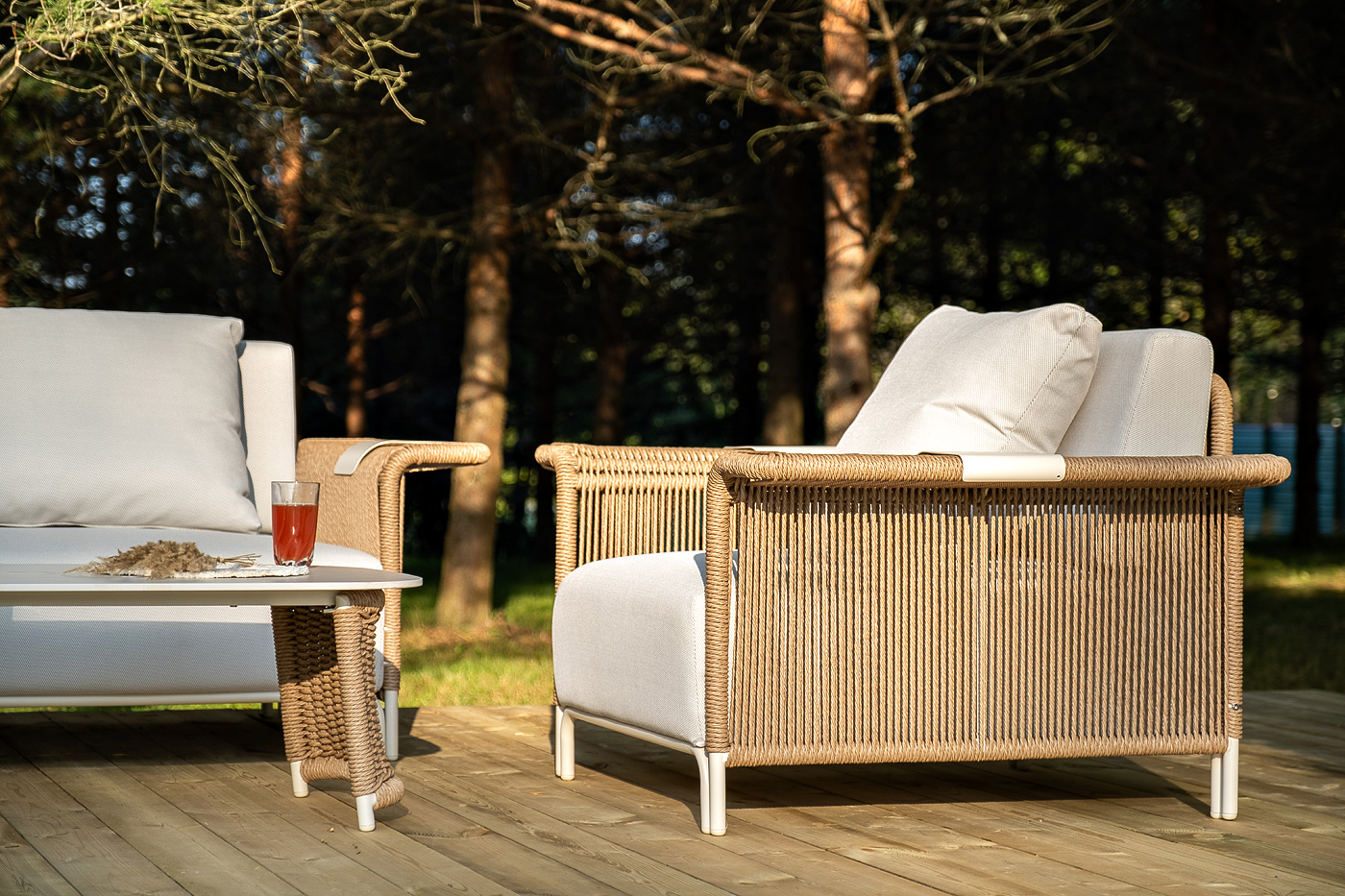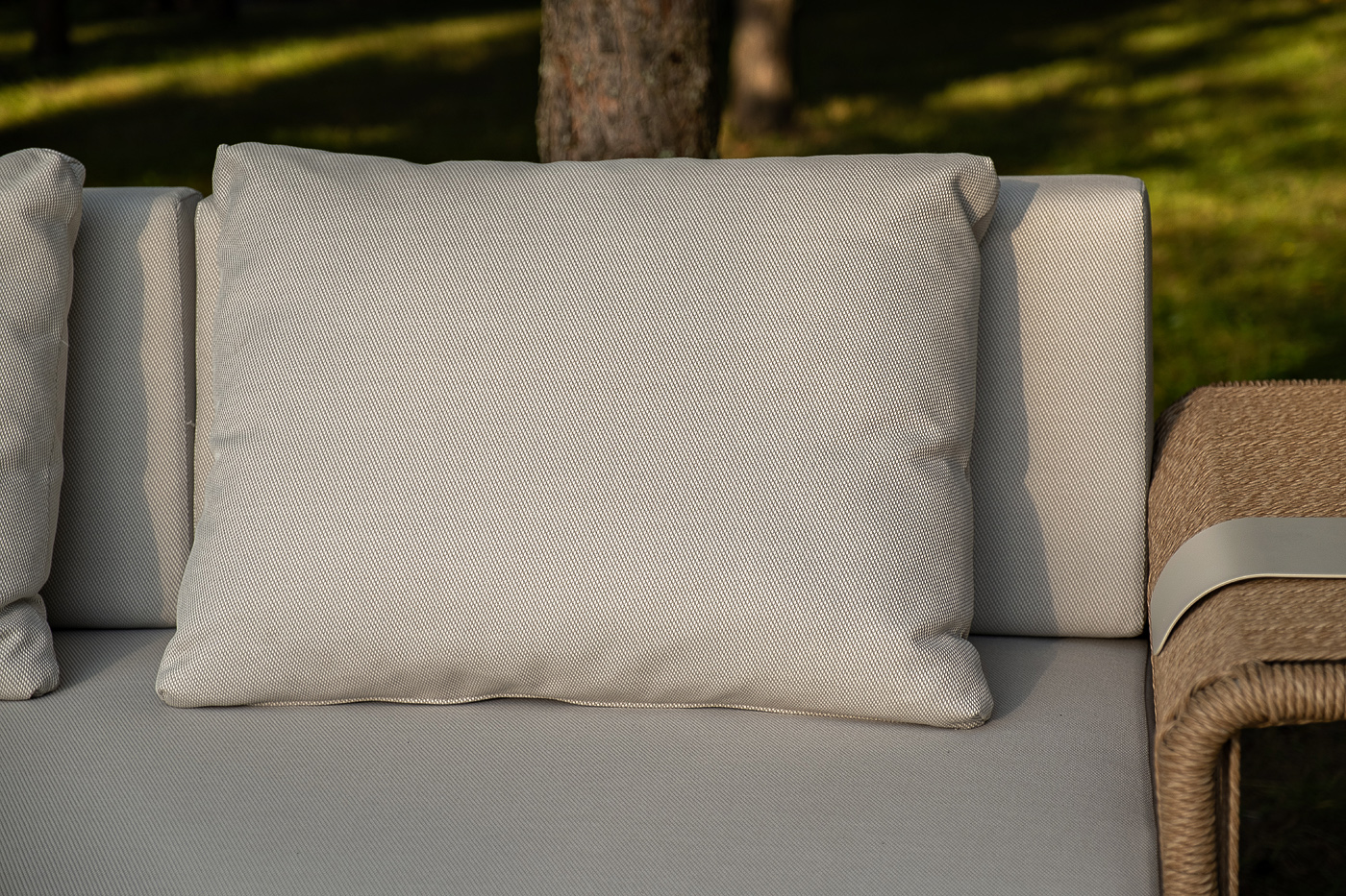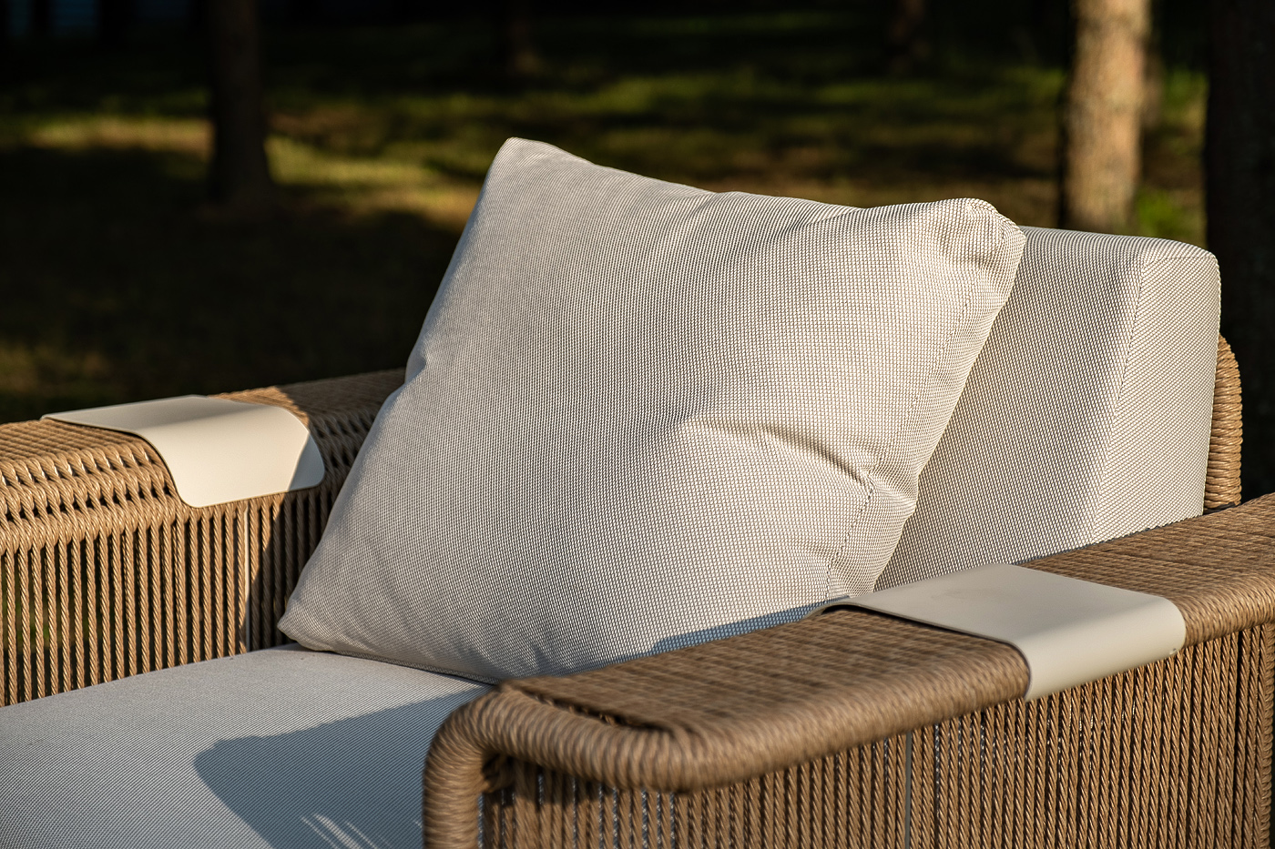 Укомплектовано плетеное кресло удобными мягкими подушками, одна из которых располагается в области спинки. Они выполнены в бежевом оттенке. При пошиве тканевых изделий используется 100% полиэстер, плотностью 300гр/м2. Он в обязательном порядке проходит обработку влагоотталкивающей пропиткой.