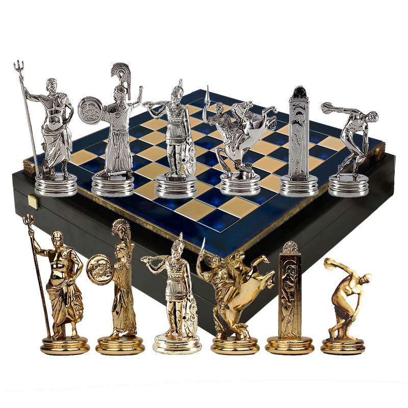 Шахматный набор "Олимпийские Игры" (син. с золотом. мет. доска 36х36, дер. короб, фигуры золото/серебро)