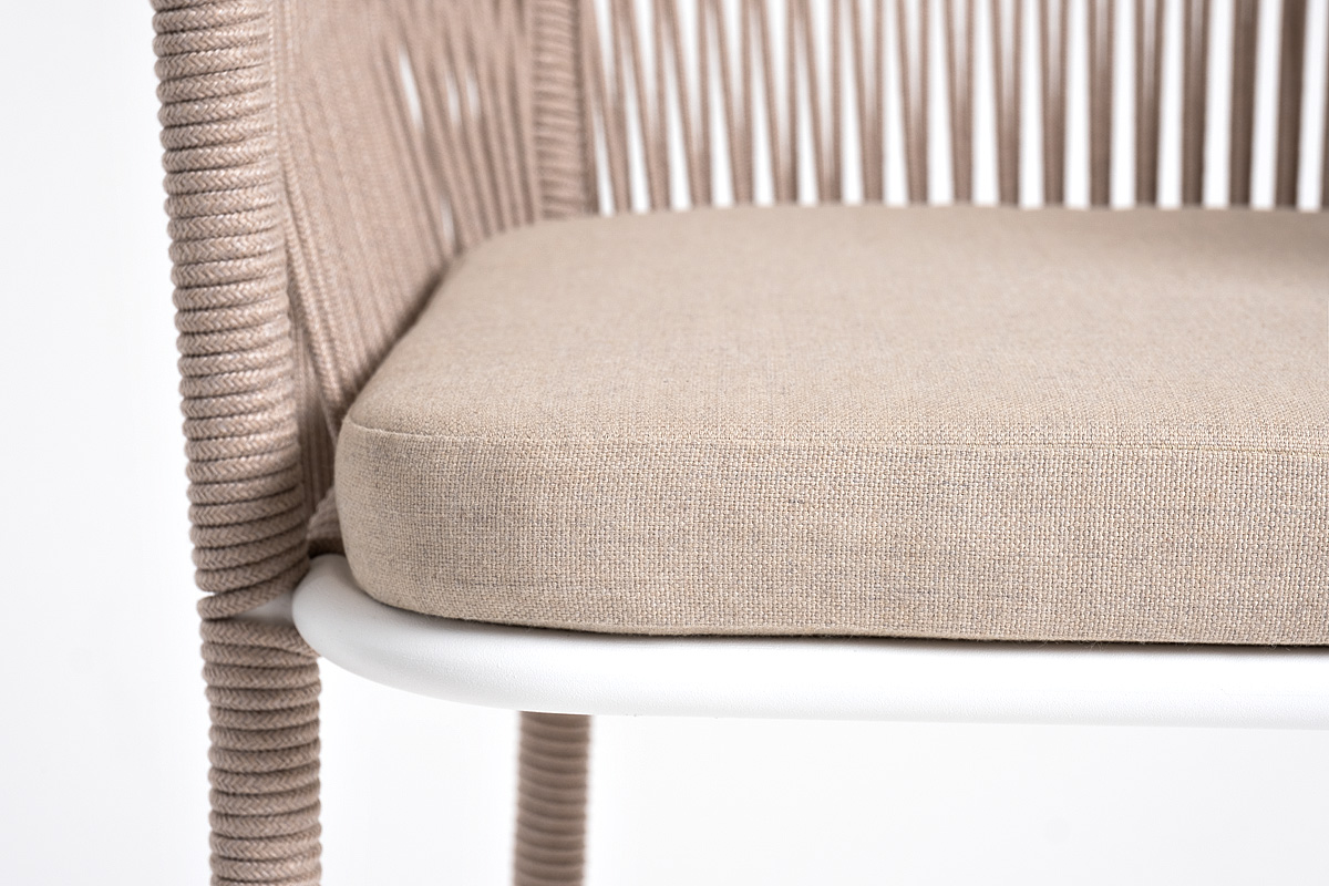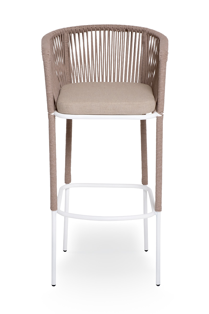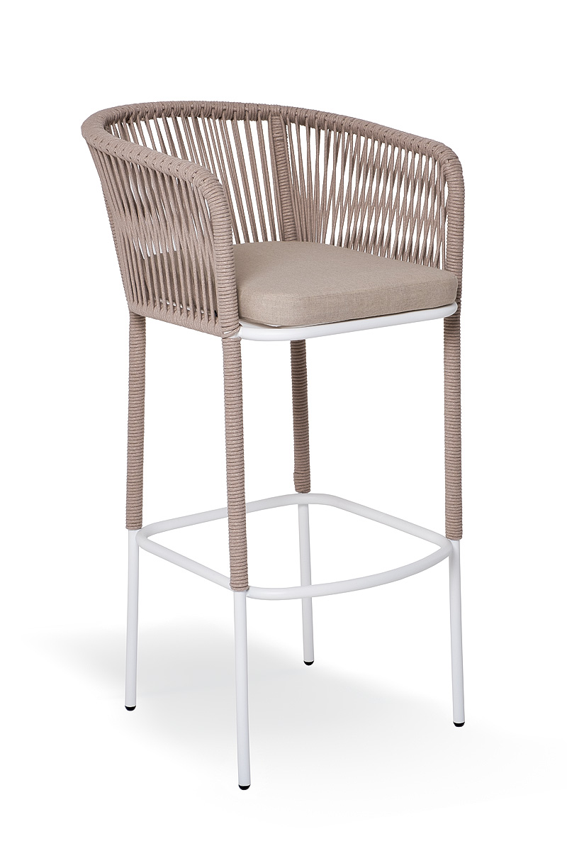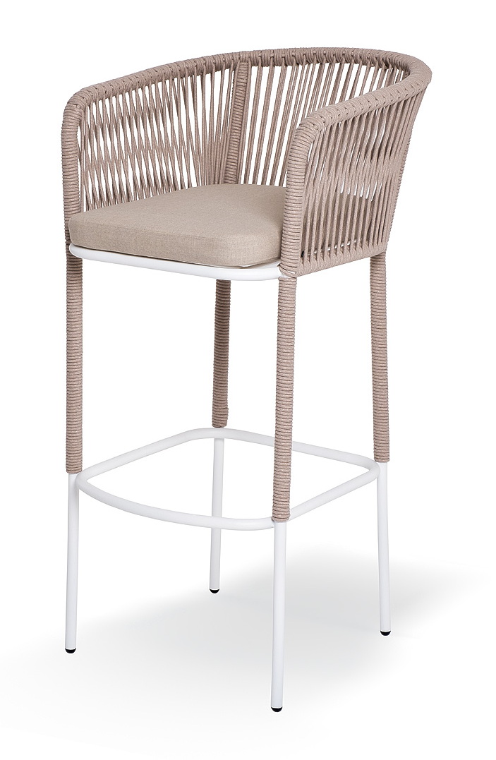 Барный стул «Марсель» представлен в стальном каркасе белого (RAL9016) цвета, оплетен вручную эластичными синтетическими лентами из высокопрочных полиэфирных волокон, бежевого оттенка, размер стула: 590×690×1100 мм. Высота сидения без подушки – 760 мм.