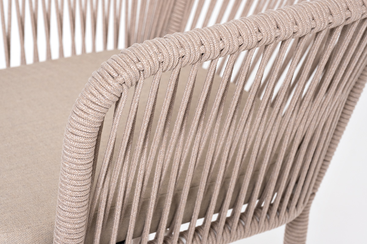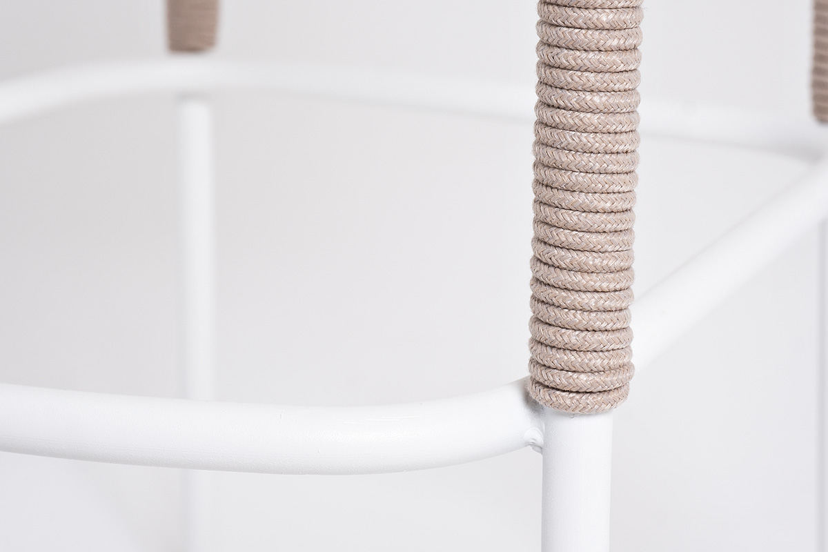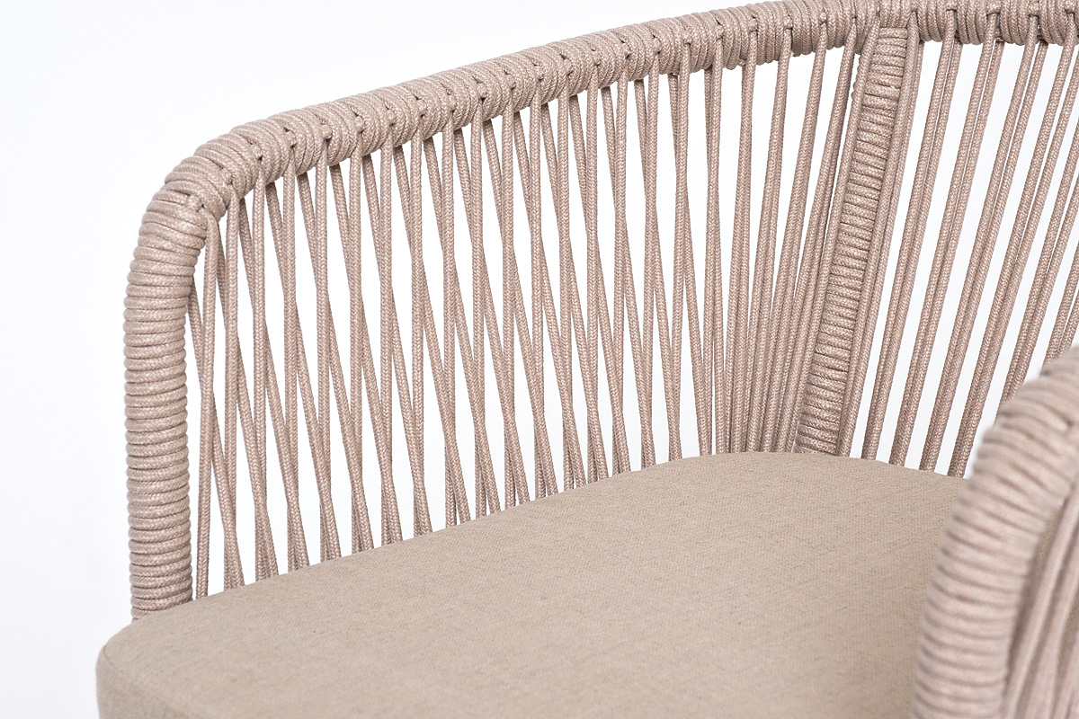 Барный стул «Марсель» представлен в стальном каркасе белого (RAL9016) цвета, оплетен вручную эластичными синтетическими лентами из высокопрочных полиэфирных волокон, бежевого оттенка, размер стула: 590×690×1100 мм. Высота сидения без подушки – 760 мм.