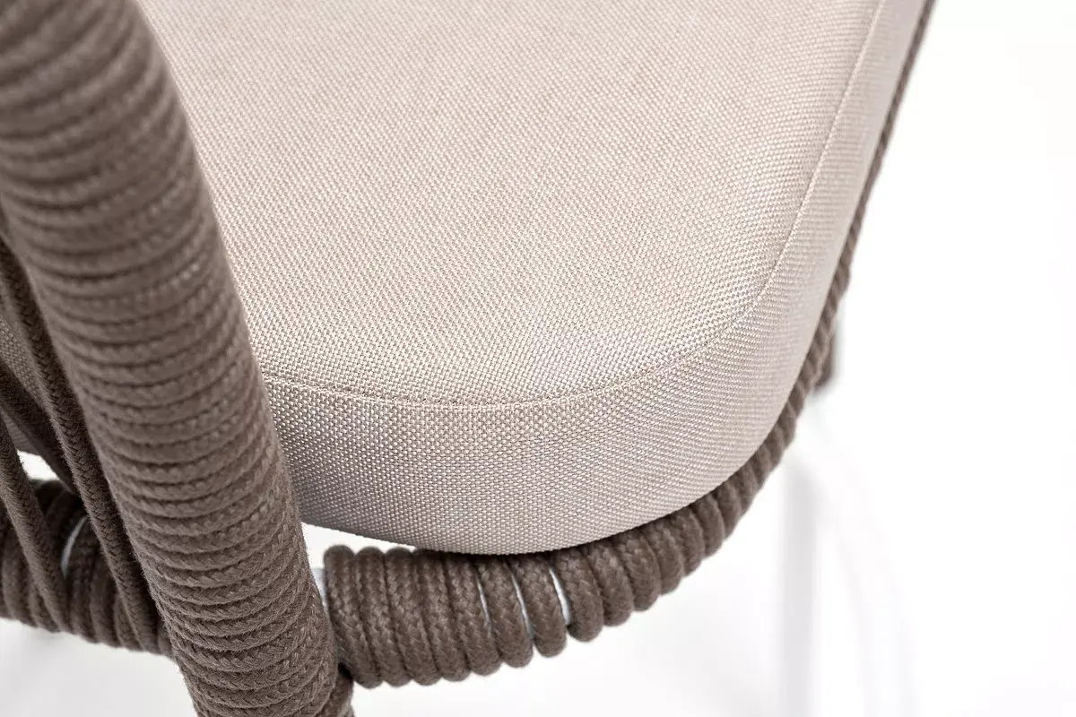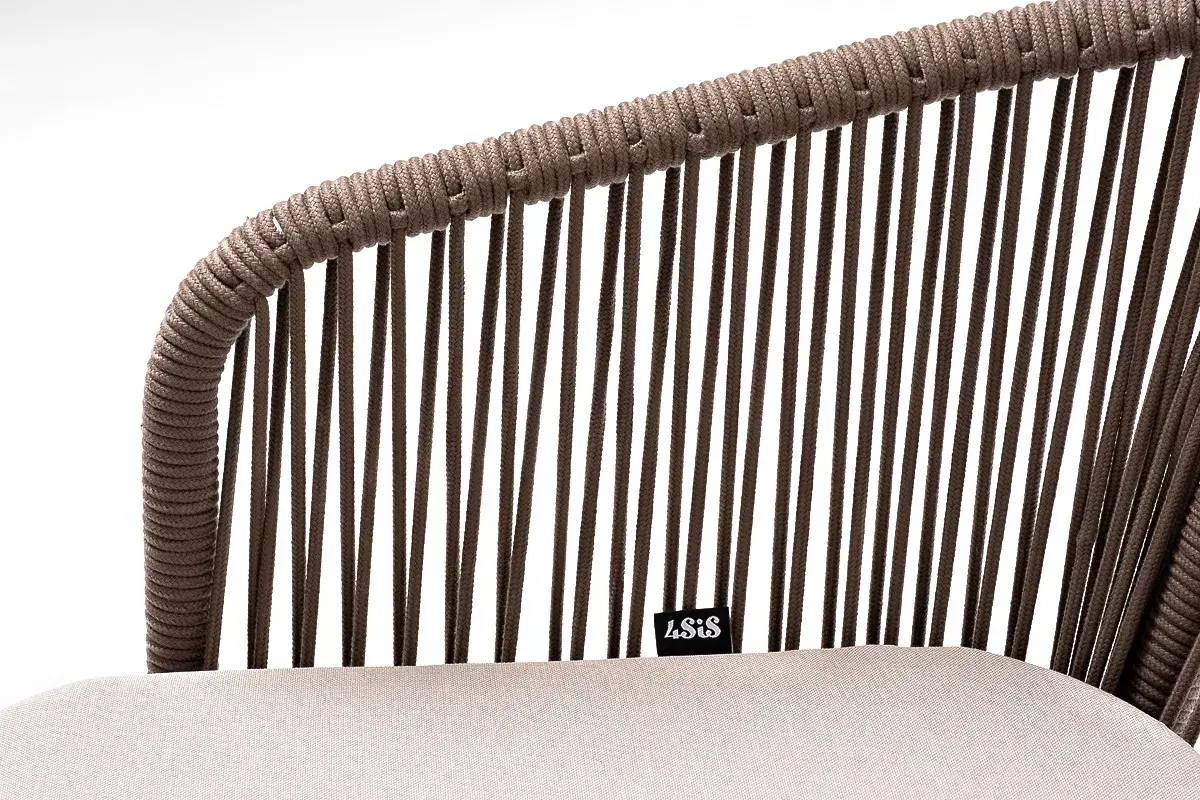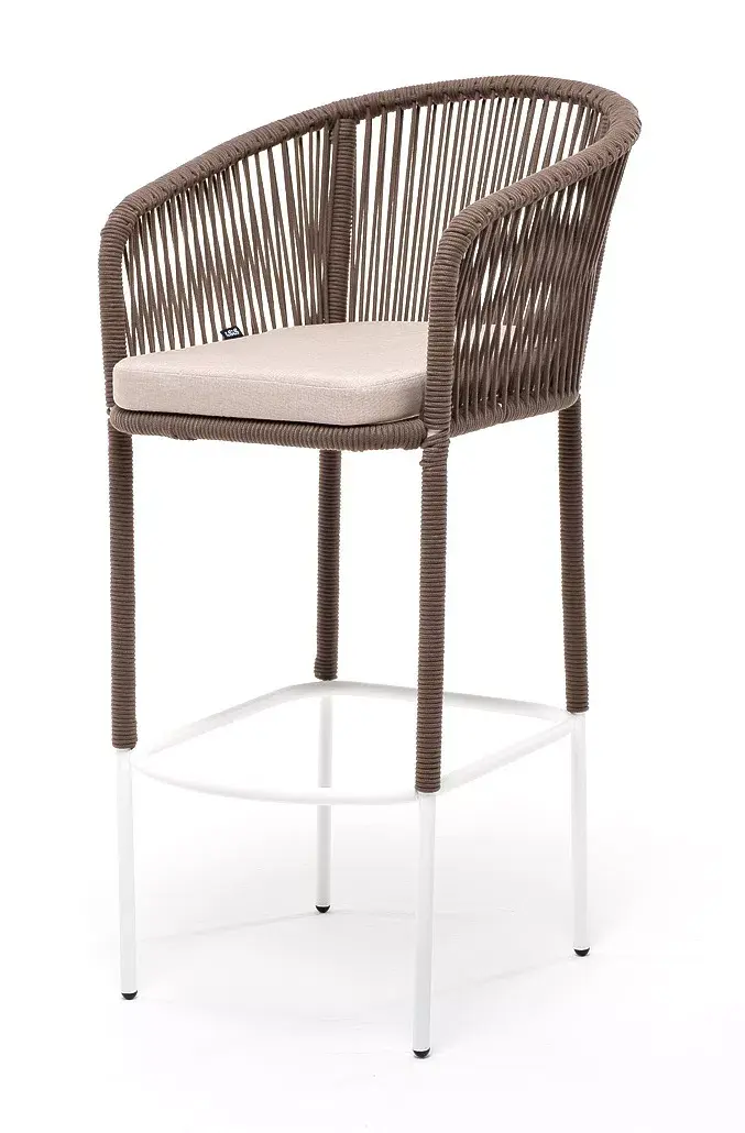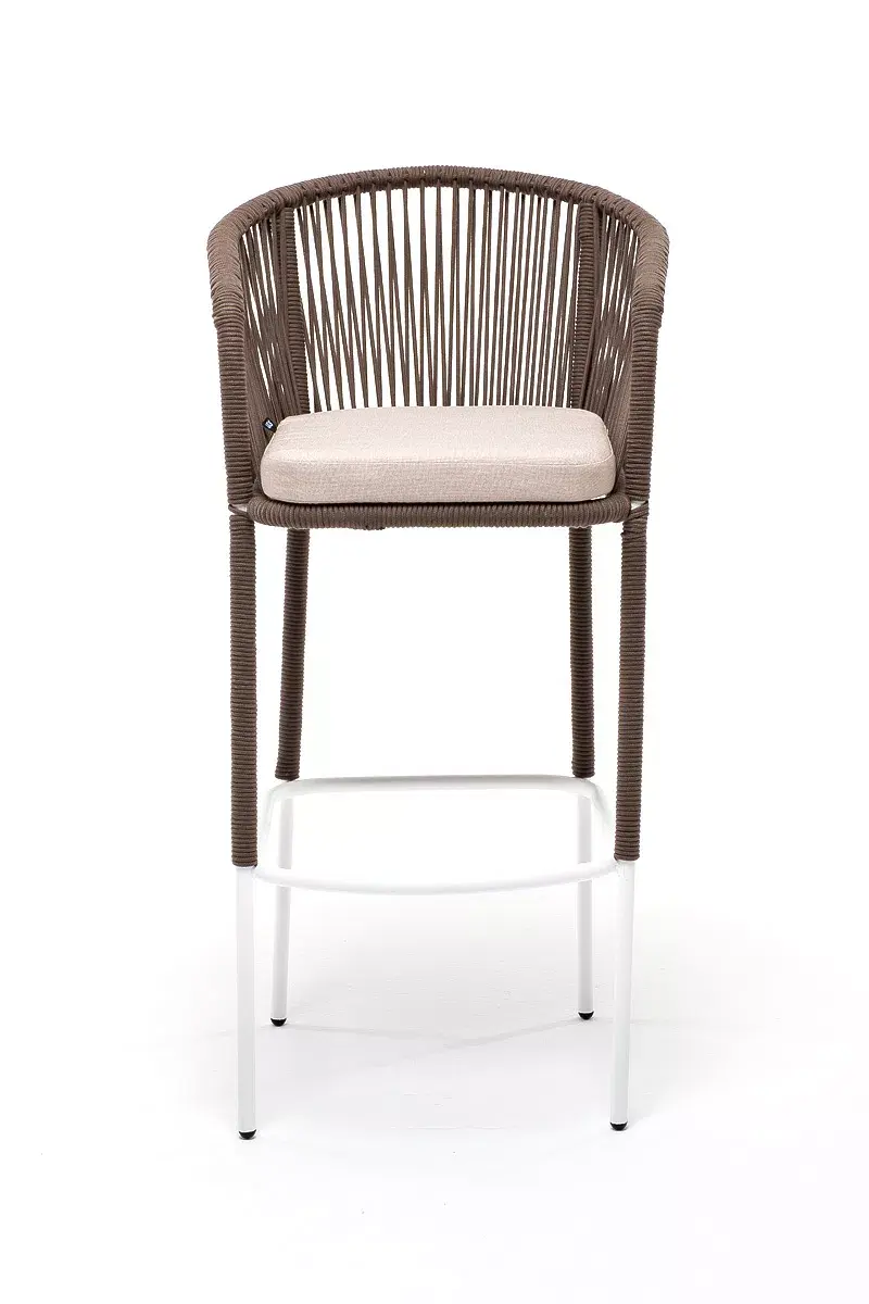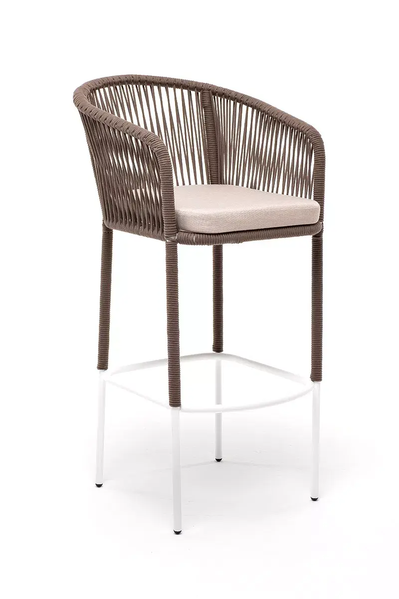 Барный стул из коллекции «Марсель» представлен в виде стального каркаса, оплетенного вручную эластичными синтетическими лентами из высокопрочных полиэфирных волокон - роуп коричневый.