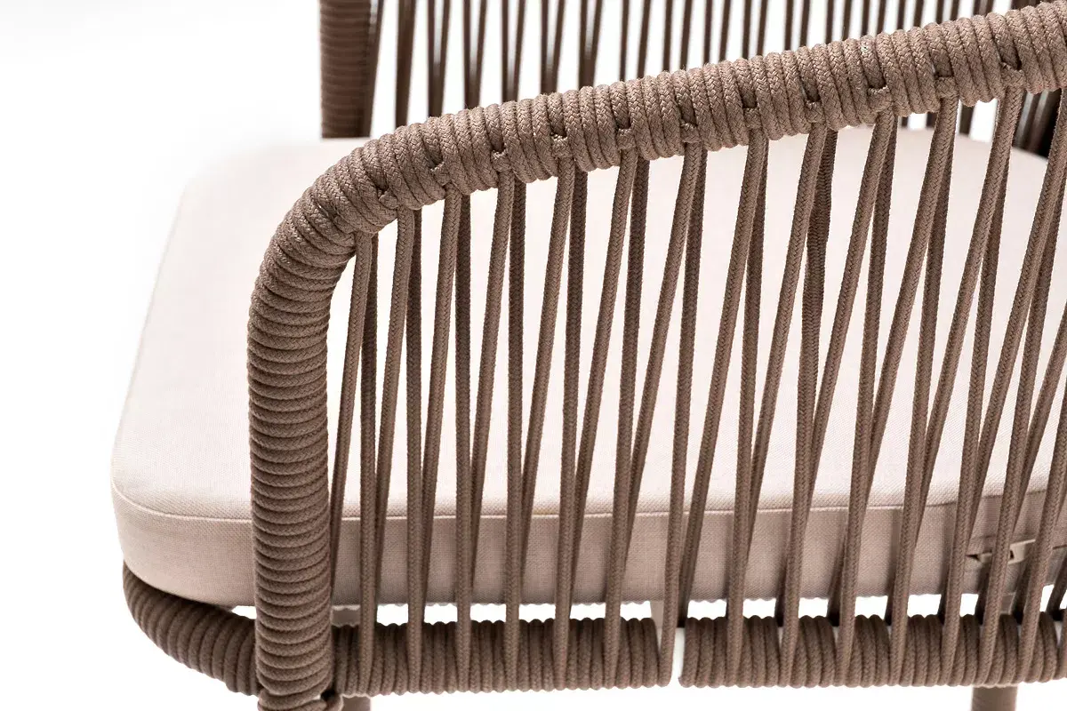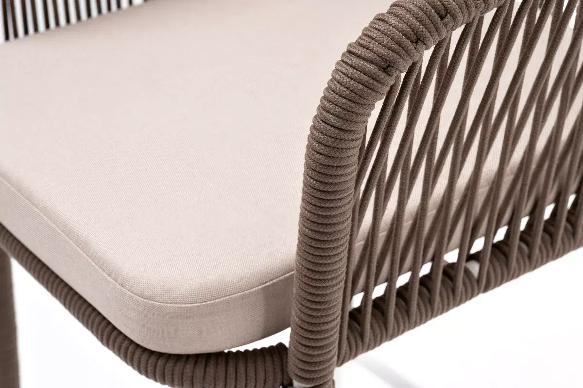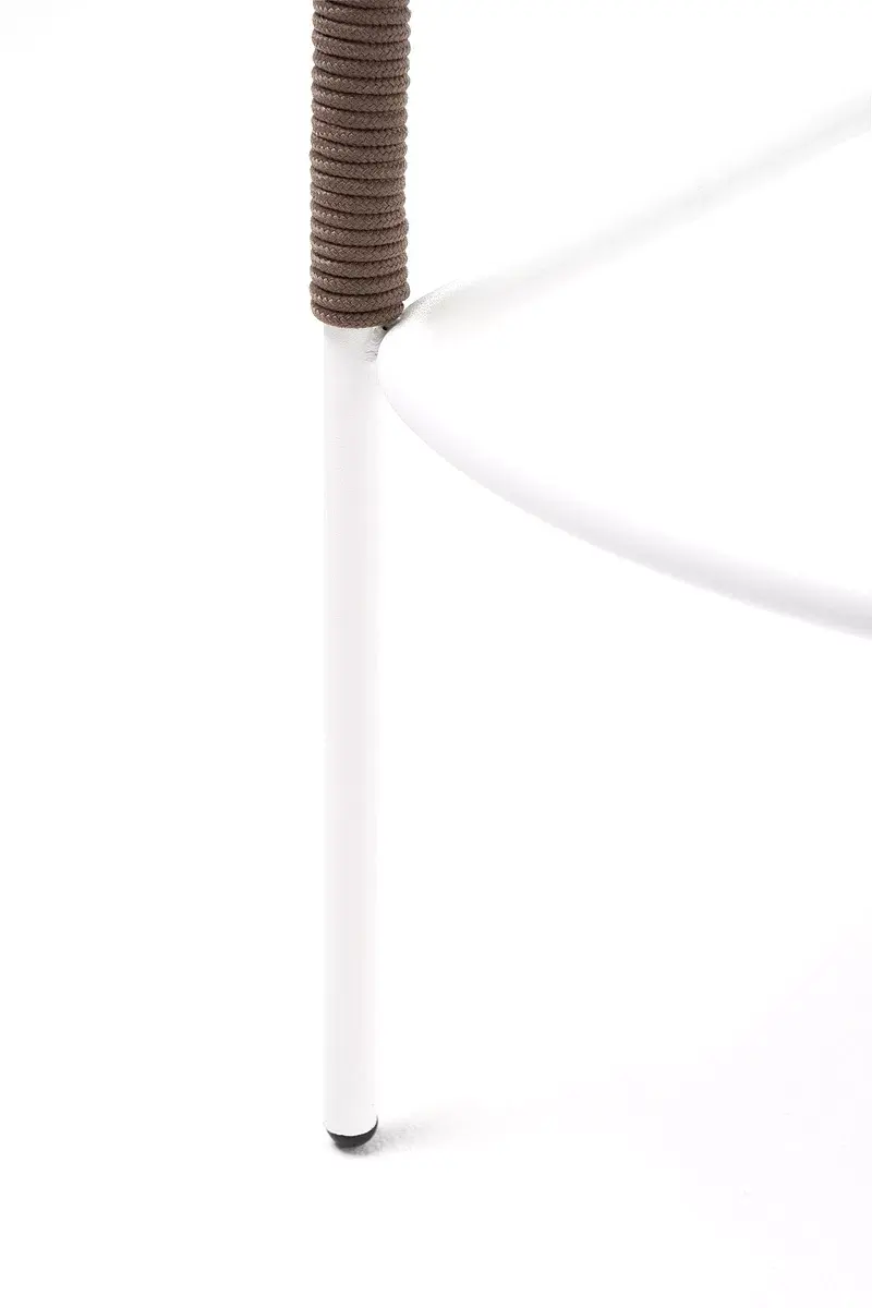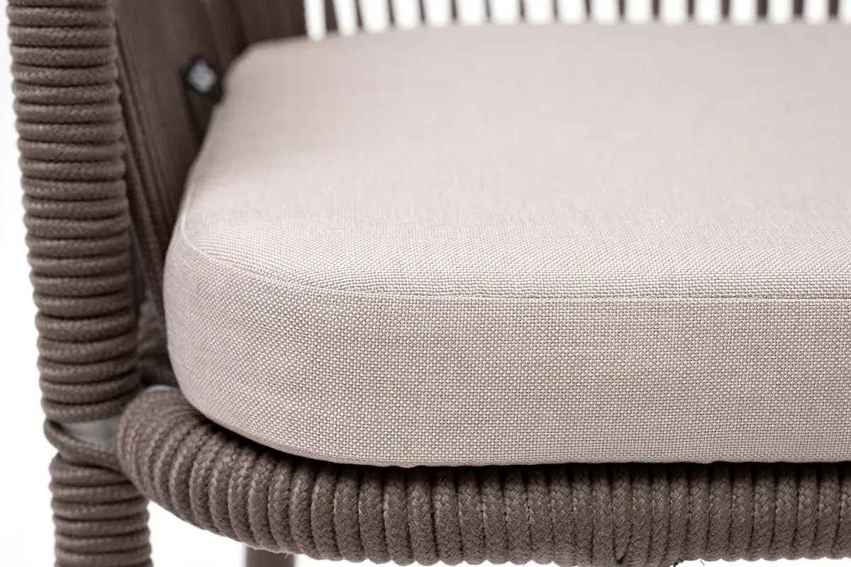 Барный стул из коллекции «Марсель» представлен в виде стального каркаса, оплетенного вручную эластичными синтетическими лентами из высокопрочных полиэфирных волокон - роуп коричневый.