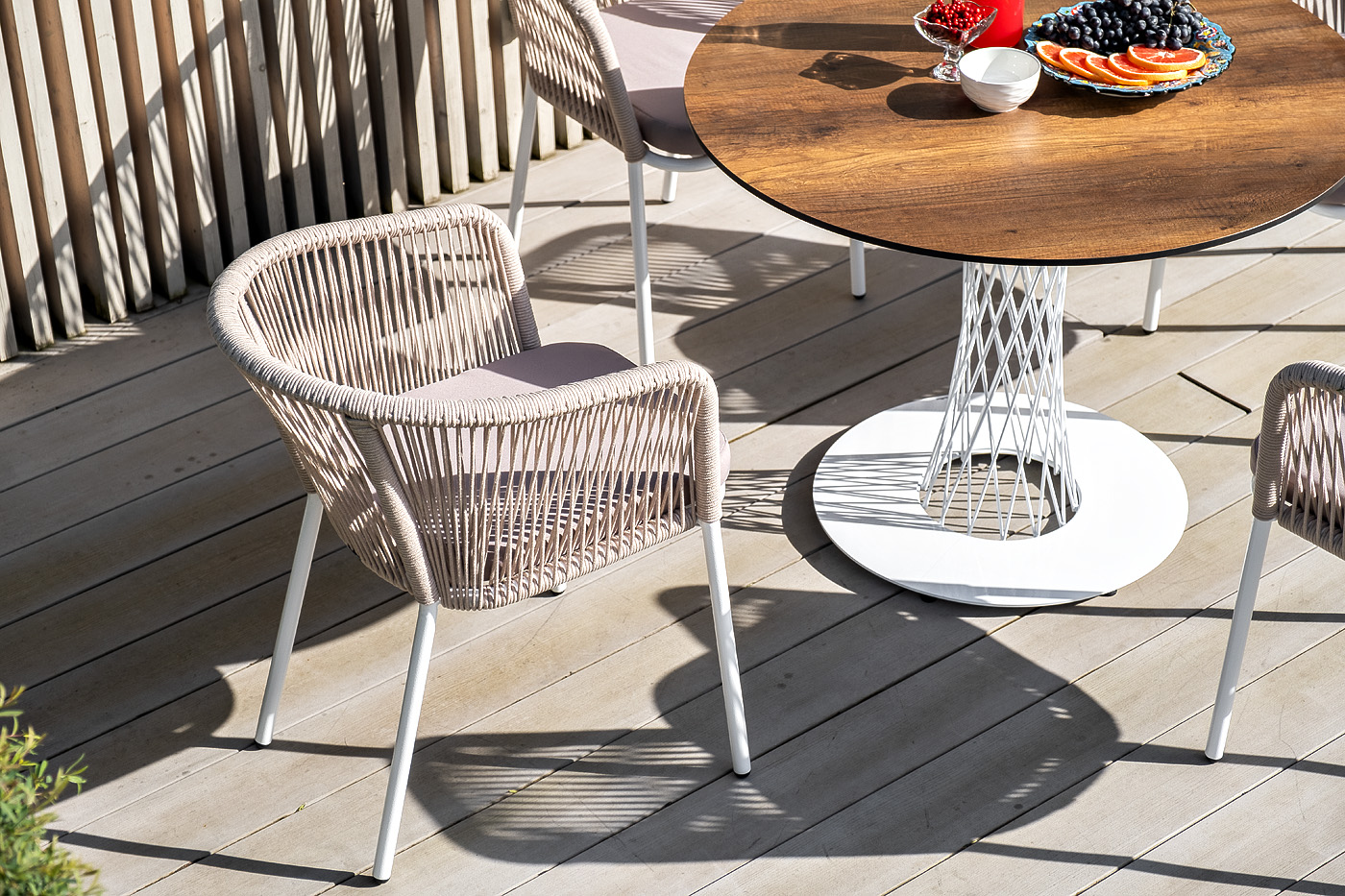 Плетеный стул из коллекции «Марсель» представен в светлых тонах. Каркас из прочного алюминия окрашен порошковой краской в белый цвет, ручная оплетка - роуп бежевого оттенка.