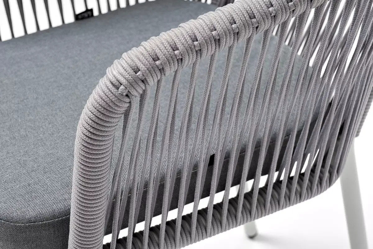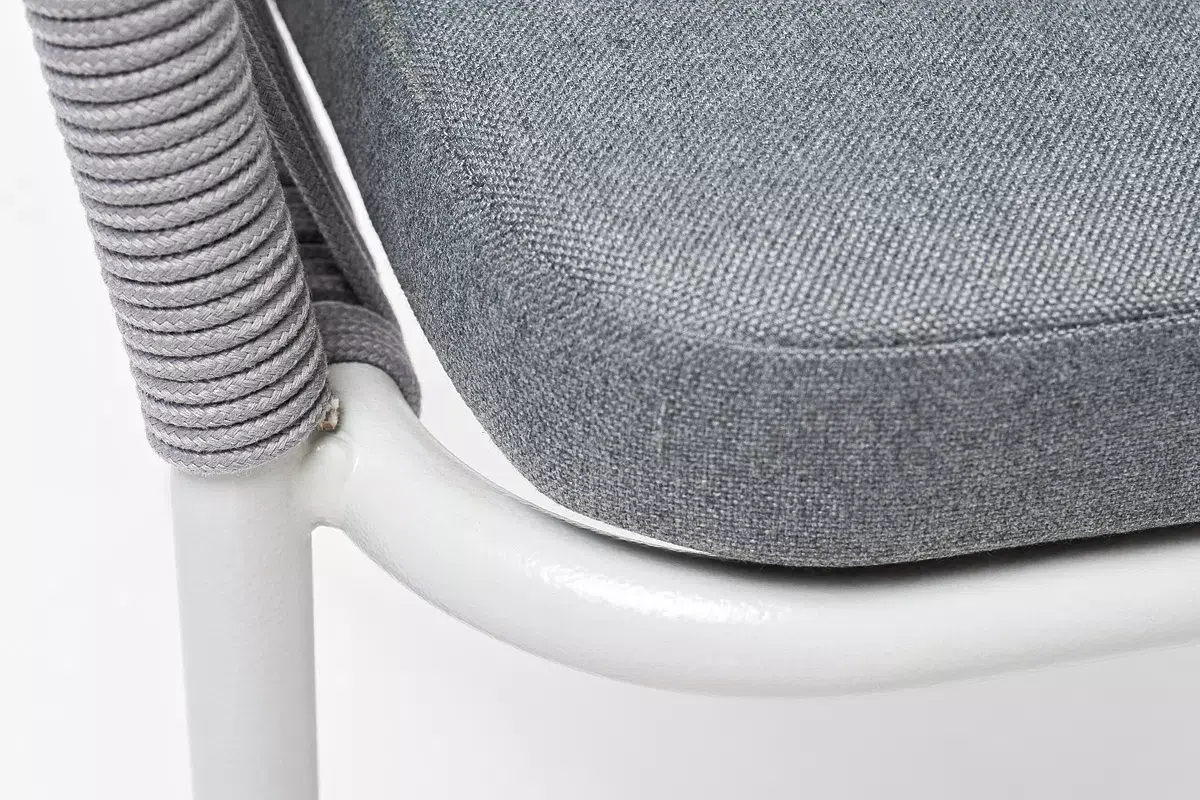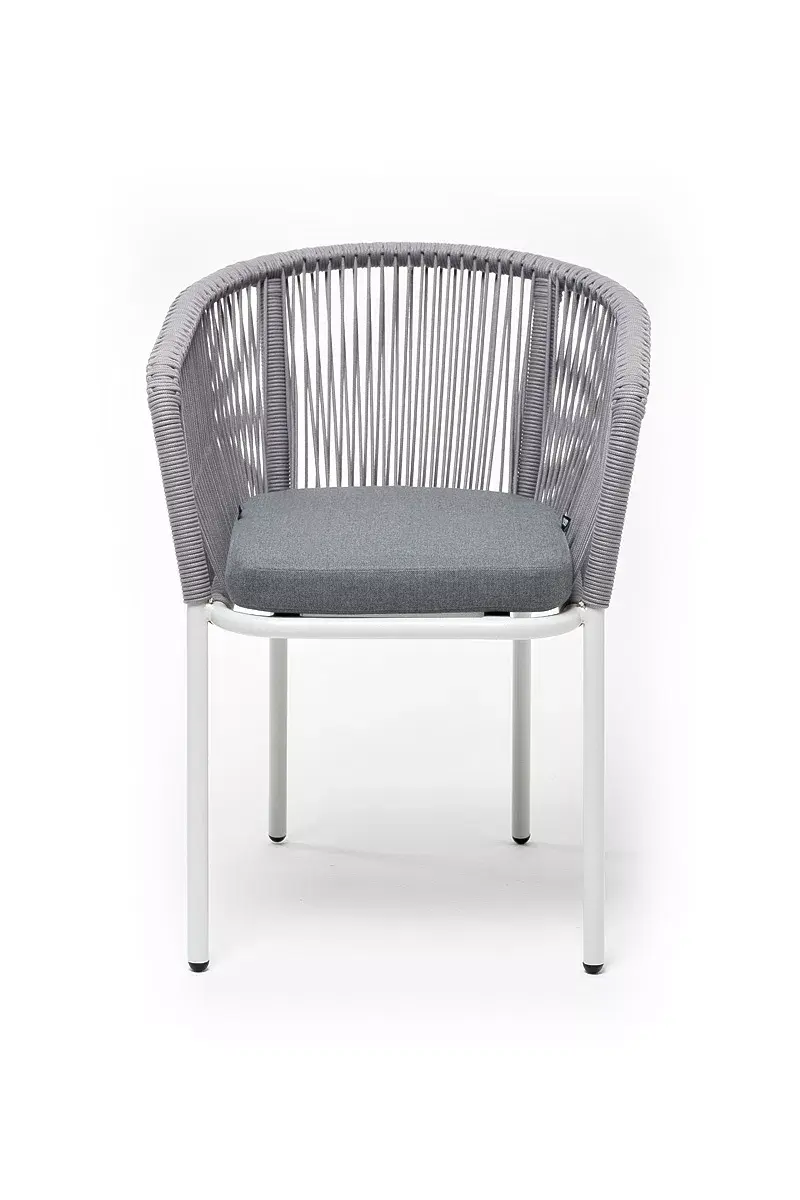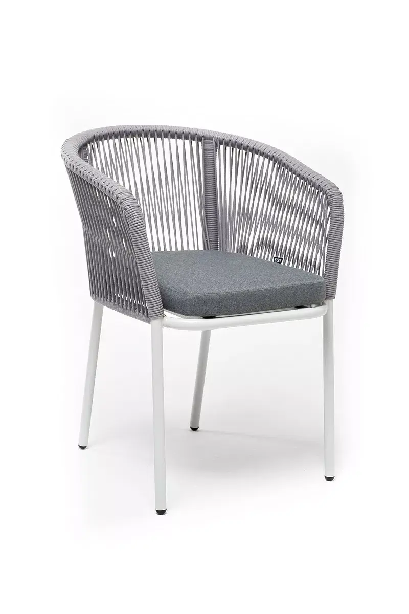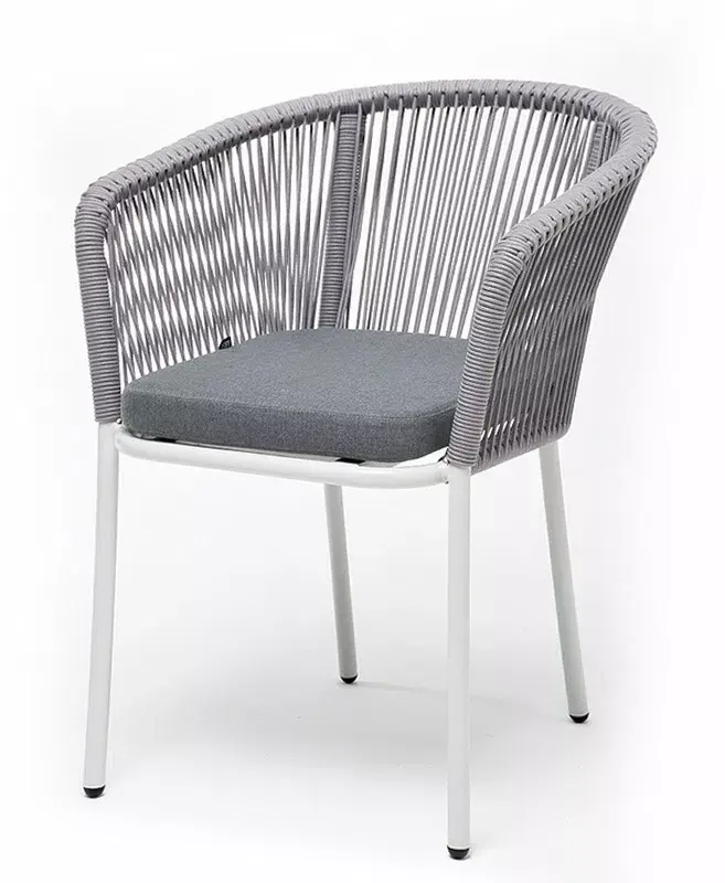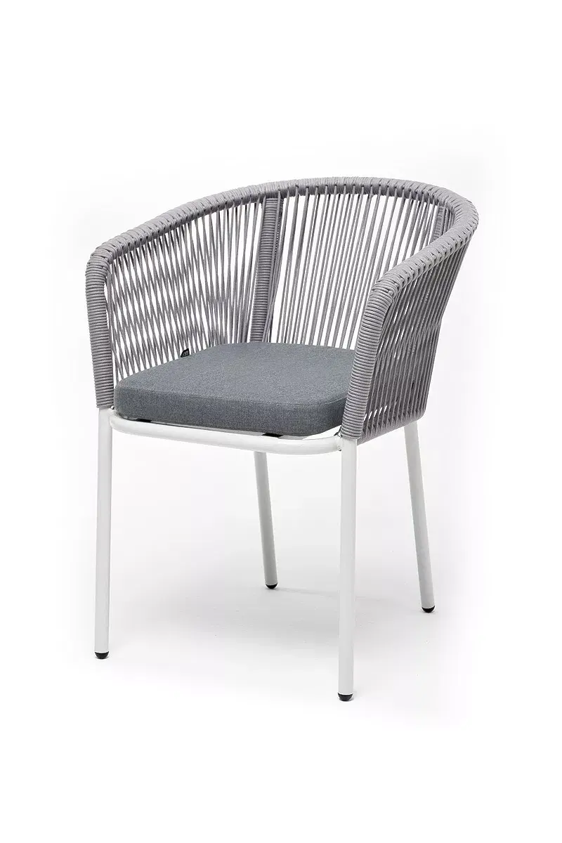 Плетеный стул из коллекции «Марсель» представлен в светлых тонах. Каркас из прочного алюминия окрашен порошковой краской в белый цвет, ручная оплетка - роуп светло-серого оттенка.