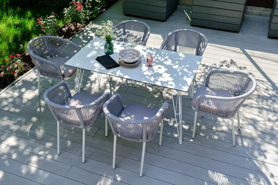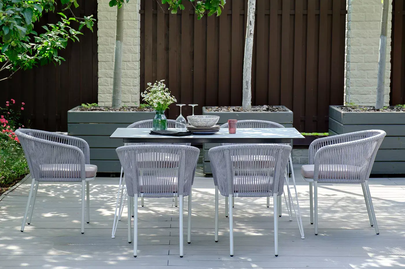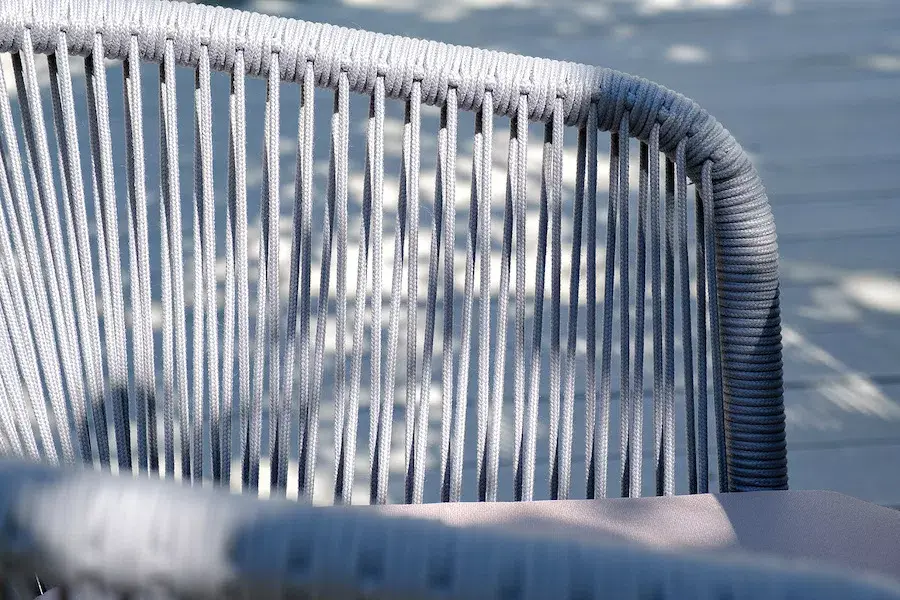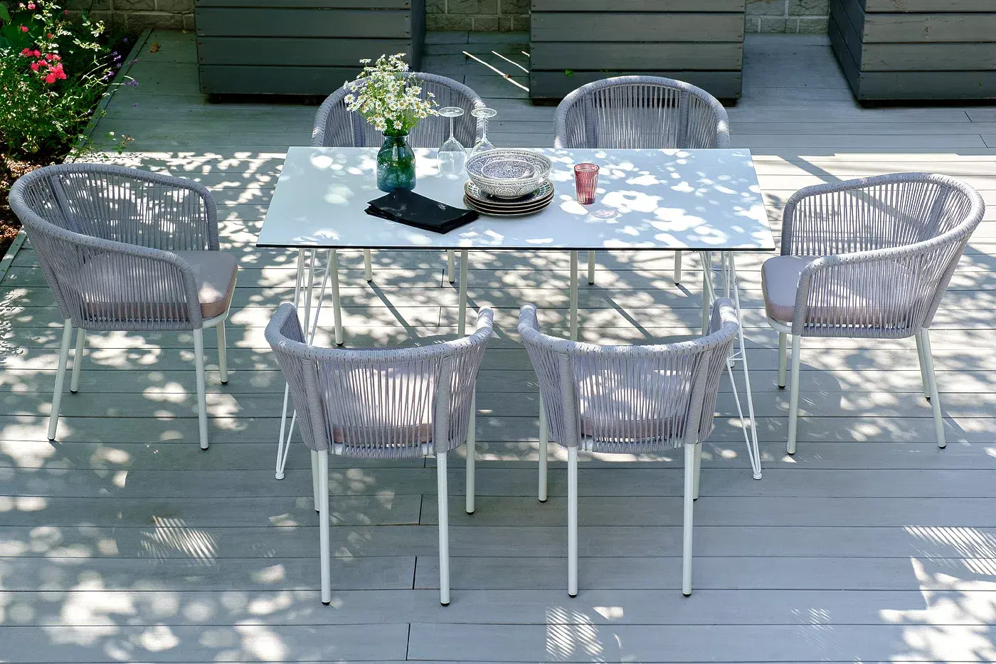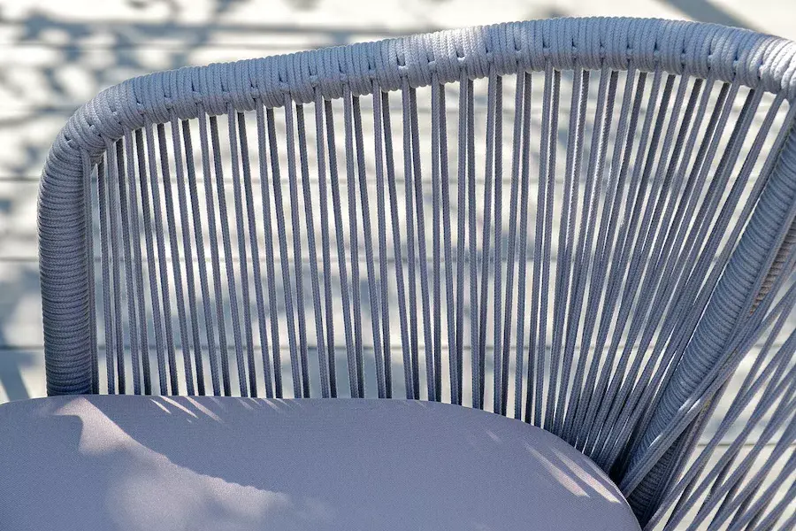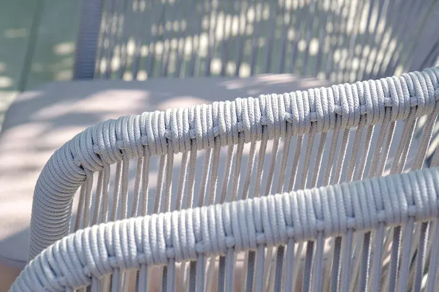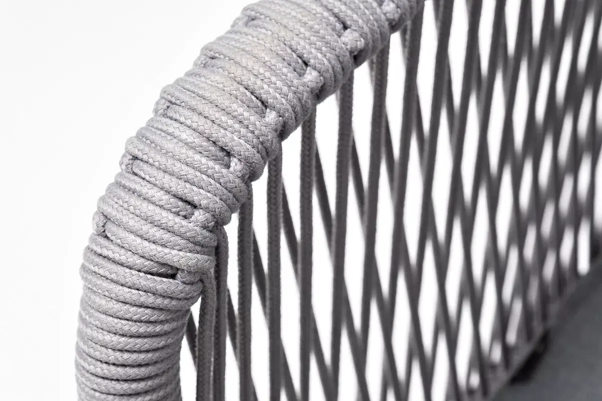 Плетеный стул из коллекции «Марсель» представлен в светлых тонах. Каркас из прочного алюминия окрашен порошковой краской в белый цвет, ручная оплетка - роуп светло-серого оттенка.