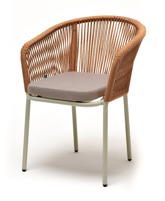 Плетеный стул из коллекции «Марсель». Каркас из прочного алюминия окрашен порошковой краской в бежево-серый цвет, ручная оплетка - роуп оранжевый меланж.