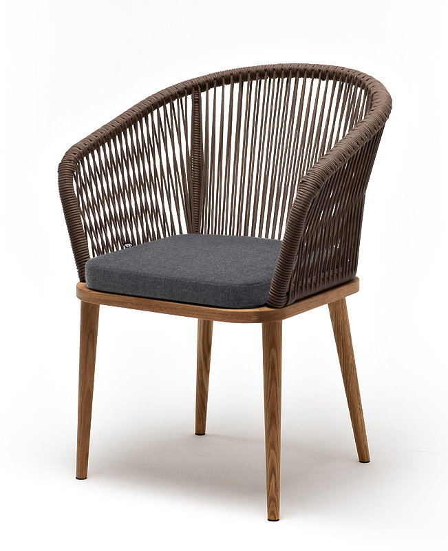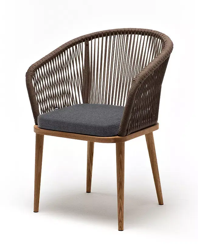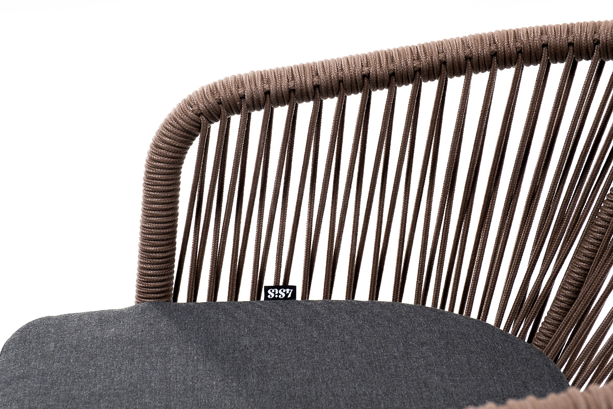 Каркас выполнен из натурального дерева. Оплетка выполнена вручную современным материалом - роупом. Это эластичные синтетические веревки из высокопрочных полиэфирных волокон, предназначенные для изготовления мебели. Цвет оплетки - коричневый.