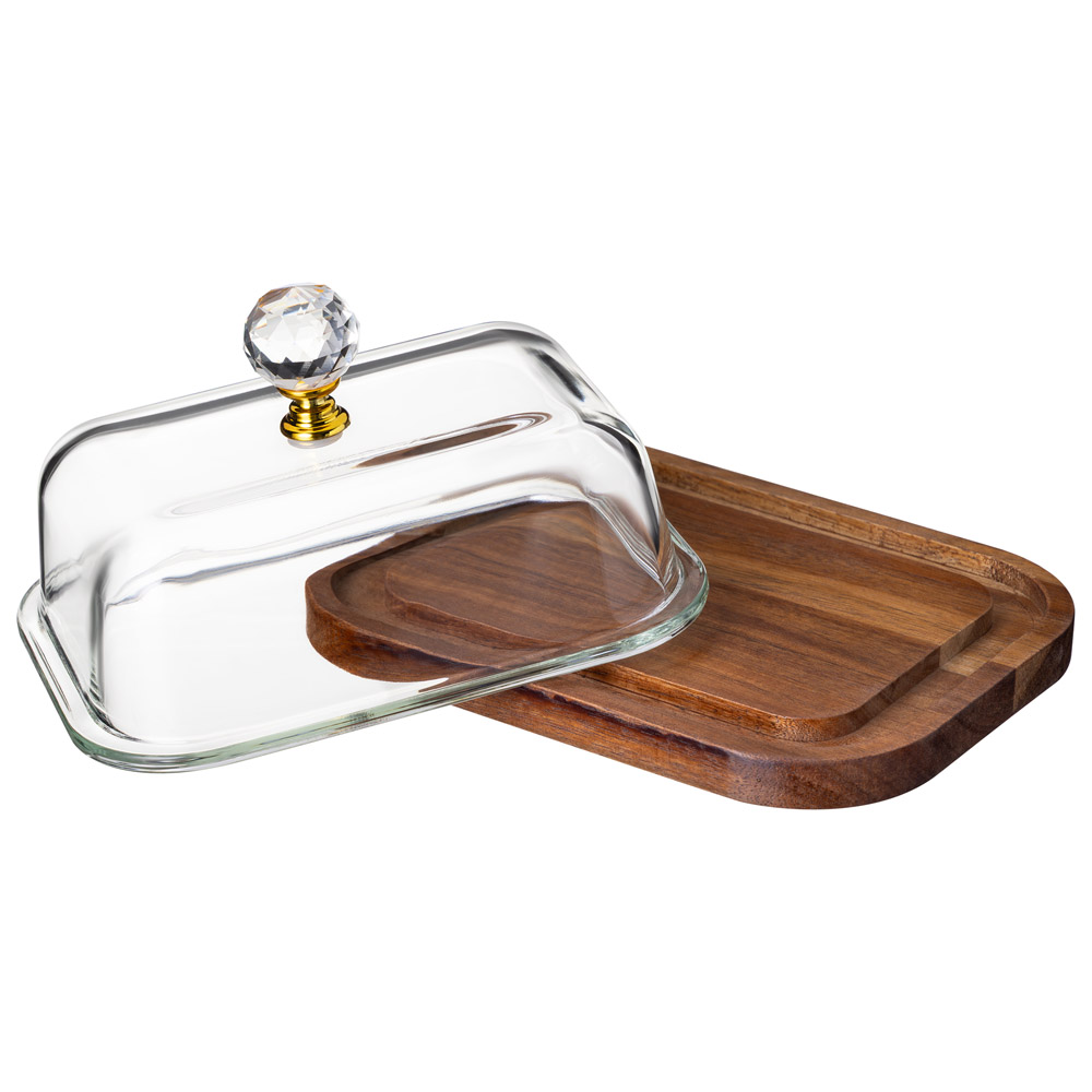 Масленка и сервировочное блюдо — это диалог между теплом живого дерева и прозрачной чистотой стекла. Основа из натуральной акации с её неповторимой волнистой текстурой и медово-золотистым оттенком дарит ощущение уюта и естественной роскоши. Каждая деталь — от мягких изгибов до едва уловимого древесного аромата — рассказывает историю бережного отношения к природе.