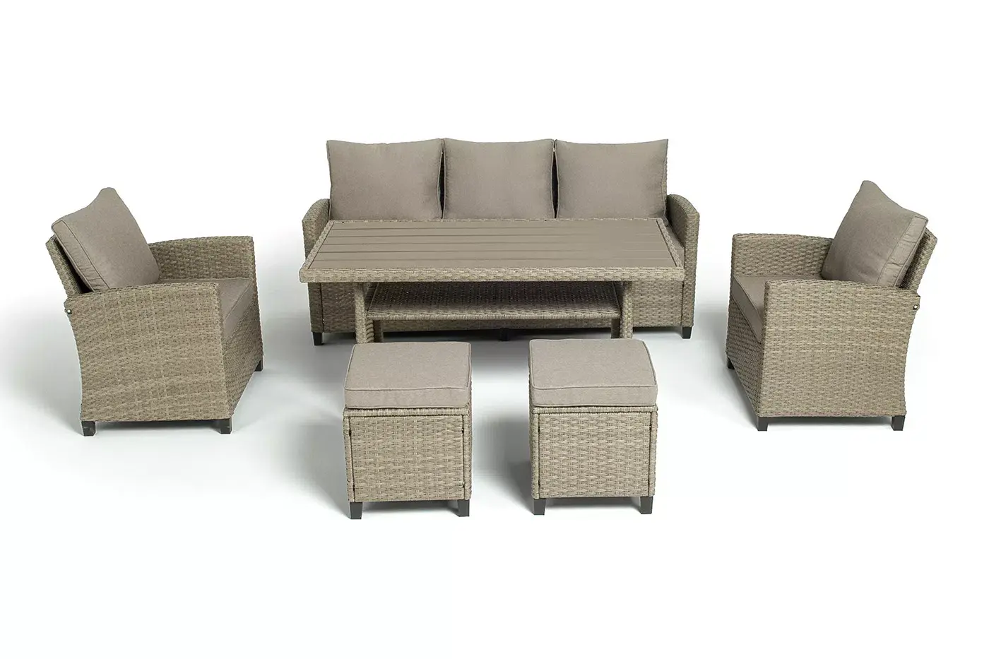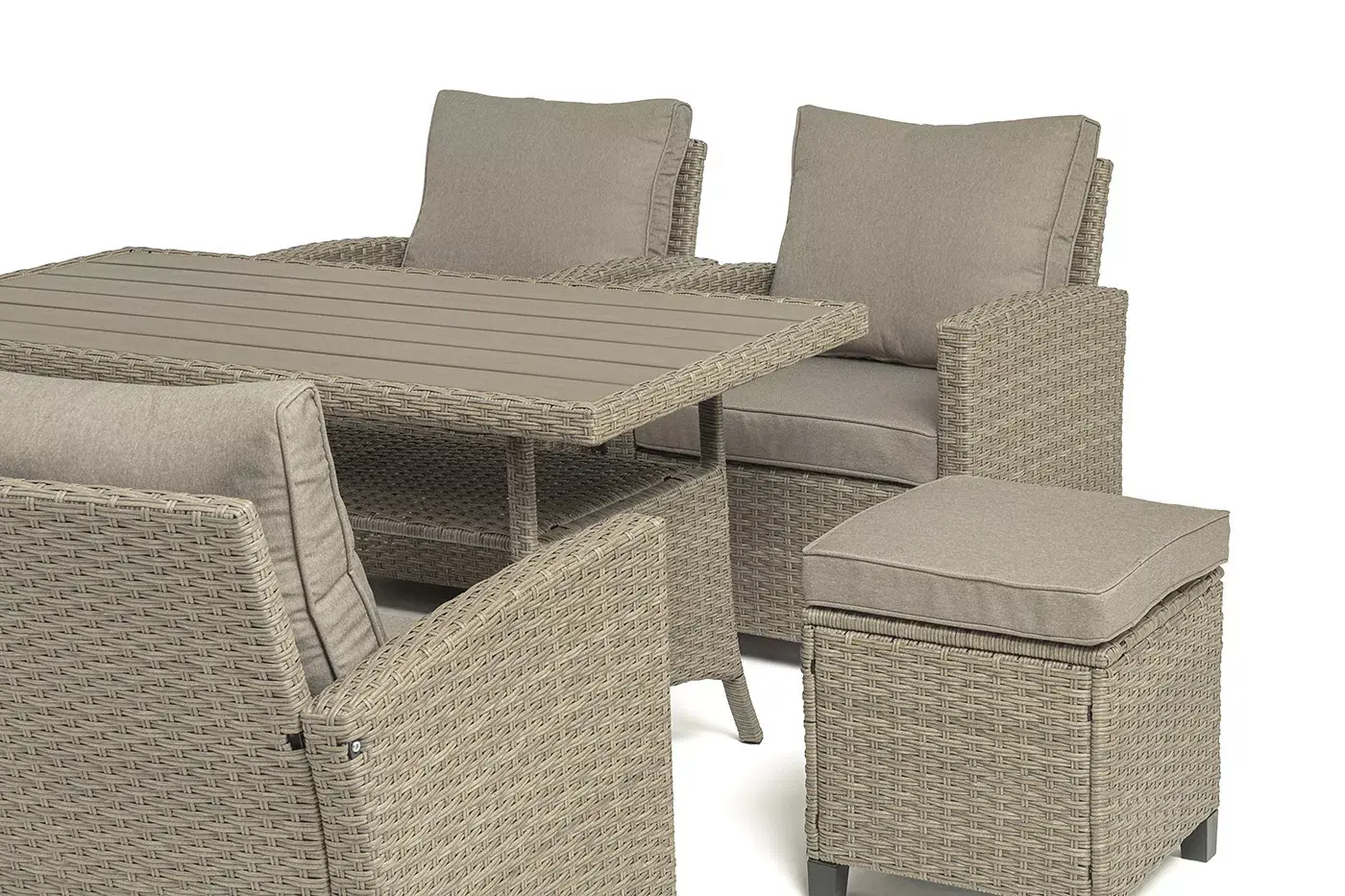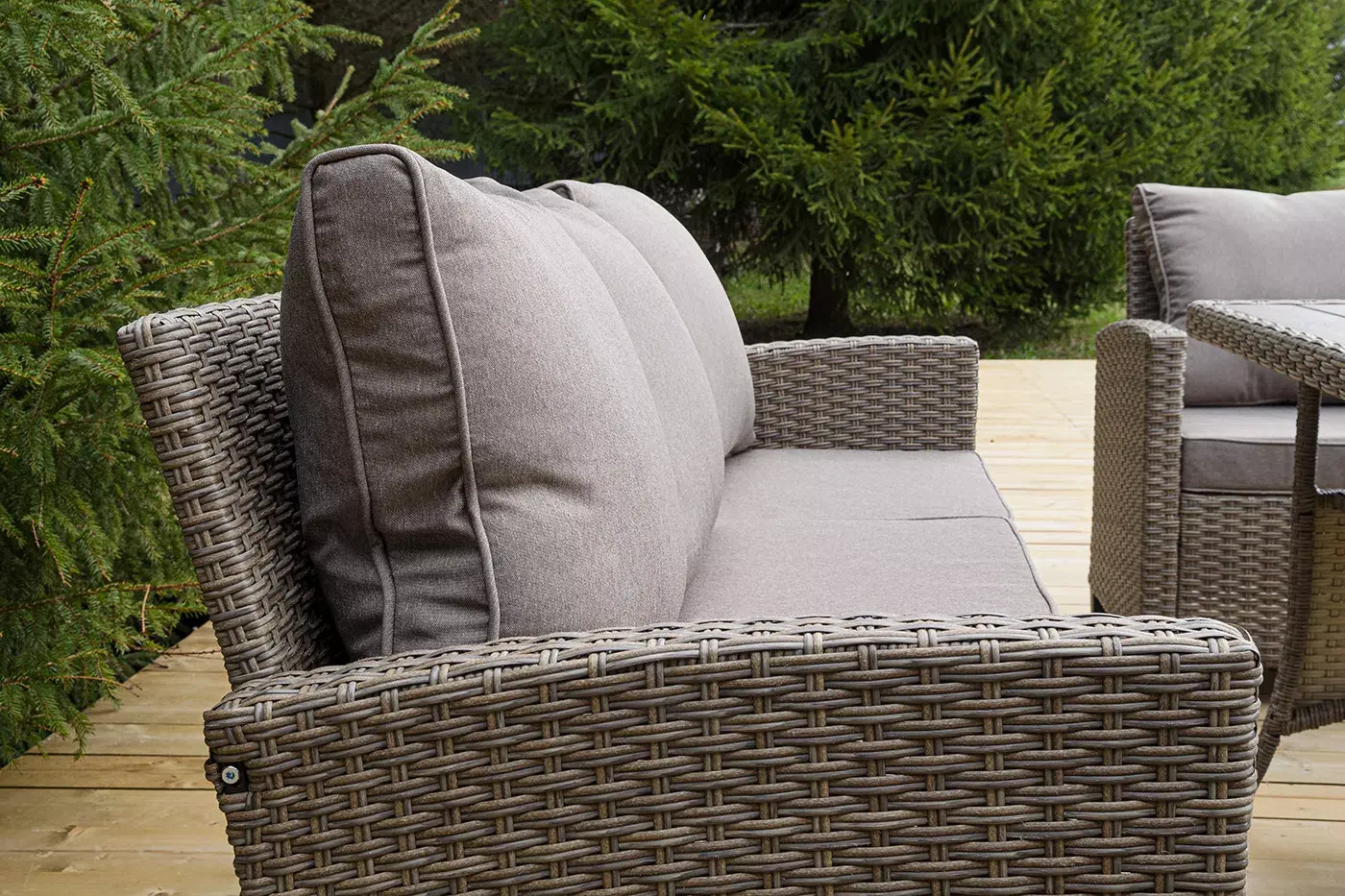 Плетеная мебель дополнена удобными подушками в бежевых чехлах. При их изготовлении используют полиэстер, плотность – 230гр/м2.