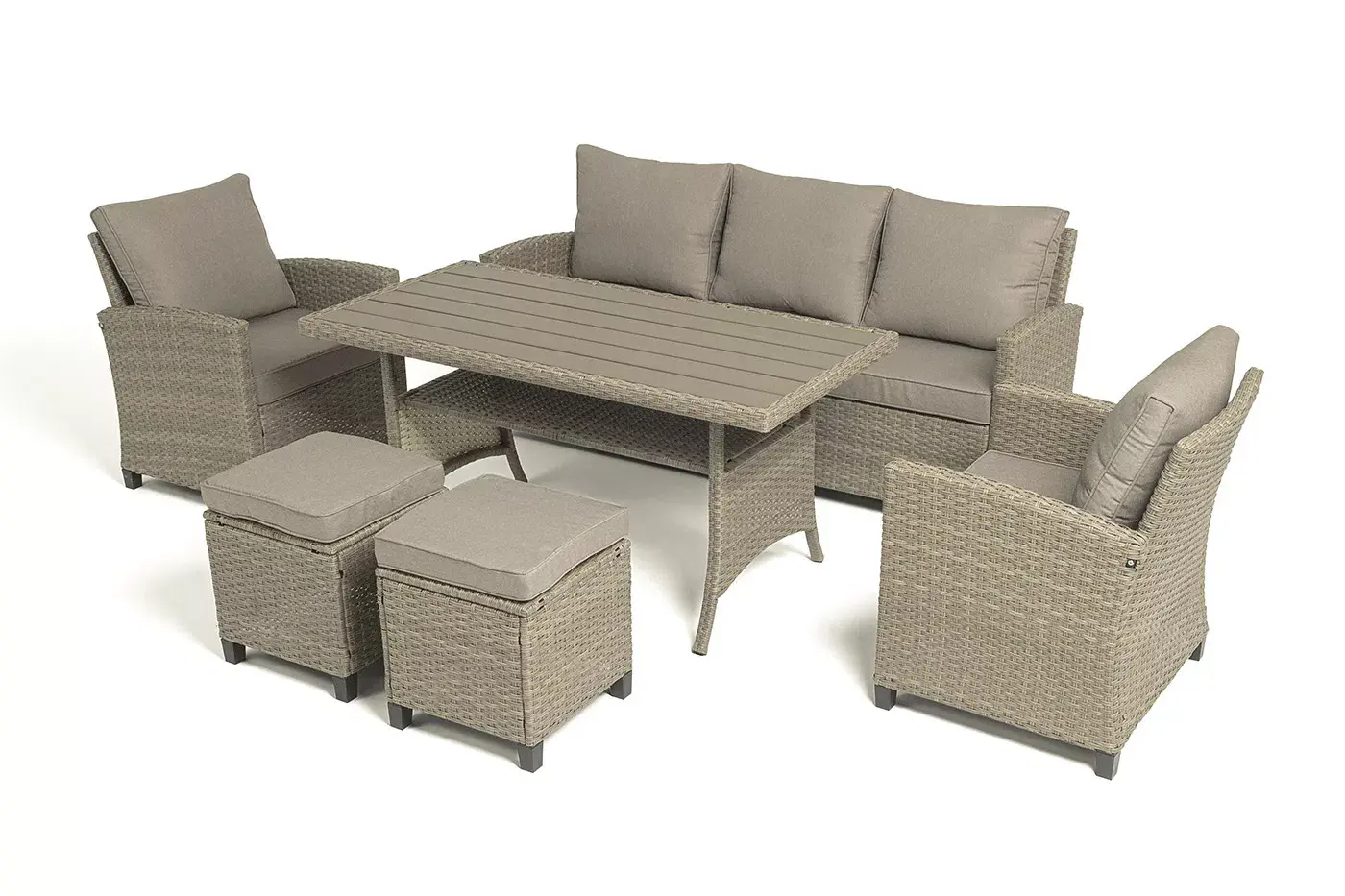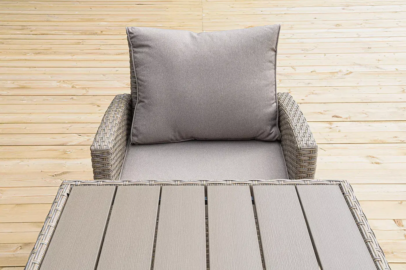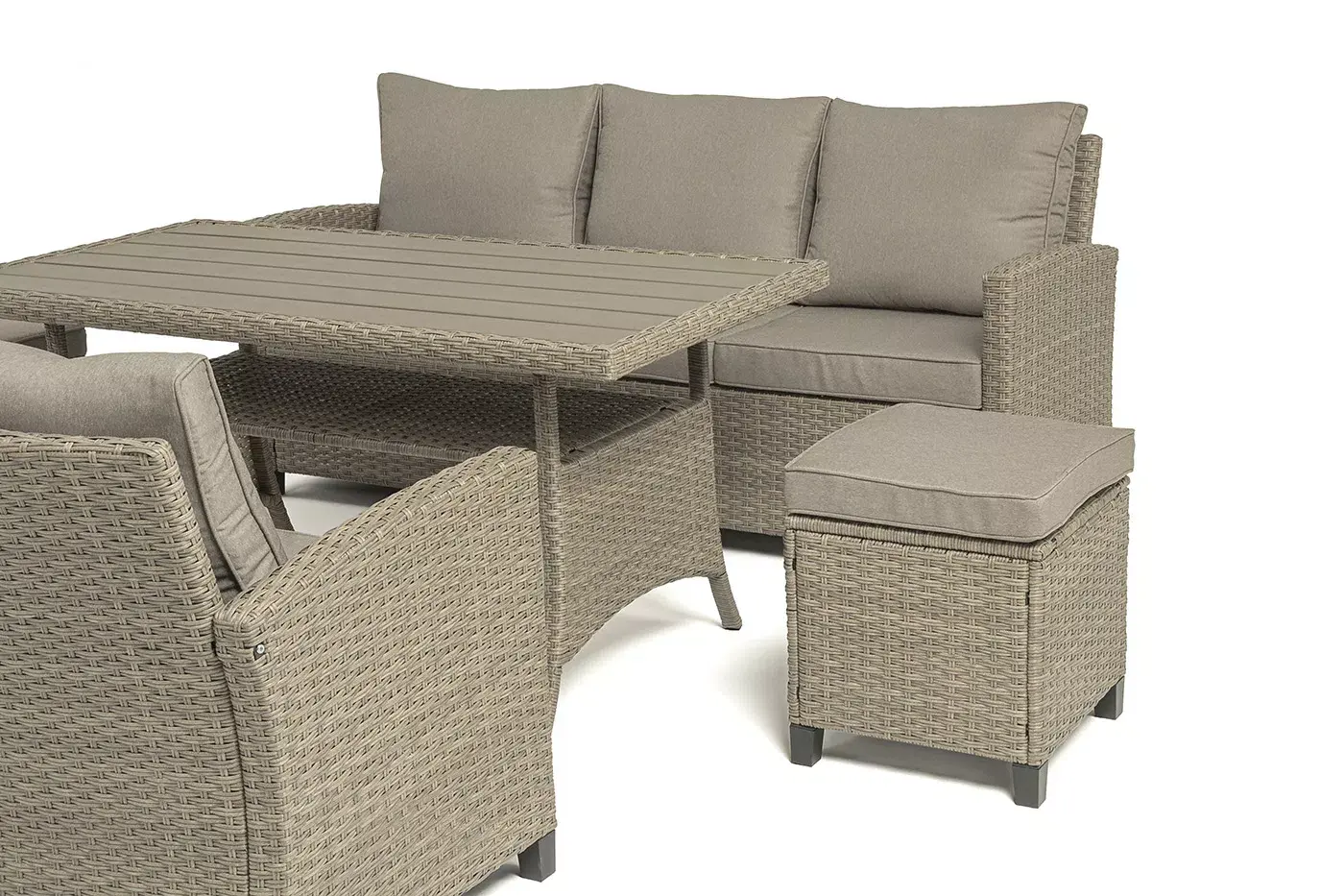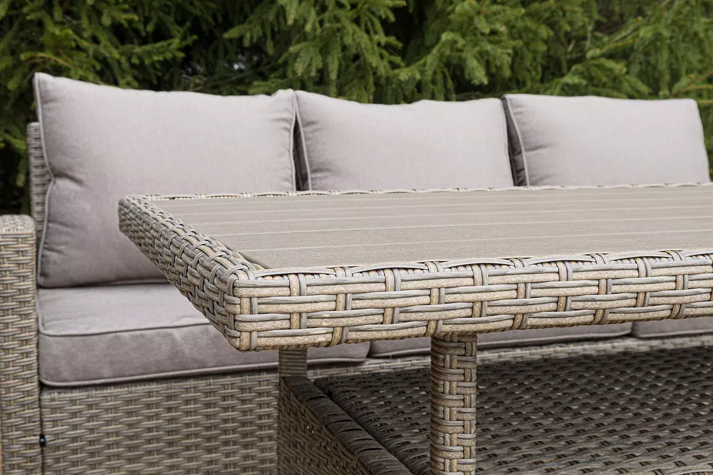 Стол выполнен из стали, вручную оплетенного круглым искусственным ротангом. Столешница изготовлена из полимерного материала ДПК, устойчивого к ультрафиолетовым лучам и декорированным под дерево.