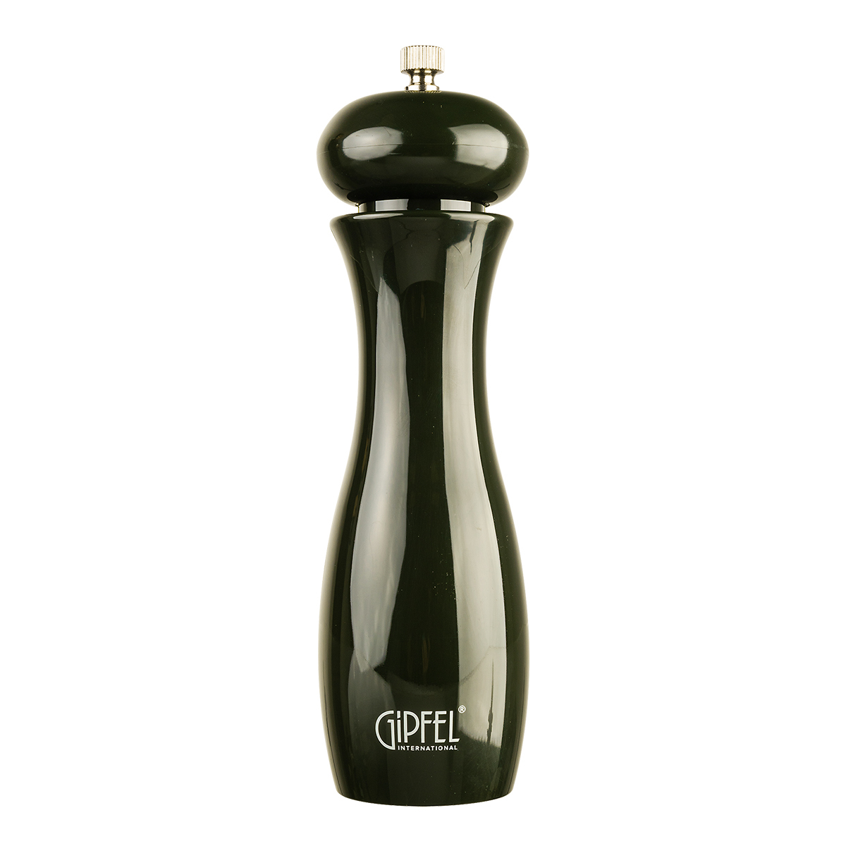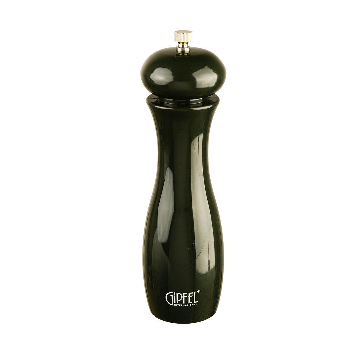 Мельница для специй GIPFEL MAJOLICA 9165. Высота мельницы 20,5см. Диаметр верха 5,5см; диаметр дна 5см. Благодаря эргономичной форме мельницу при помоле удобно держать в руке. Классическая форма и темно-зеленый цвет позволяют ей сочетаться в любыми предметами сервировки. Мельница сделана из пластика с элементами из алюминиевого сплава. Керамические жернова позволяют использовать мельницу для соли, перца и других приправ.