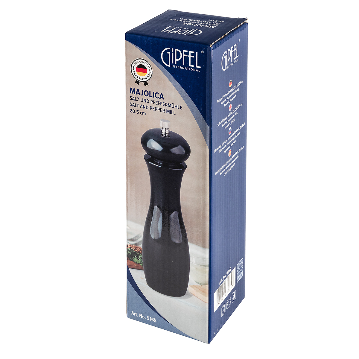 Мельница для соли и перца Gipfel MAJOLICA 9165. Высота мельницы 20,5 см. Диаметр верха 5,5 см; диаметр низа 5 см. Материал: алюминиевый сплав, керамика, пластик.