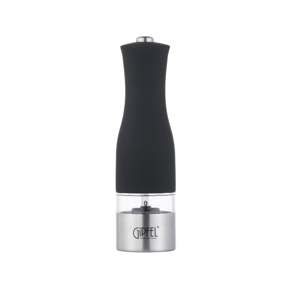 Мельница электрическая GIPFEL CASTLE 50660 с подсветкой. Высота 19,5 см. Диаметр верха 5 см, диаметр дна 5 см. Мельница имеет эргономичную форму и приятное на ощупь покрытие soft touch. Вес мельницы 259 гр. Подходит для всех видов приправ, соли и перца. Цвет черный. Материал: нержавеющая сталь, пластик, керамика. Жернова керамические. Размер помола регулируется колёсиком под мельницей. Работает от 6 батареек (в комплект не входят).