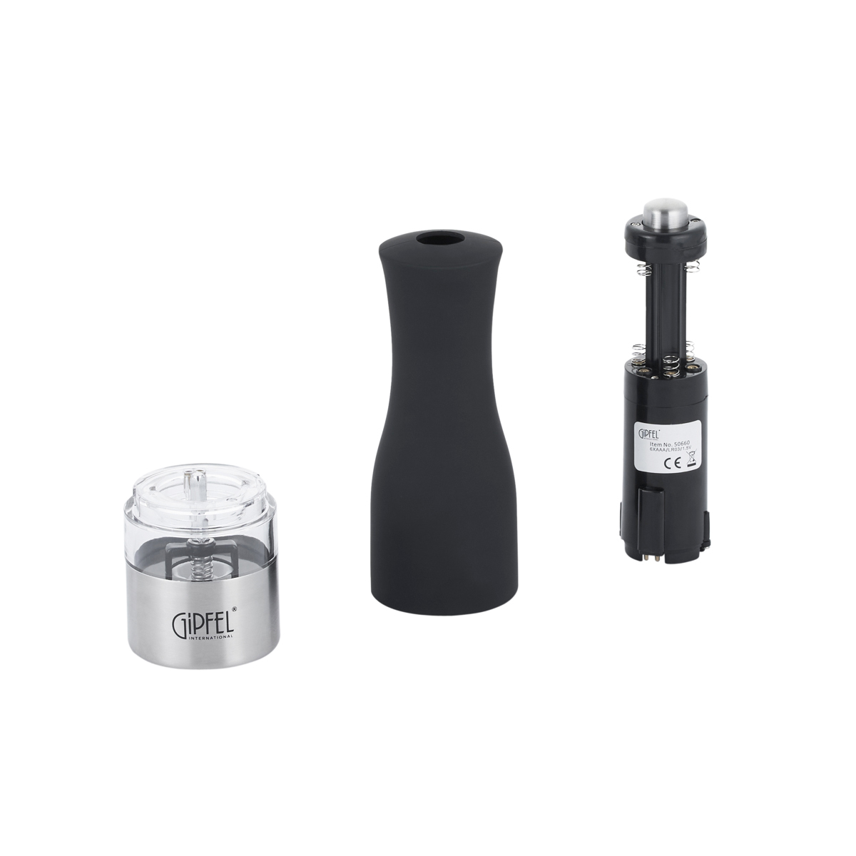 Мельница электрическая Gipfel CASTLE 50660 с подсветкой. Высота 19,5 см. Подходит для всех видов приправ, соли и перца. Цвет черный. Материал: нержавеющая сталь, пластик, керамика. Жернова керамические. Размер помола регулируется колёсиком под мельницей. Работает от 6 батареек (в комплект не входят).