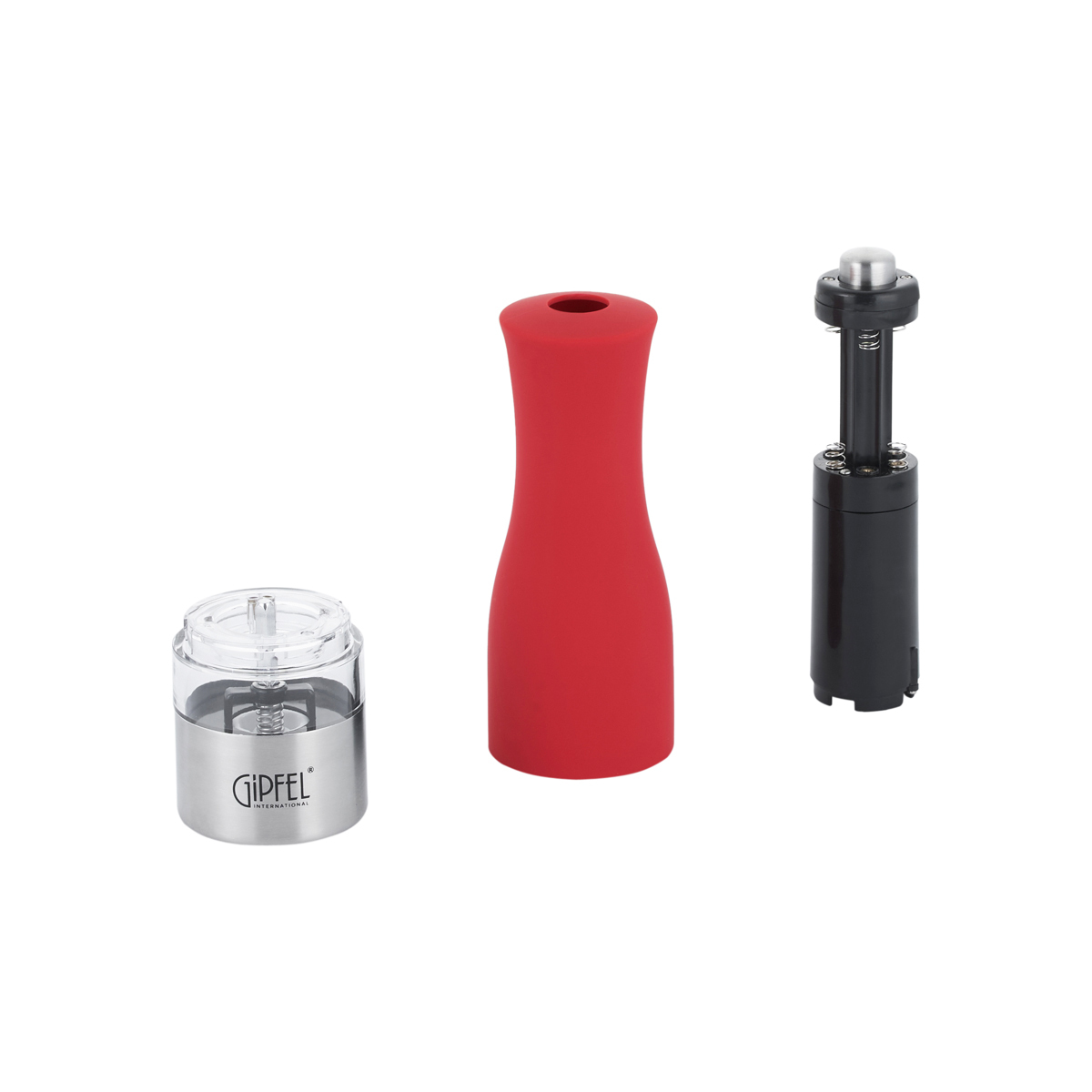 Мельница электрическая Gipfel CASTLE 50661 с подсветкой. Высота 19,5 см. Подходит для всех видов приправ, соли и перца. Цвет красный. Материал: нержавеющая сталь, пластик, керамика. Жернова керамические. Размер помола регулируется колёсиком под мельницей. Работает от 6 батареек (в комплект не входят).