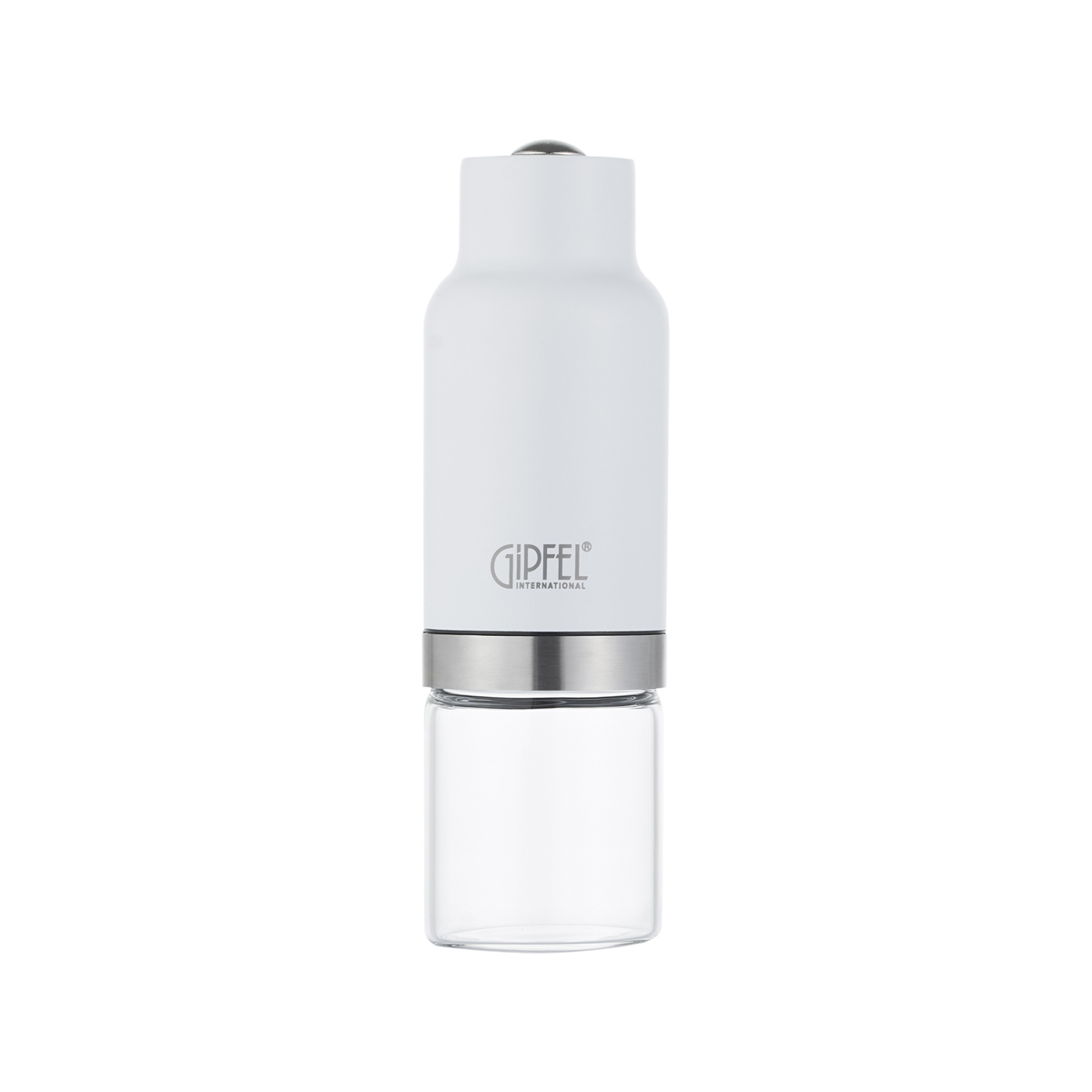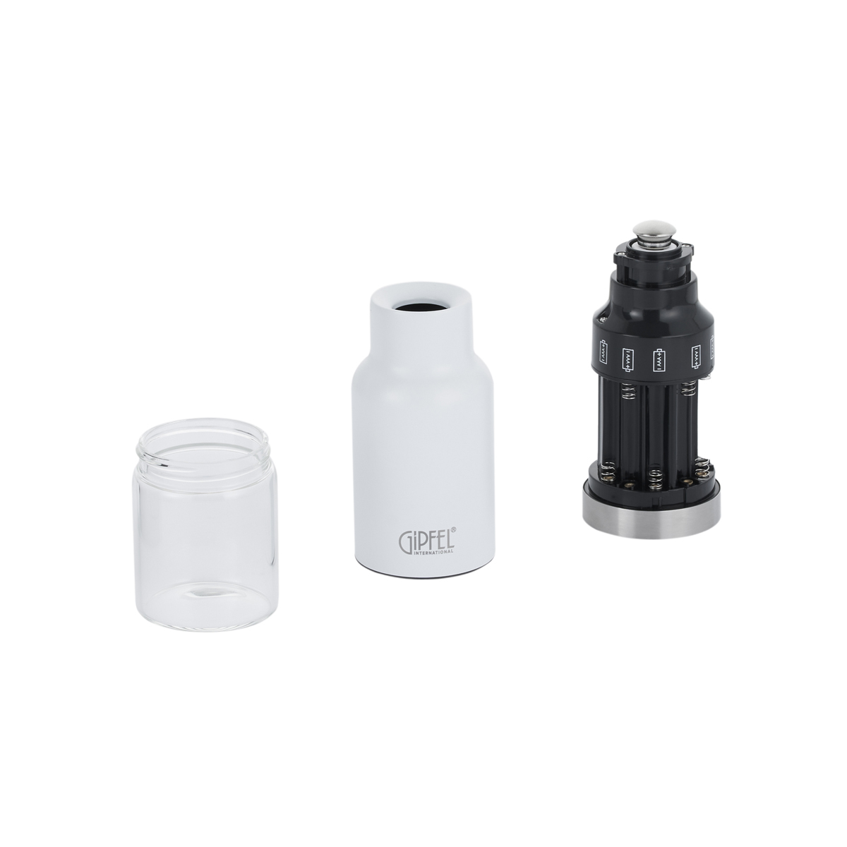 Мельница электрическая гравитационная Gipfel KING 50665. Подходит для всех видов приправ, соли и перца. У мельницы стеклянный корпус. Высота 18,5 см. Цвет белый. Материал: пластик, стекло, керамика. Жернова керамические. Размер помола регулируется колёсиком. Работает от 6 батареек (в комплект не входят).
