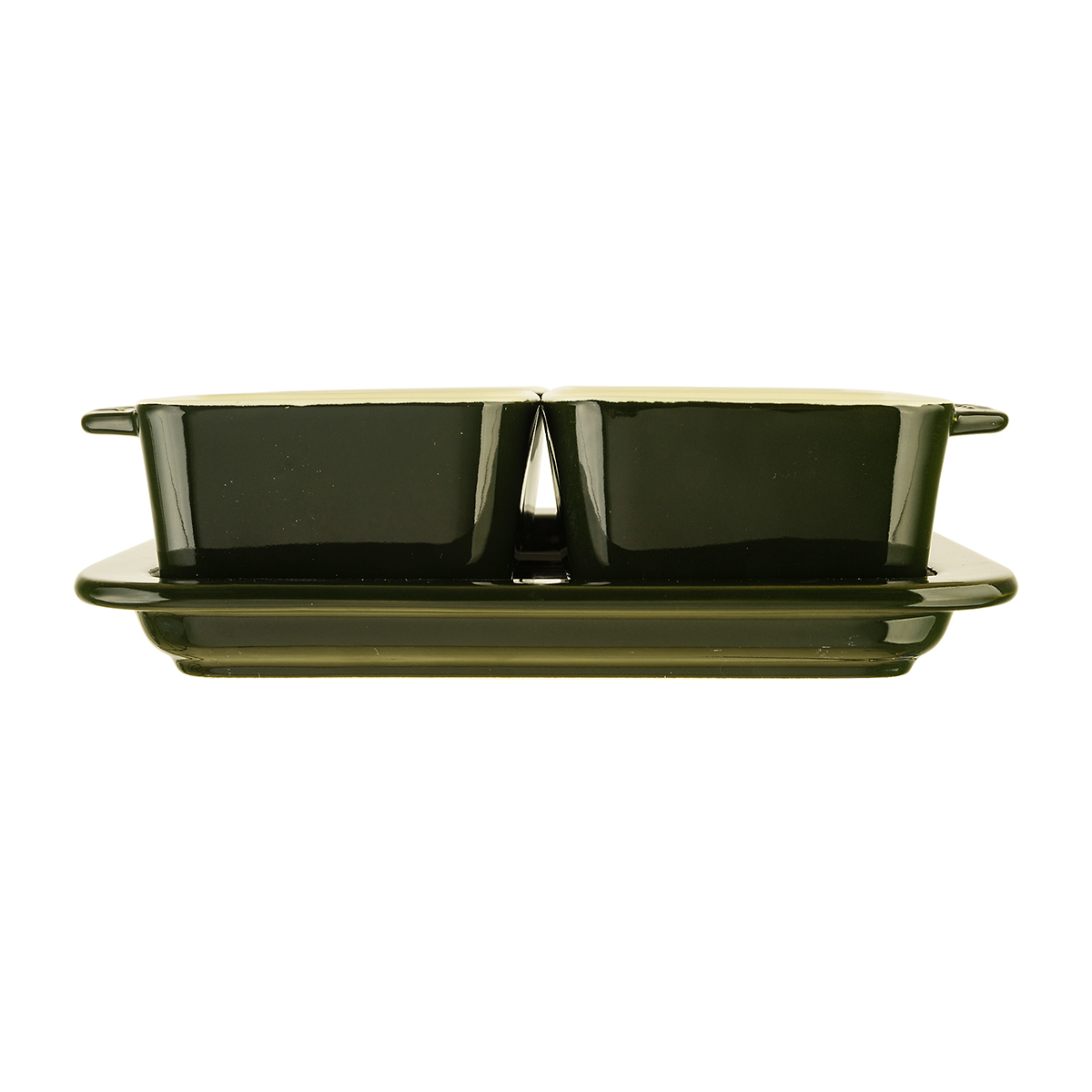 Менажница Gipfel Majolica 3921 состоит из 5 предметов: основа-поднос 18.5x18.5 см и 4 квадратных емкости размером 8х4,5 см. Изготовлена из жаропрочной керамики в темно-зеленой глазури.