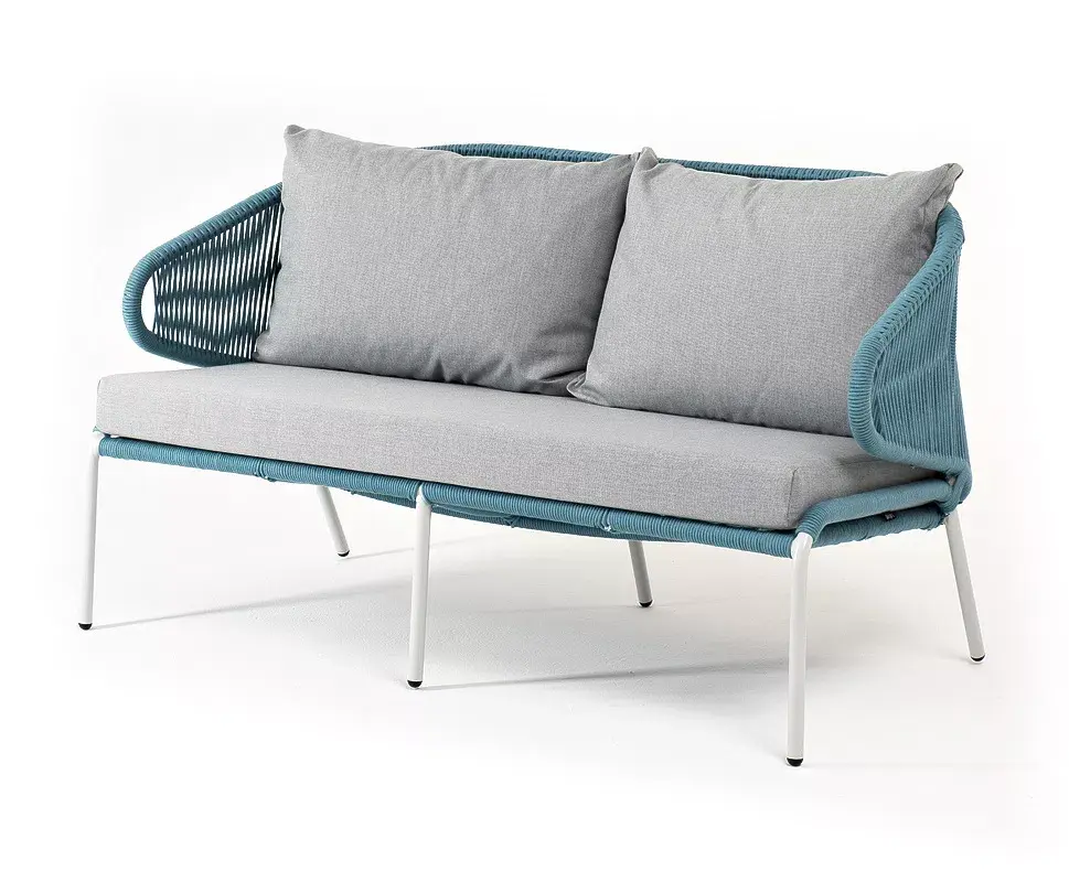 Диван имеет алюминиевый каркас, окрашенный порошковой краской в светло-серый (RAL7035) цвет. Боковины каркаса и спинка вручную оплетены роупом - эластичными синтетическими лентами, изготовленными из высокопрочных полиэфирных волокон. Цвет оплетки – бирюзовый.