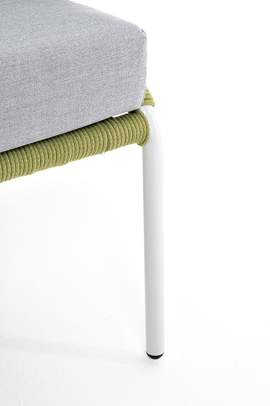 Диван имеет алюминиевый каркас, окрашенный порошковой краской в светло-серый (RAL7035) цвет. Боковины каркаса и спинка вручную оплетены роупом - эластичными синтетическими лентами, изготовленными из высокопрочных полиэфирных волокон. Цвет оплетки – салатовый меланж.