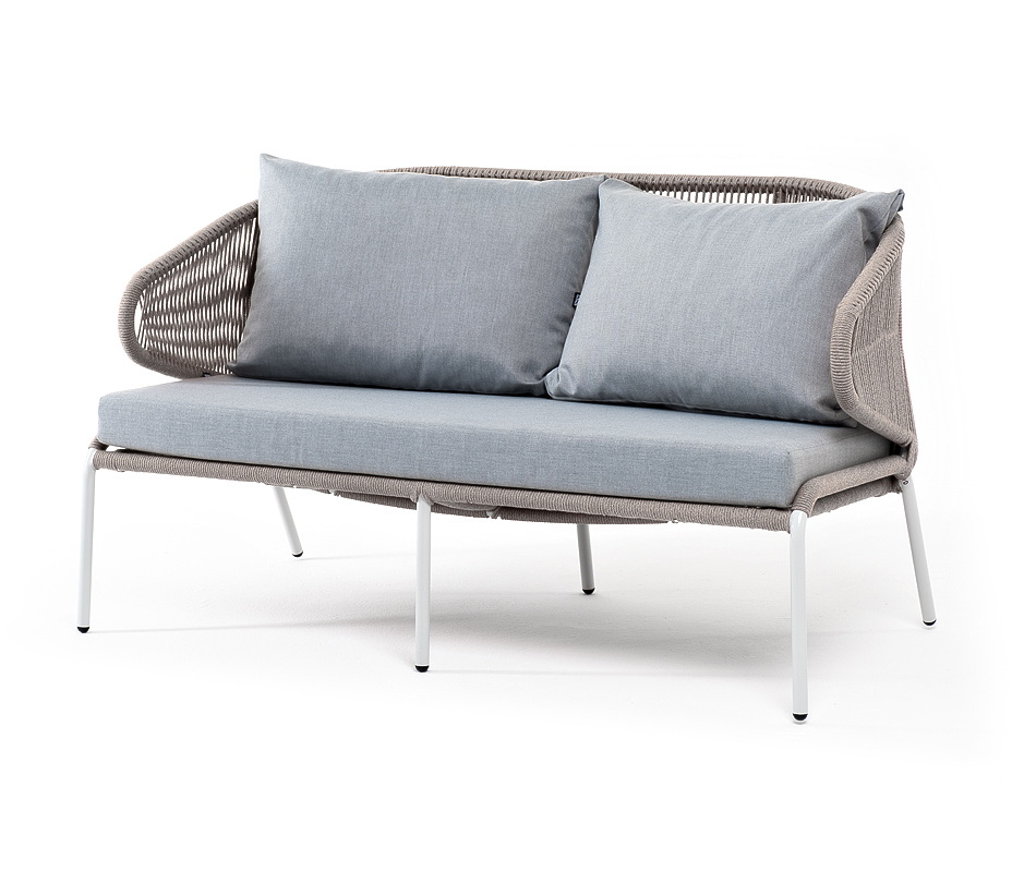 Диван имеет алюминиевый каркас, окрашенный порошковой краской в светло-серый (RAL7035) цвет. Боковины каркаса и спинка вручную оплетены роупом - эластичными синтетическими лентами, изготовленными из высокопрочных полиэфирных волокон. Цвет оплетки – бежевый.