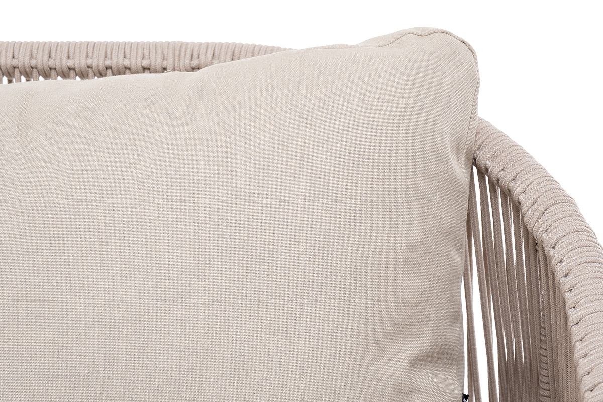 Диван имеет алюминиевый каркас, окрашенный порошковой краской в белый цвет. Боковины каркаса и спинка вручную оплетены роупом - эластичными синтетическими лентами, изготовленными из высокопрочных полиэфирных волокон. Цвет оплетки – бежевый.
