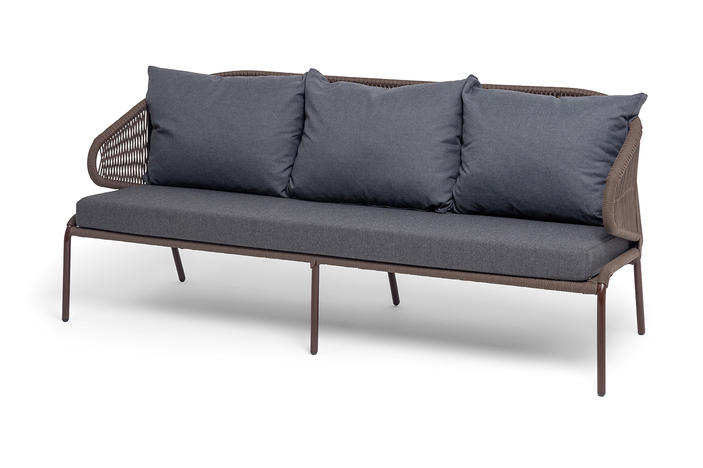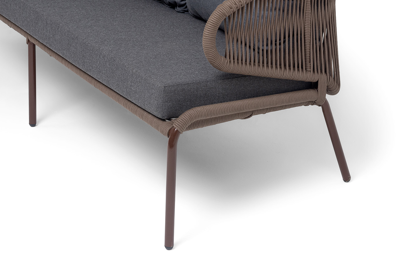 Диван имеет алюминиевый каркас, окрашенный порошковой краской в коричневый (RAL8016) цвет. Боковины каркаса и спинка вручную оплетены роупом - эластичными синтетическими лентами, изготовленными из высокопрочных полиэфирных волокон. Цвет оплетки – коричневый.