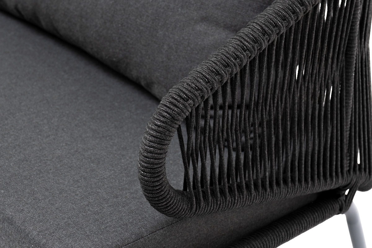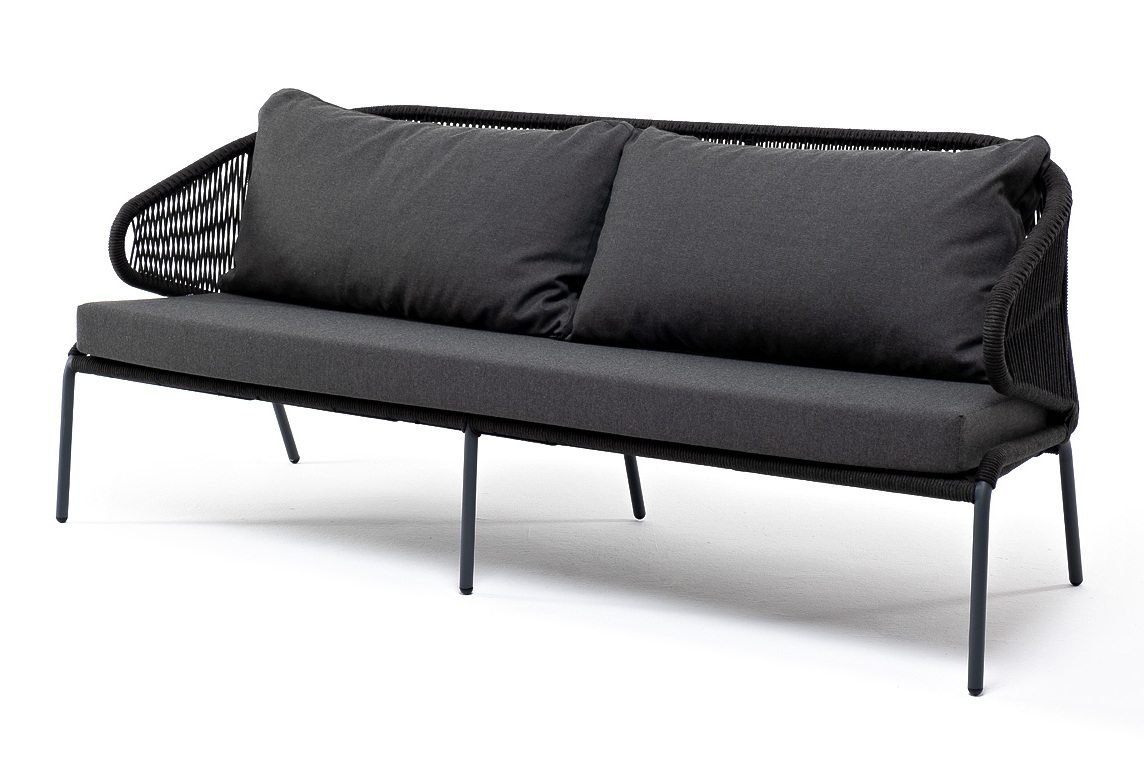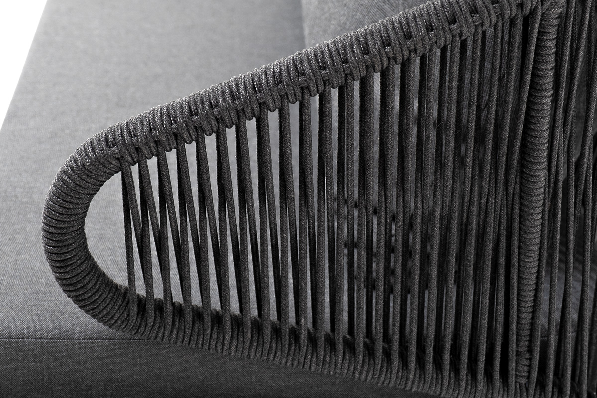 Диван имеет алюминиевый каркас, окрашенный порошковой краской в темно-серый (RAL7024) цвет. Боковины каркаса и спинка вручную оплетены роупом - эластичными синтетическими лентами, изготовленными из высокопрочных полиэфирных волокон. Цвет оплетки – темно-серый.