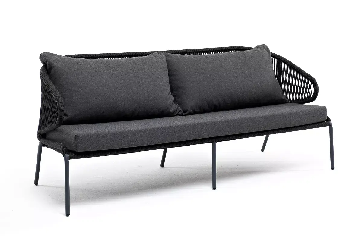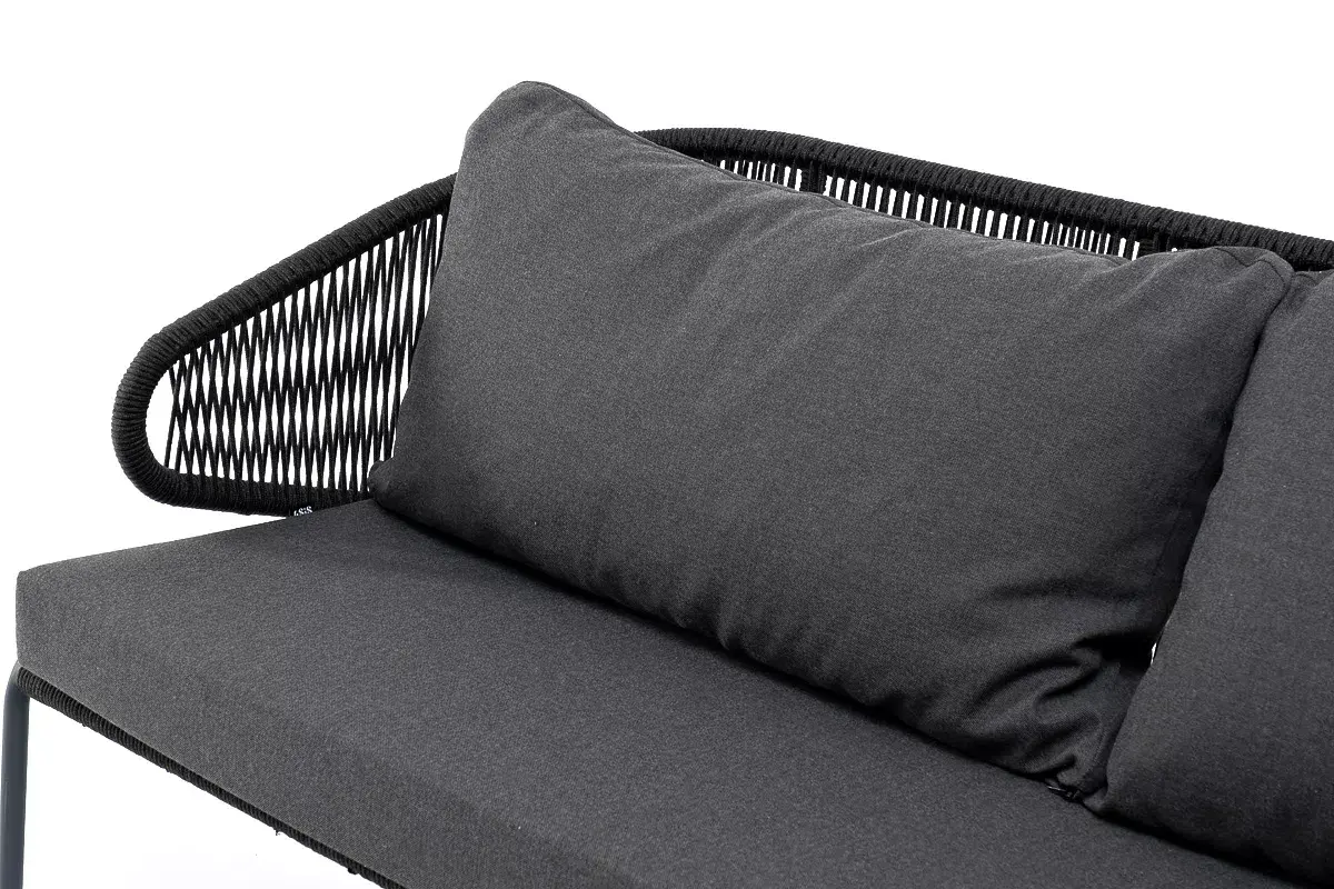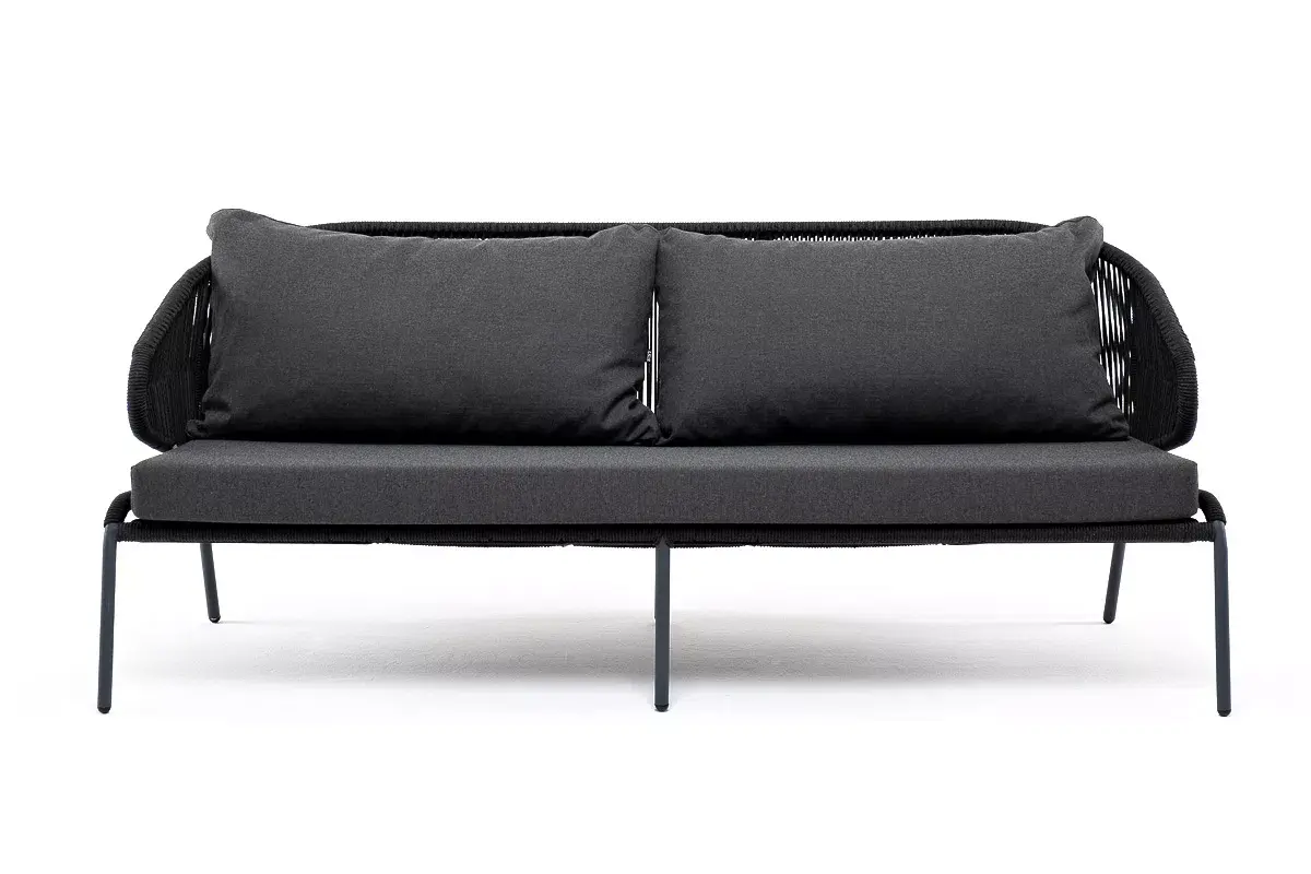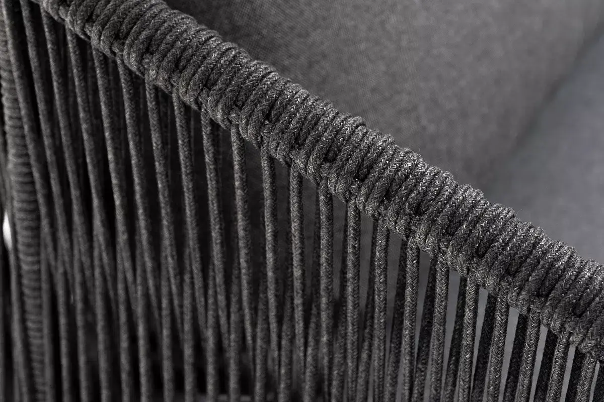 Диван имеет алюминиевый каркас, окрашенный порошковой краской в темно-серый (RAL7024) цвет. Боковины каркаса и спинка вручную оплетены роупом - эластичными синтетическими лентами, изготовленными из высокопрочных полиэфирных волокон. Цвет оплетки – темно-серый.