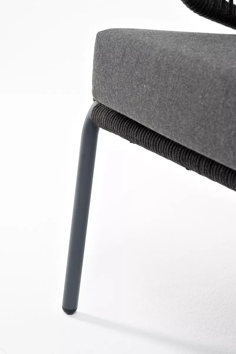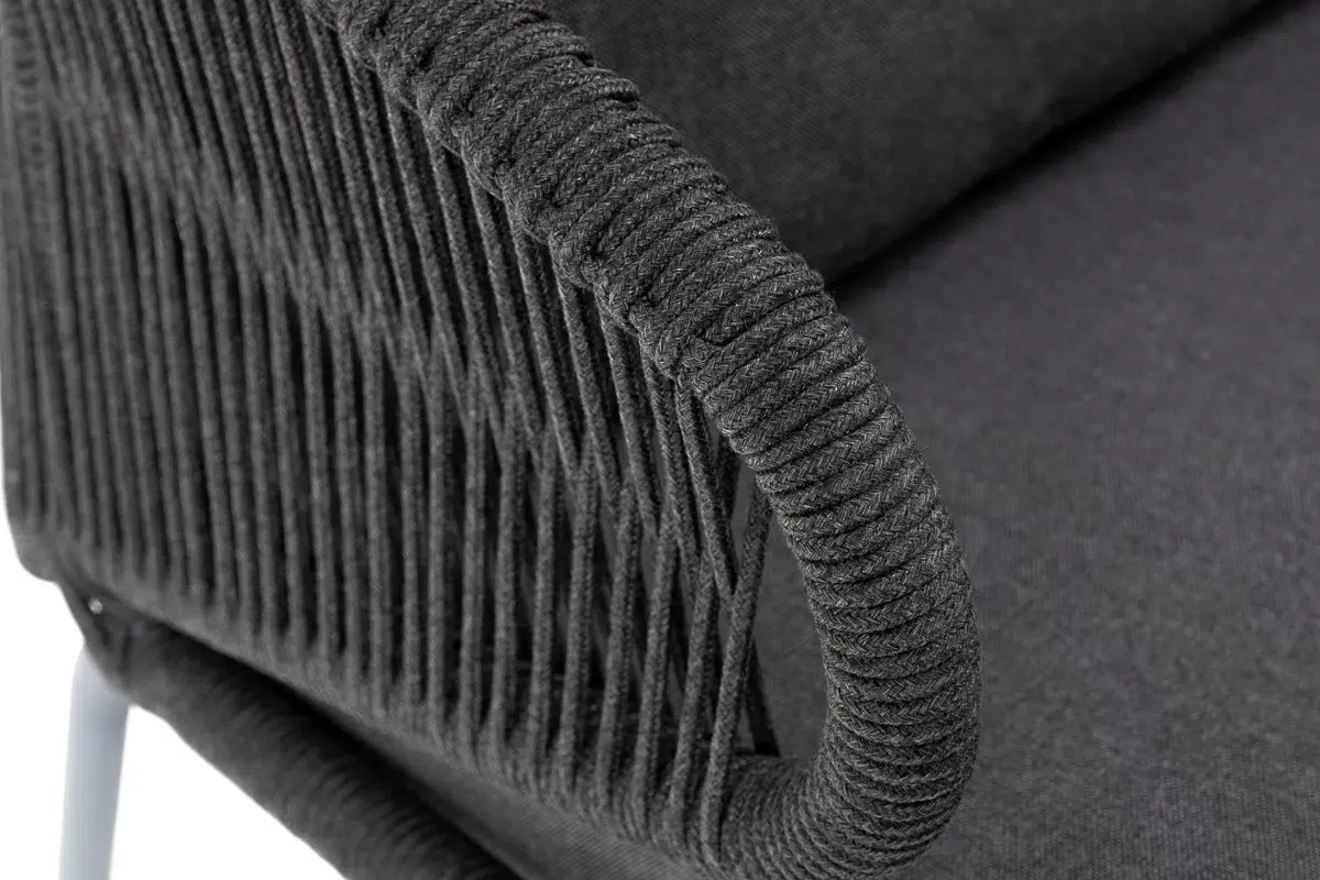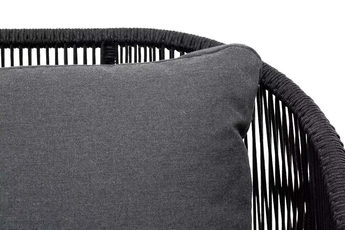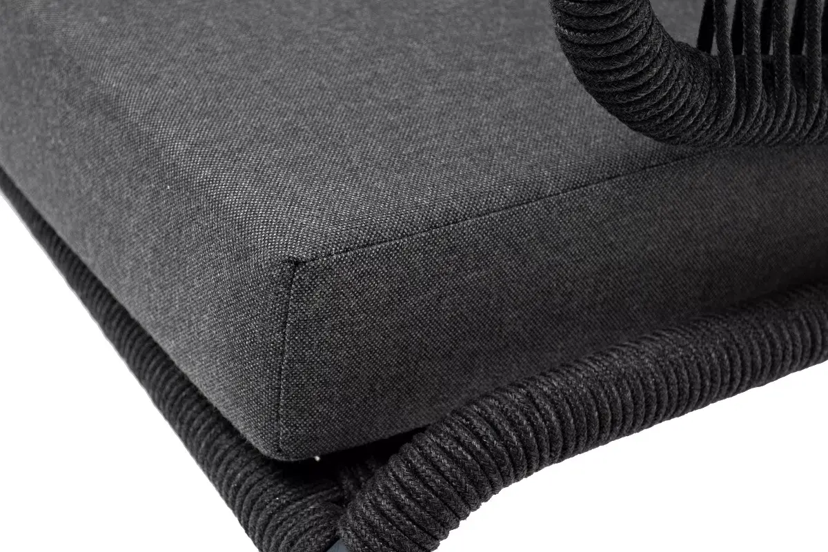 Диван имеет алюминиевый каркас, окрашенный порошковой краской в темно-серый (RAL7024) цвет. Боковины каркаса и спинка вручную оплетены роупом - эластичными синтетическими лентами, изготовленными из высокопрочных полиэфирных волокон. Цвет оплетки – темно-серый.