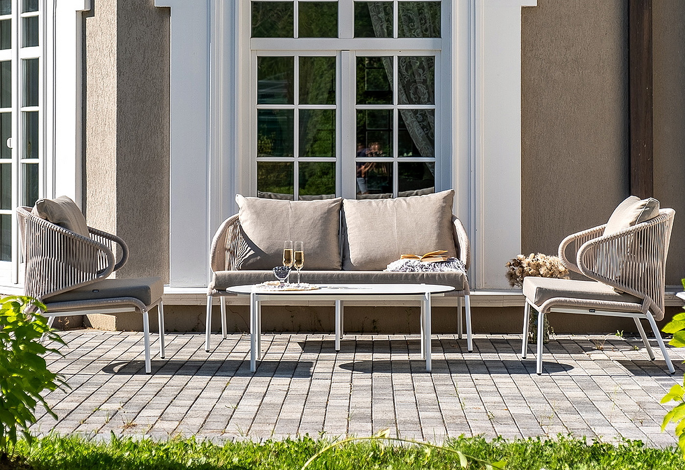 Каркас уличной мебели выполнен из износостойкого алюминия. Его дополняет бежевая ручная оплетка, изготовленная на основе эластичных синтетических лент из полиэфирных волокон высокой прочности (роупа).