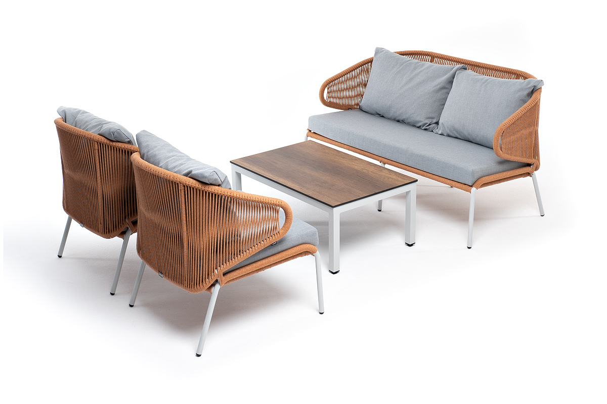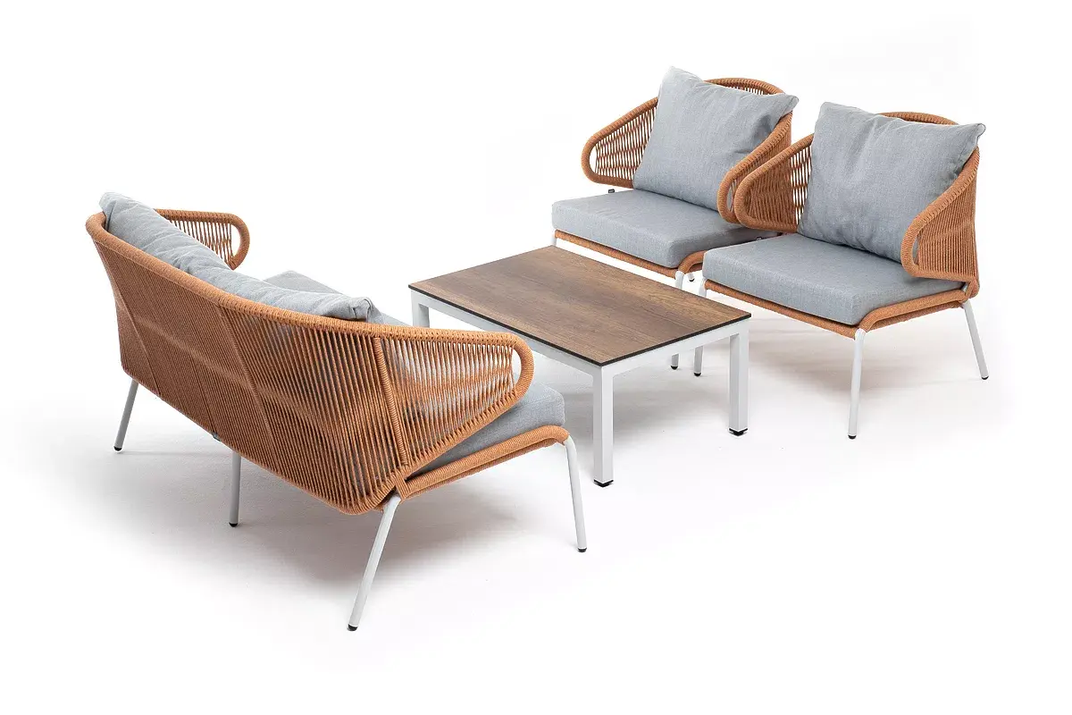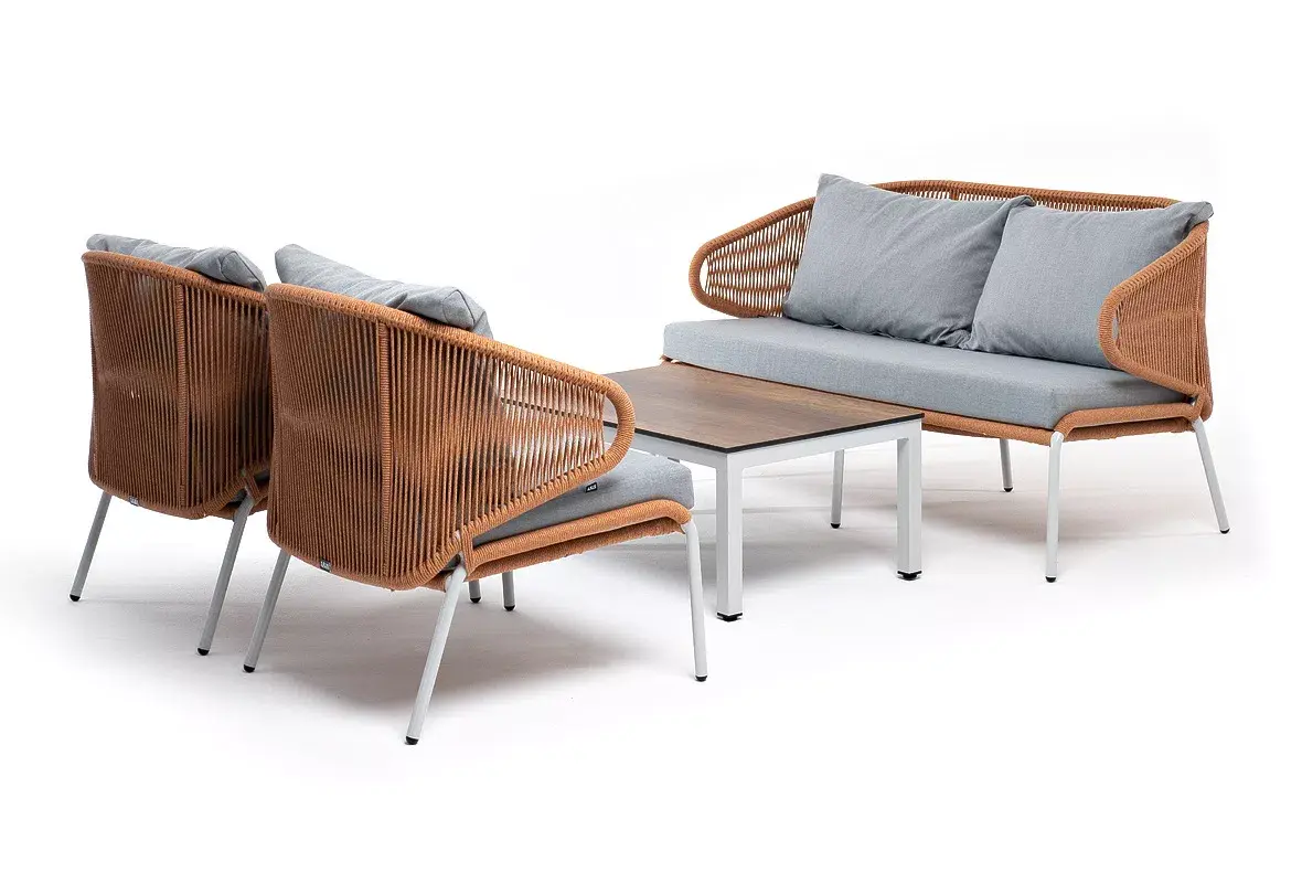 Каркас уличной мебели выполнен из износостойкого алюминия. Его дополняет оплетка цвета оранжевый меланж, изготовленная на основе эластичных синтетических лент из полиэфирных волокон высокой прочности.