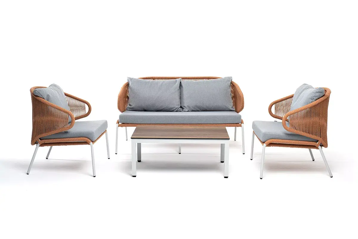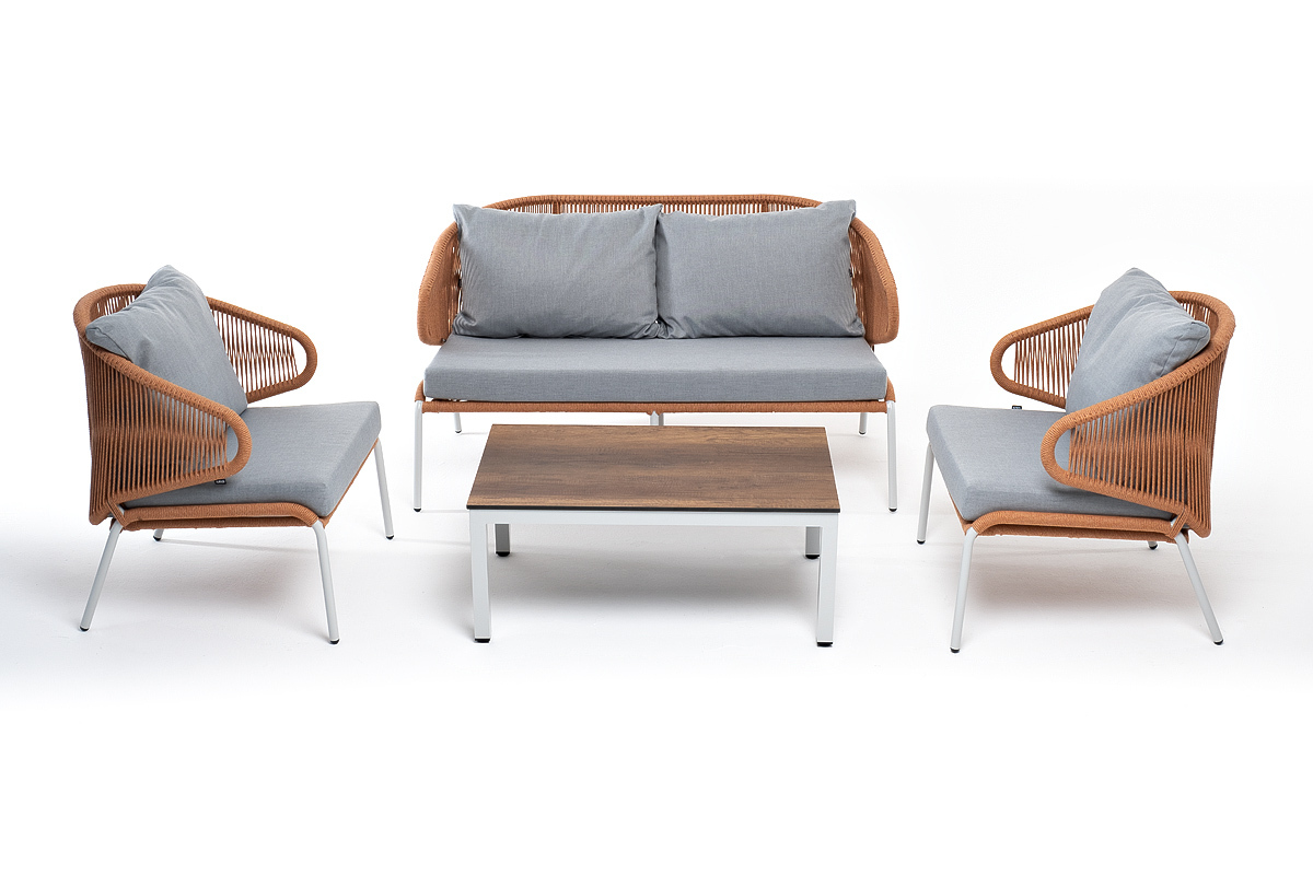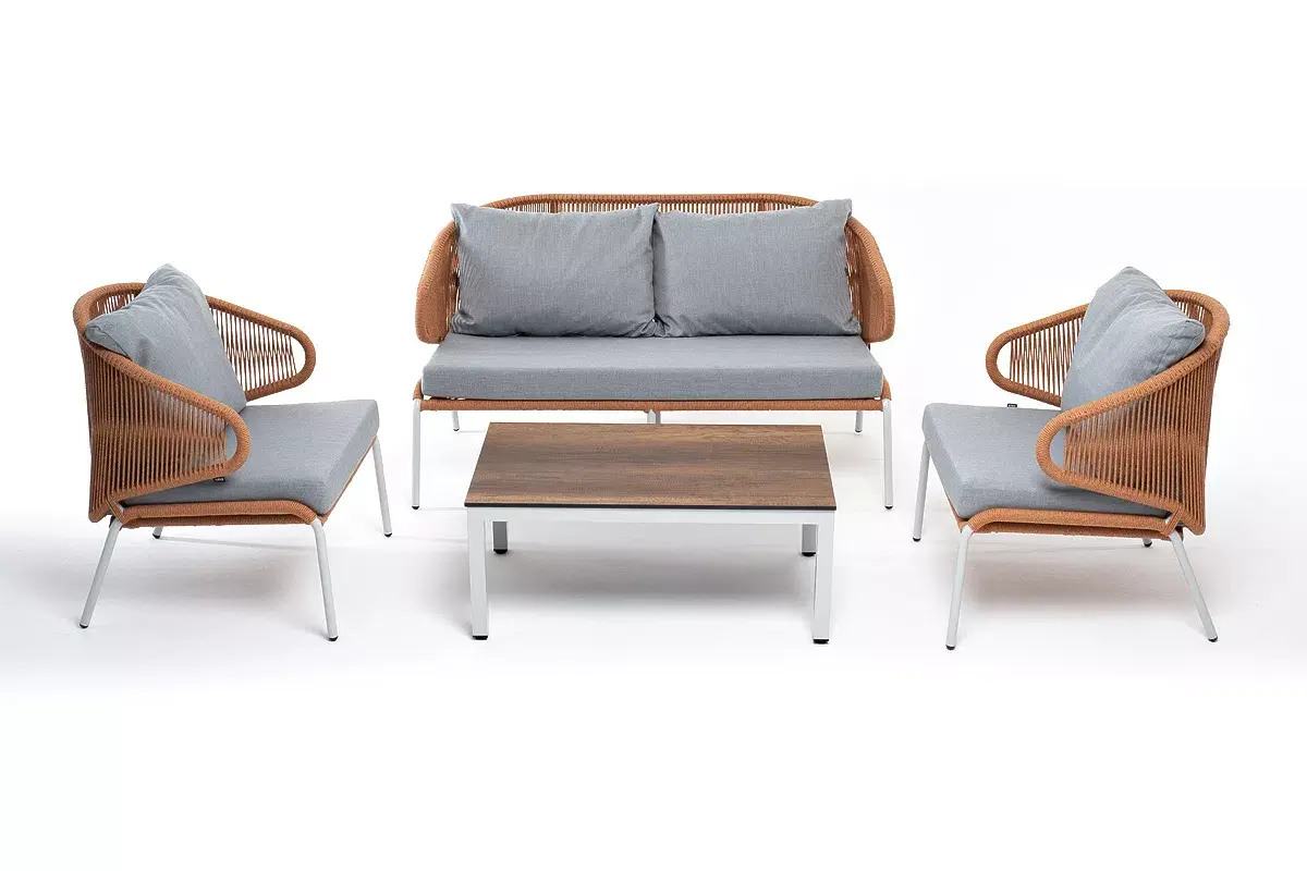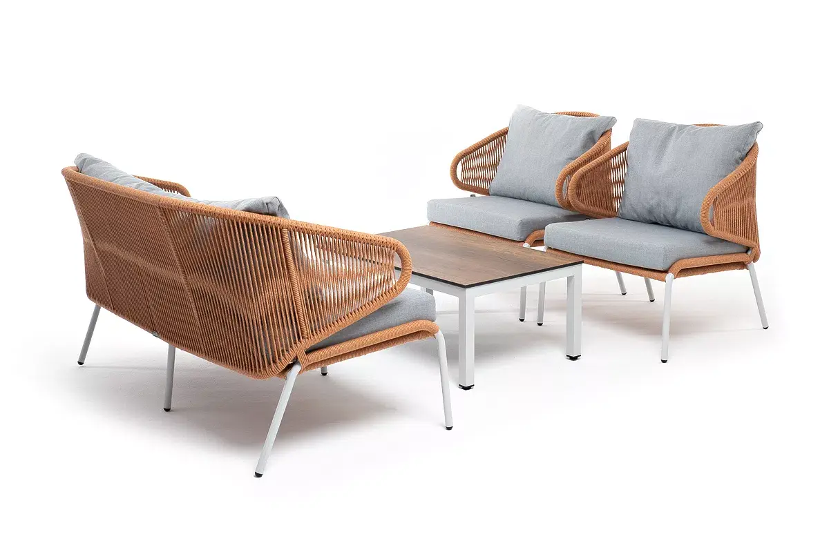 Каркас уличной мебели выполнен из износостойкого алюминия. Его дополняет оплетка цвета оранжевый меланж, изготовленная на основе эластичных синтетических лент из полиэфирных волокон высокой прочности.