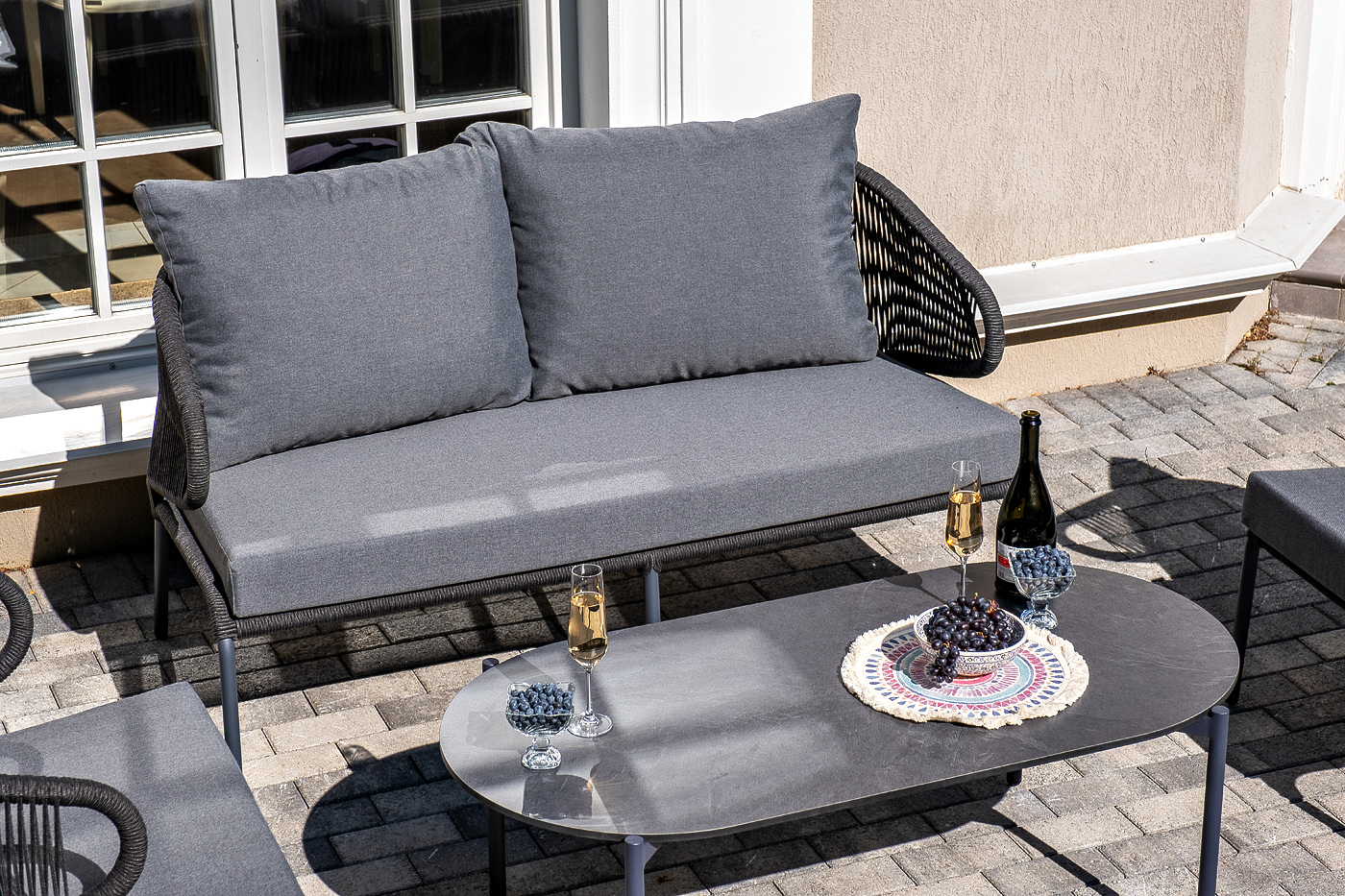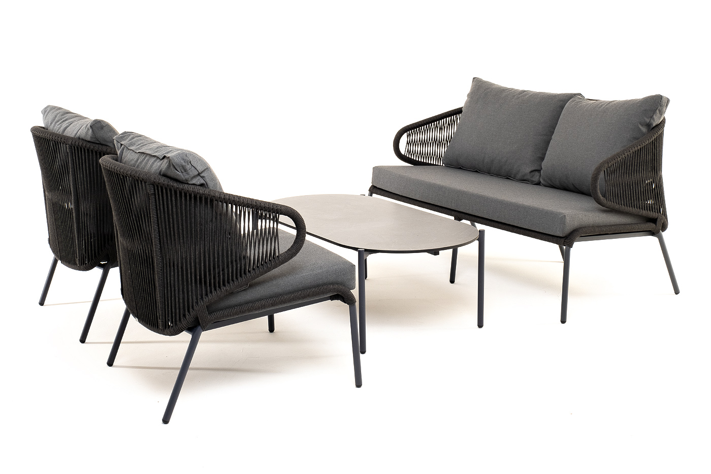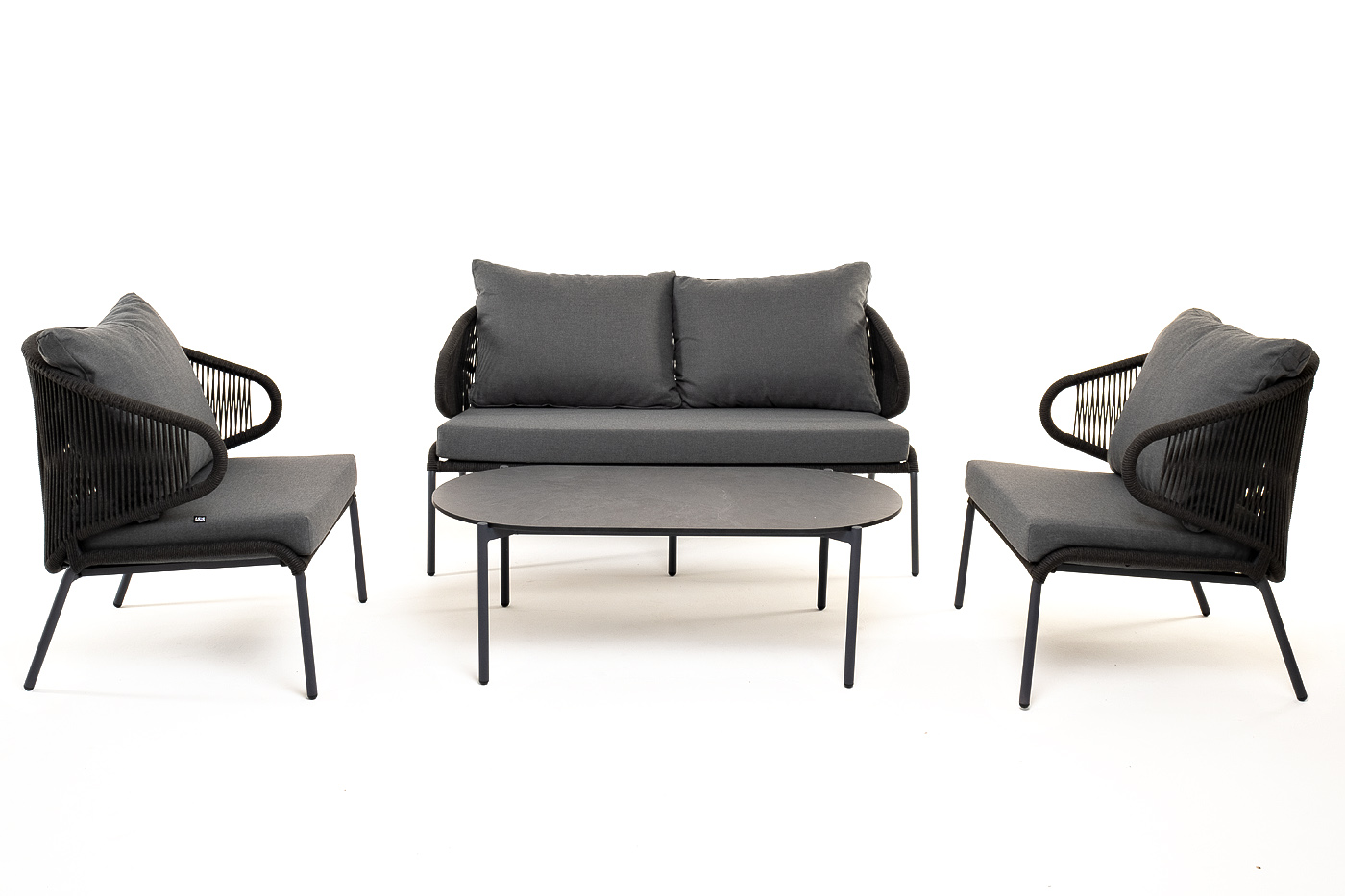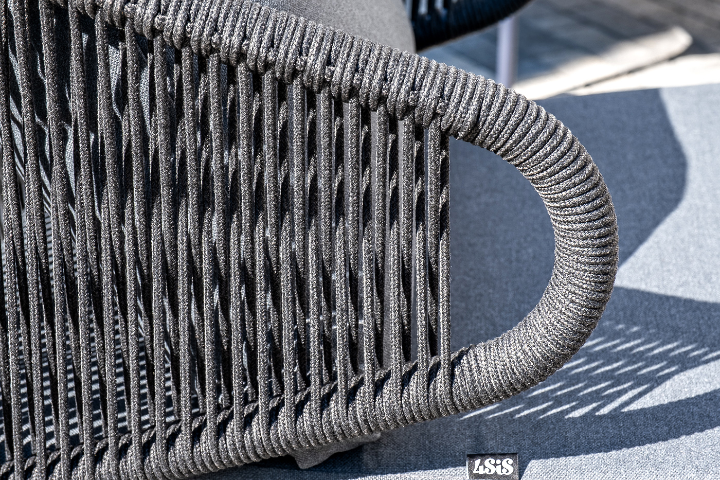 Каркас уличной мебели выполнен из износостойкого алюминия. Его дополняет темно-серая ручная оплетка, изготовленная на основе эластичных синтетических лент из полиэфирных волокон высокой прочности (роупа).