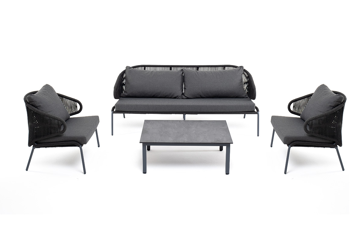 Каркас уличной мебели выполнен из износостойкого алюминия. Его дополняет темно-серая ручная оплетка, изготовленная на основе эластичных синтетических лент из полиэфирных волокон высокой прочности (роупа).