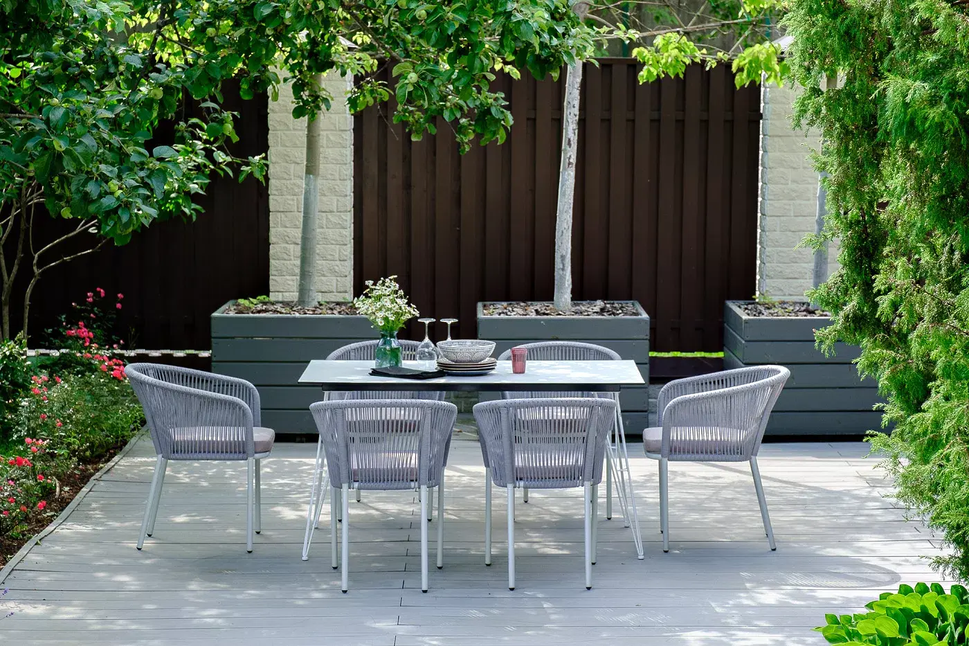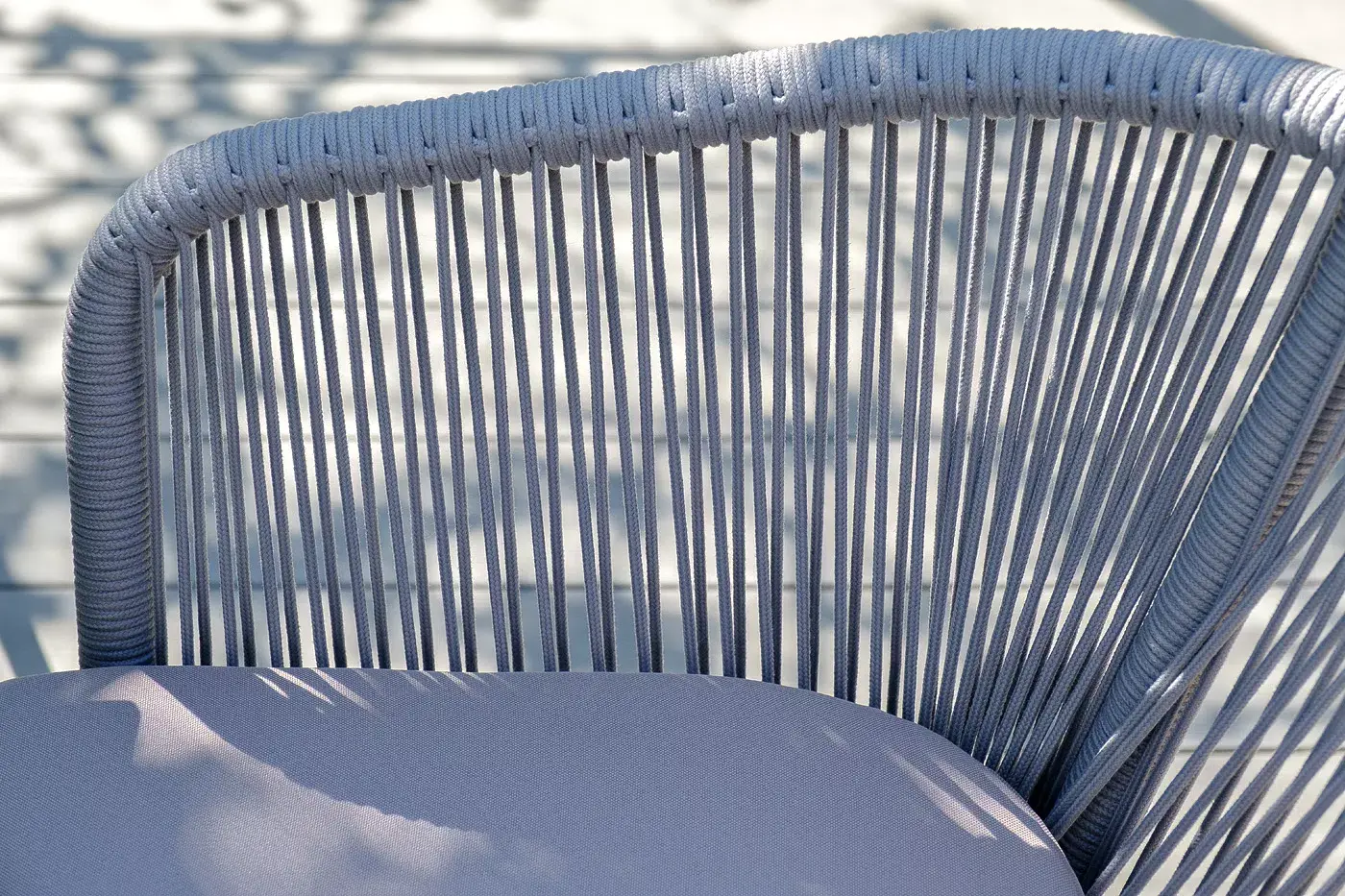 Каркас стульев белого цвета - алюминиевый, оплетен вручную современным материалом - роупом светло-серого оттенка. Это эластичные синтетические ленты из высокопрочных полиэфирных волокон. В комплект входят подушки со съёмными водоотталкивающими чехлами.