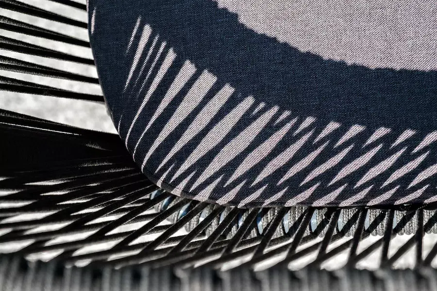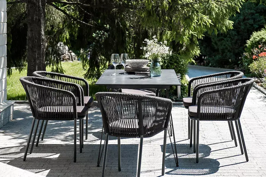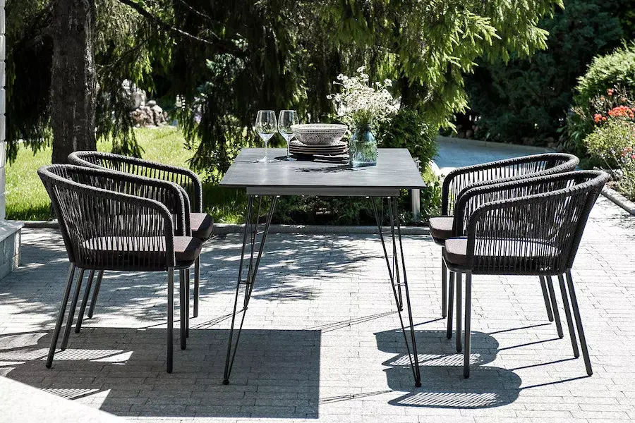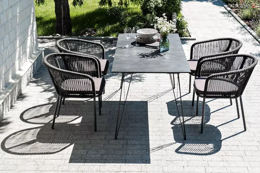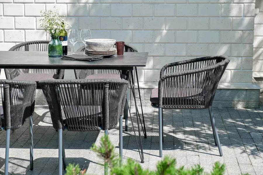 Каркас стульев - алюминиевый, оплетен вручную современным материалом - роупом. Это эластичные синтетические ленты из высокопрочных полиэфирных волокон. В комплект входят подушки со съёмными водоотталкивающими чехлами серого цвета.