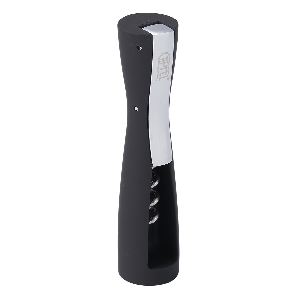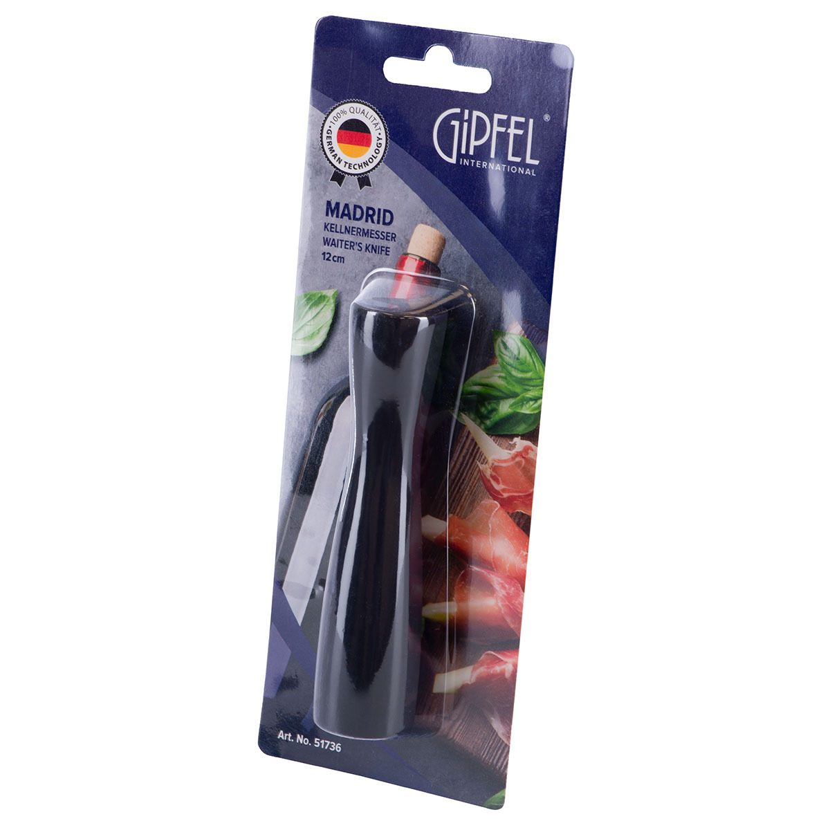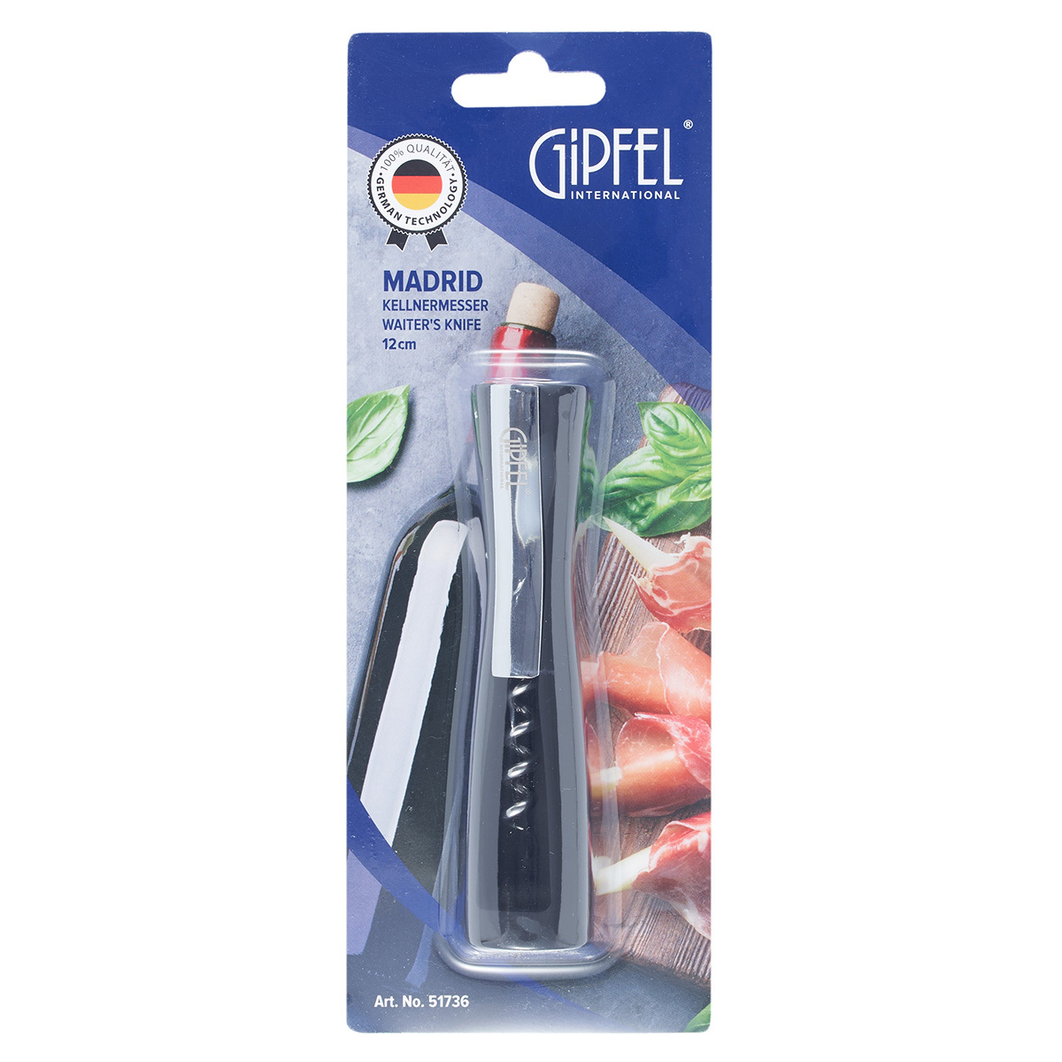 Многофункциональный складной штопор Gipfel Madrid 51736. Размер 12 см. Изготовлен из нержавеющей стали и цинкового сплава. Ручка пластиковая черного цвета.