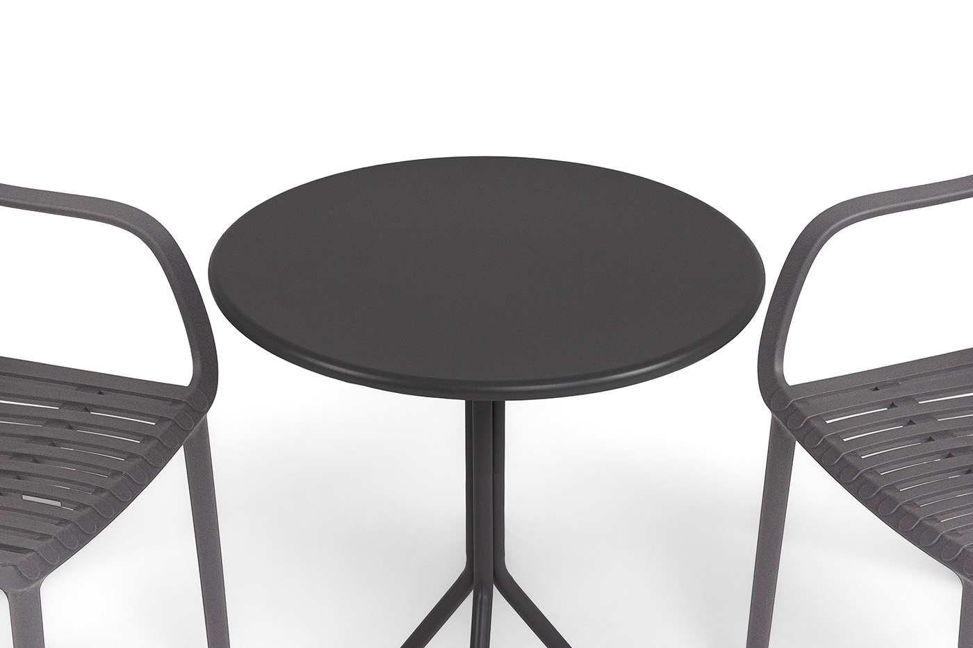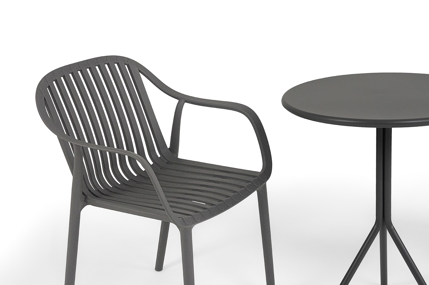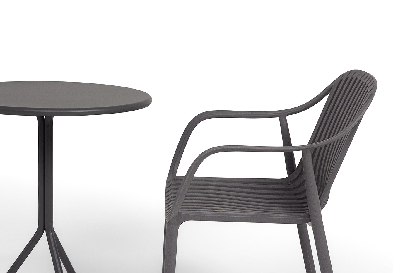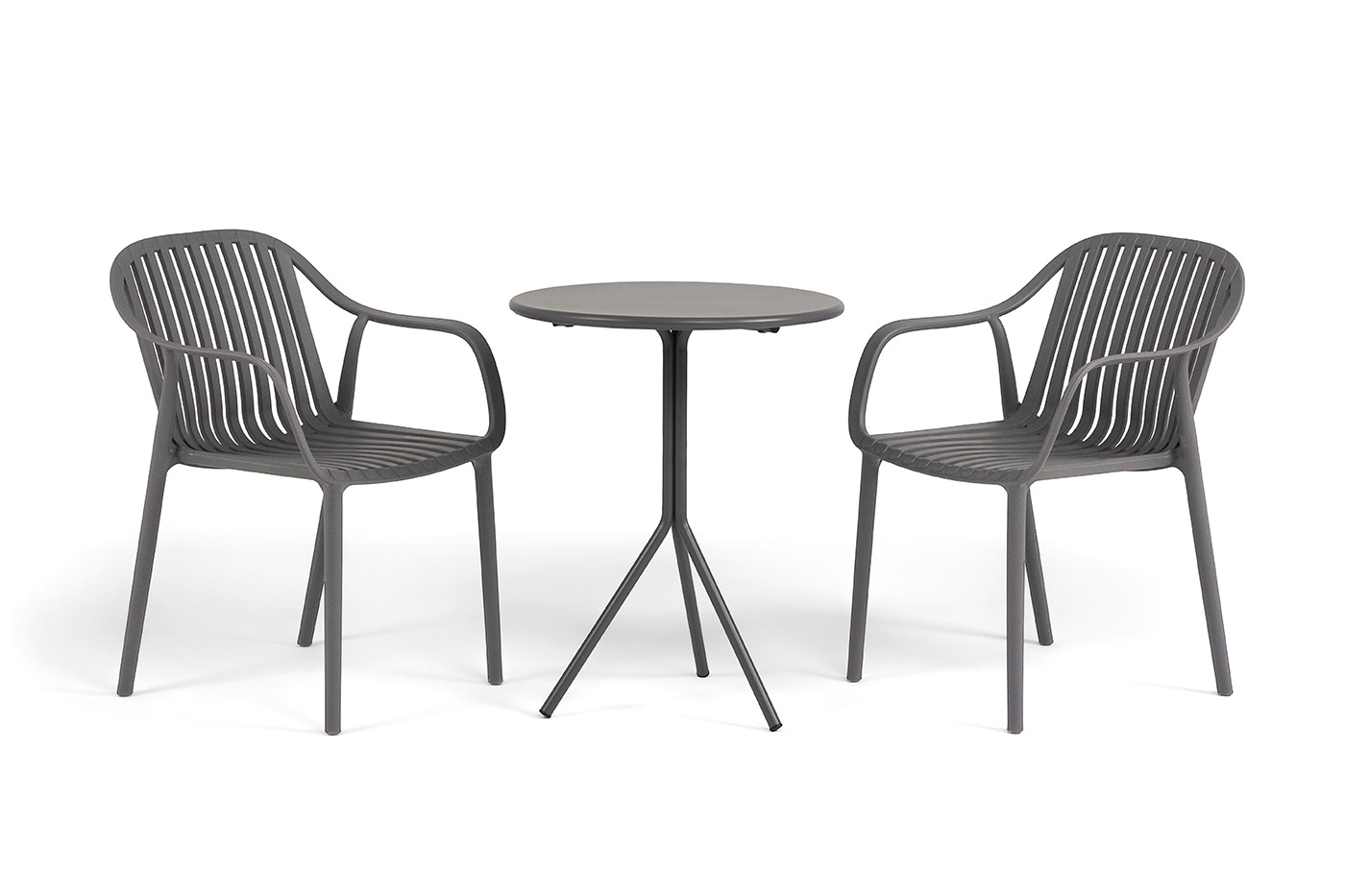 Стулья изготовлены из полипропилена, прочного и стойкого пластика, устойчивого к УФ-излучению, благодаря этому стул сохраняет свой первоначальный вид и не выцветает на солнце даже несмотря на активную эксплуатацию. Цвет - темно-серый.