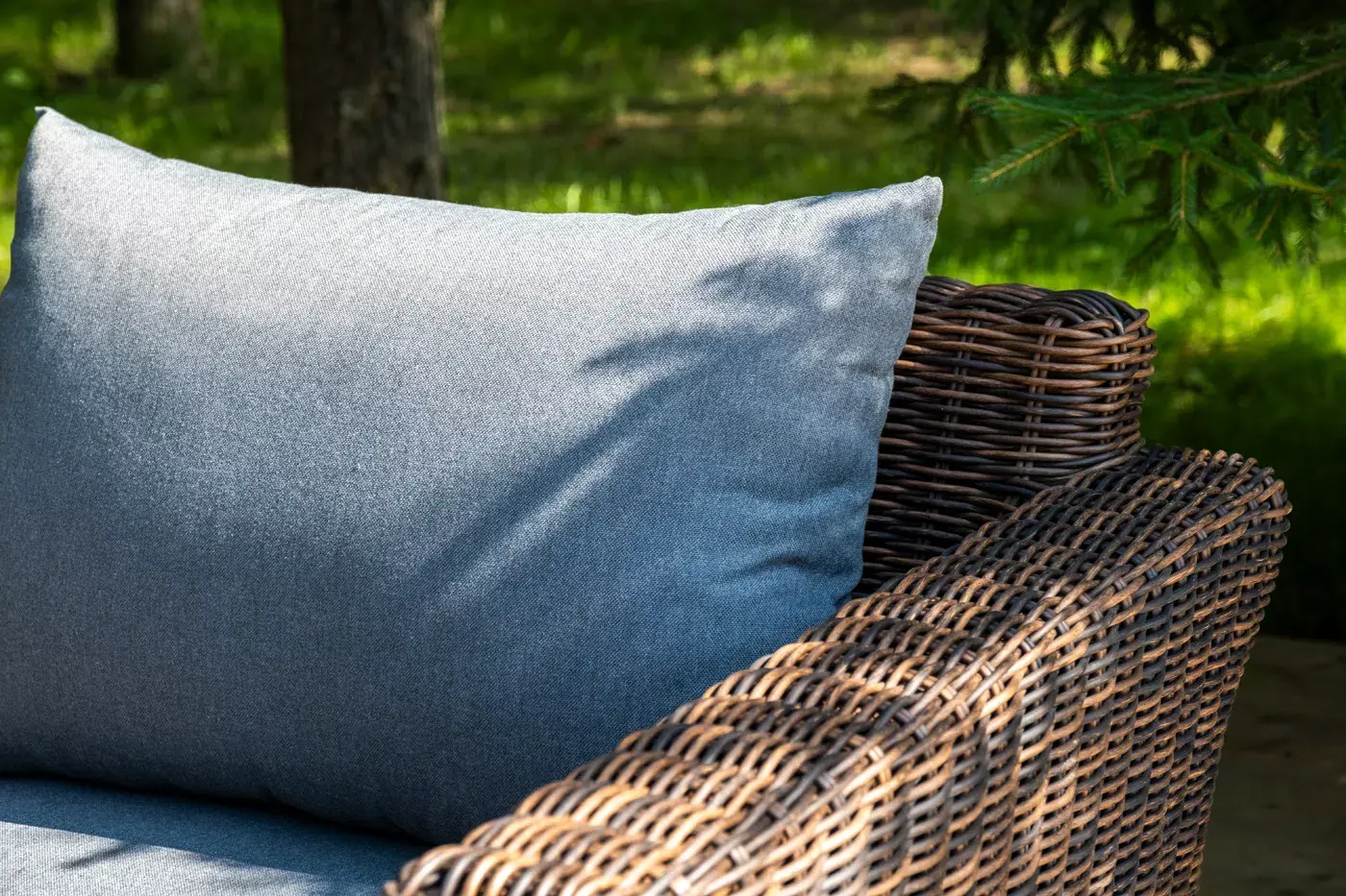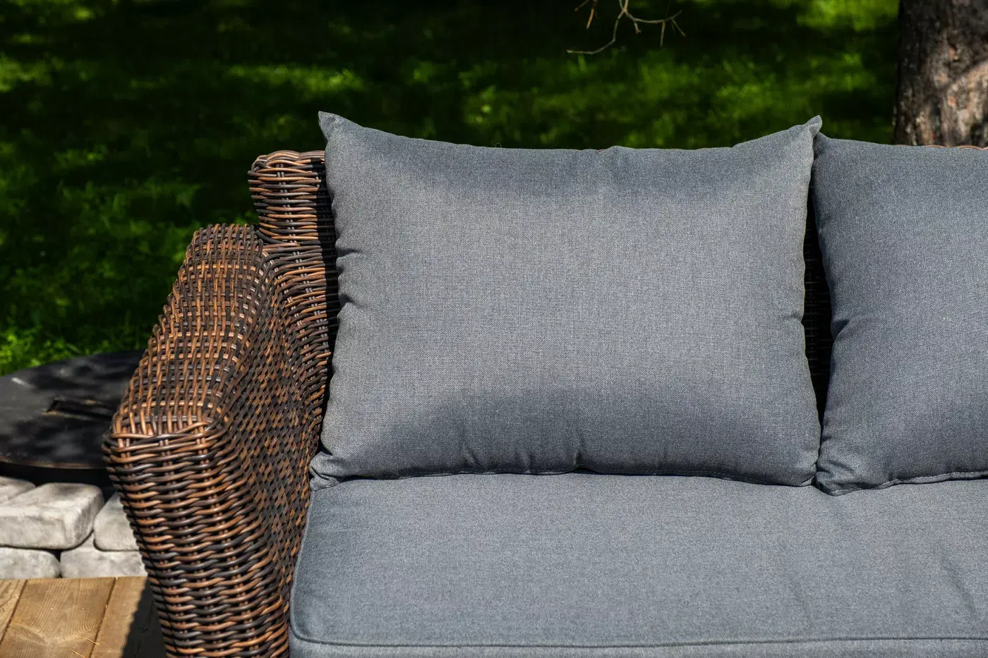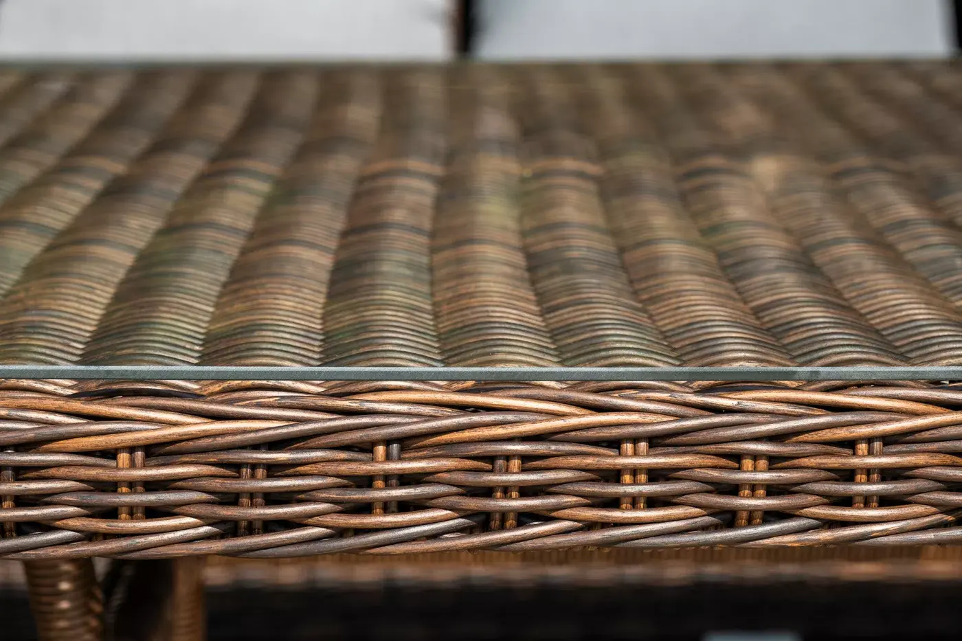Каркас мебели изготовлен из алюминия, вручную оплетенного искусственным ротангом. Материал столешницы – ударопрочное стекло 5мм. Комплект представлен в насыщенном шоколадном оттенке с серыми подушками со съёмными чехлами.