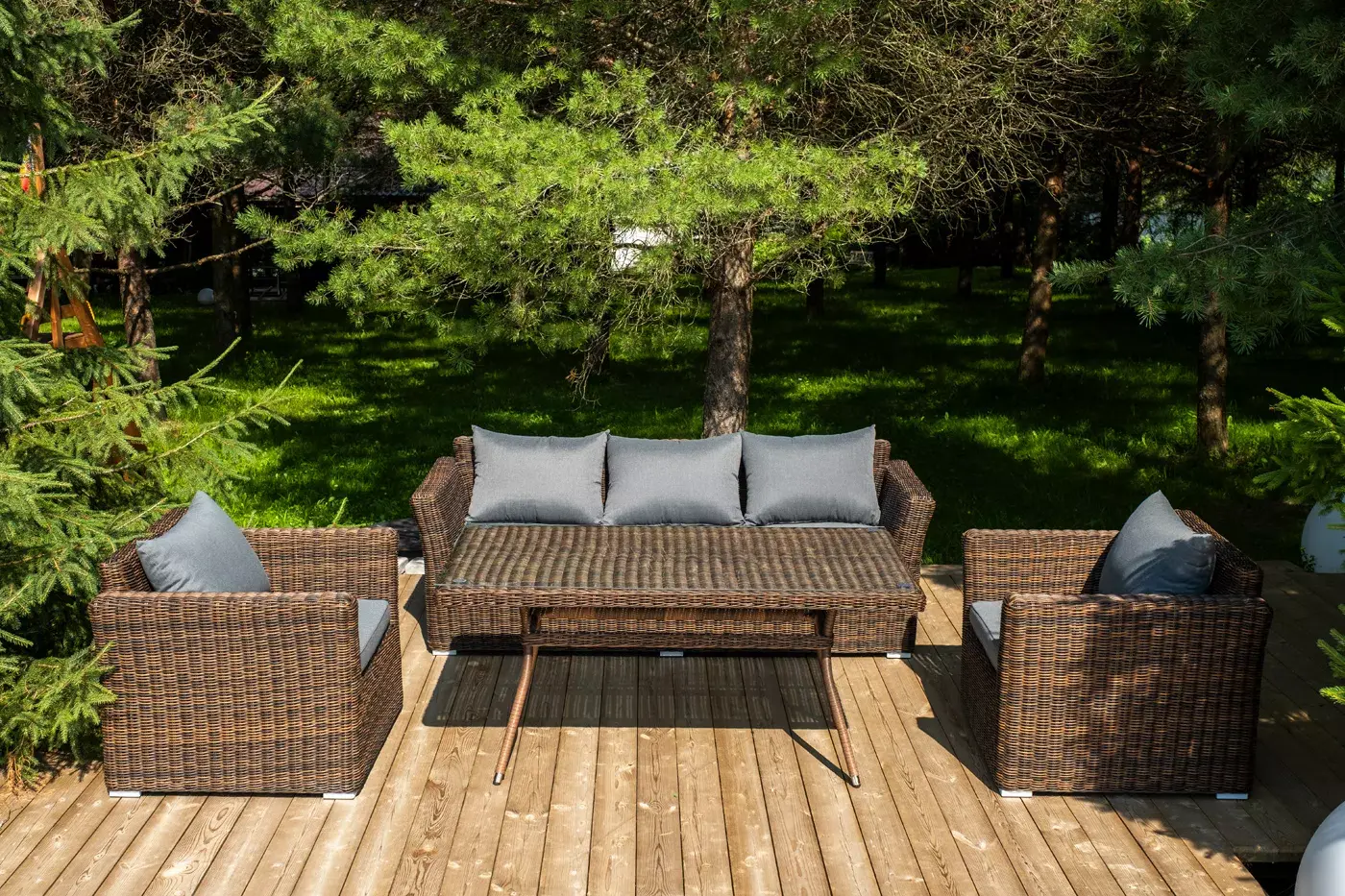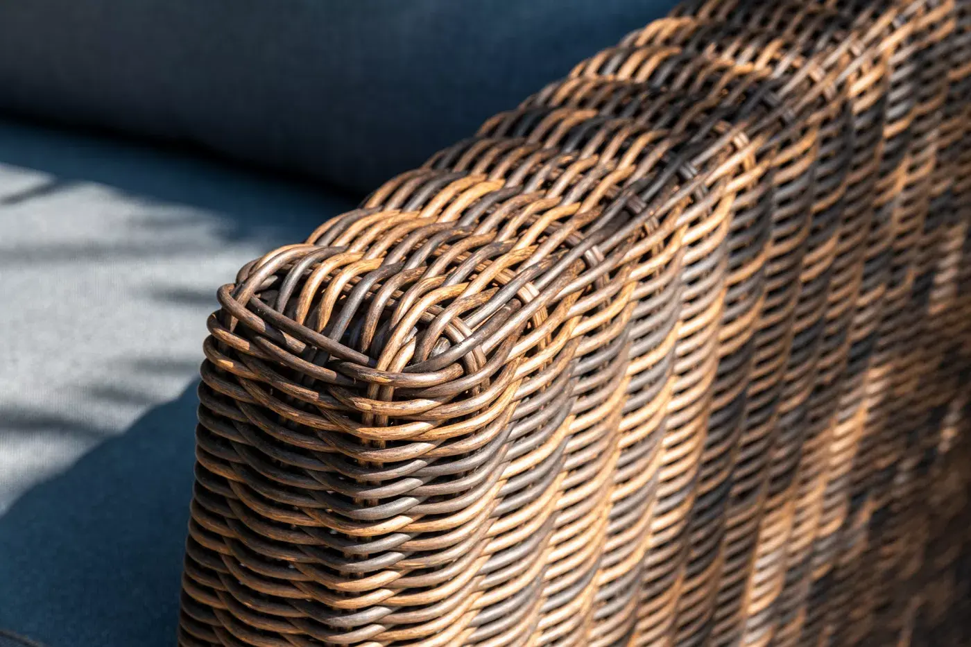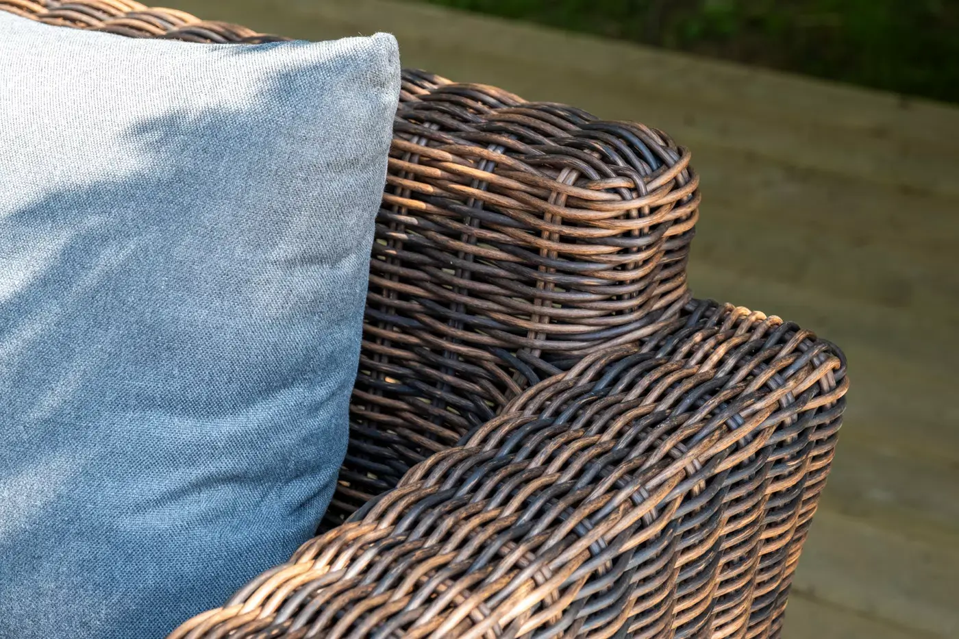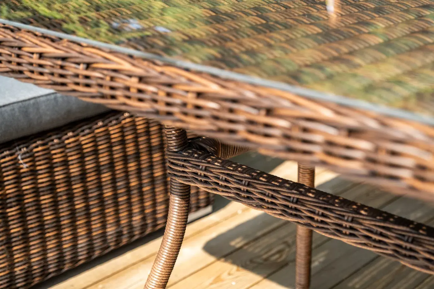 Каркас мебели изготовлен из алюминия, вручную оплетенного искусственным ротангом. Материал столешницы – ударопрочное стекло 5мм. Комплект представлен в насыщенном шоколадном оттенке с серыми подушками со съёмными чехлами.