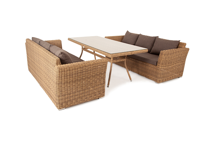 Лаконичная обеденная группа премиум-класса «Мокко Дабл» из искусственного ротанга ручного плетения натурального соломенного оттенка.
