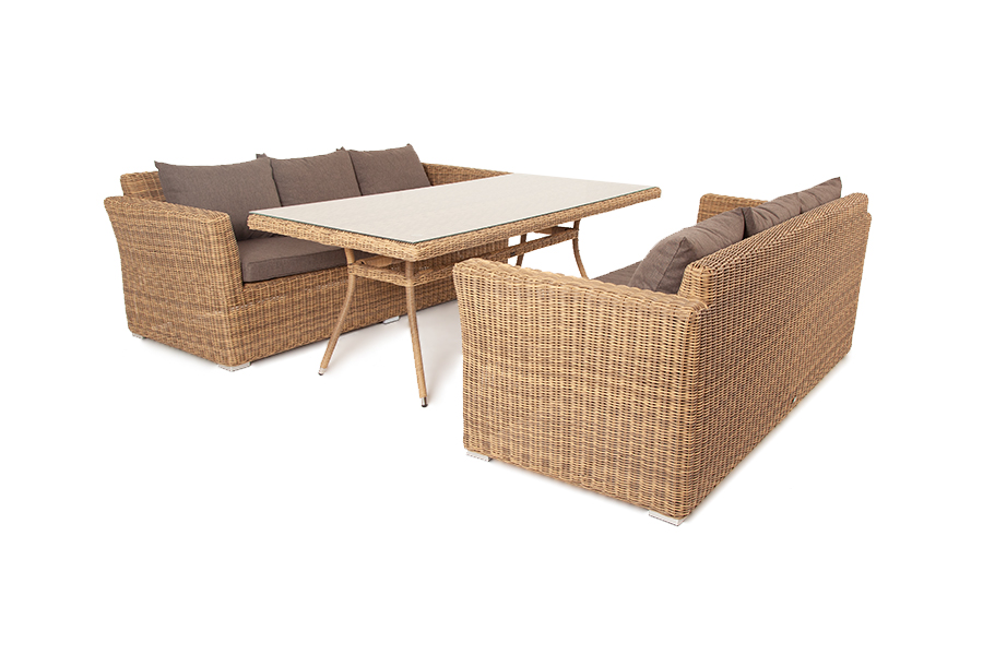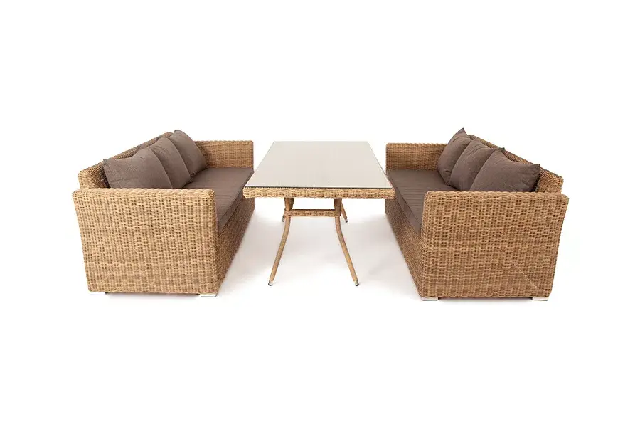 Лаконичная обеденная группа премиум-класса «Мокко Дабл» из искусственного ротанга ручного плетения натурального соломенного оттенка.