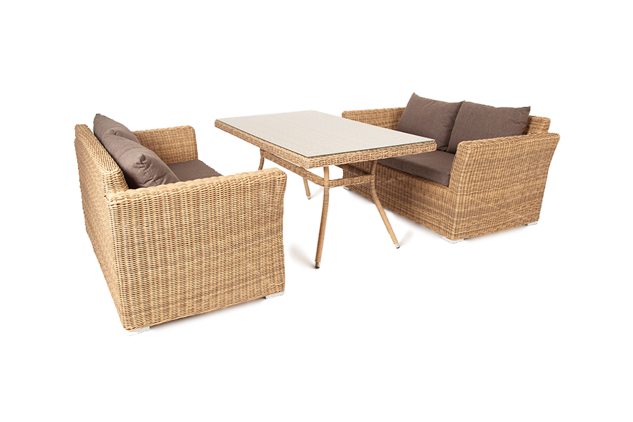 Конструкция мебели изготовлена из алюминия, вручную оплетенного синтетической лозой, имитирующей натуральный ротанг. На сидениях и спинках диванов предусмотрены подушки из полиэфирной ткани с влагоотталкивающей пропиткой и съёмными чехлами. Мебель представлена в натуральном соломенном оттенке.